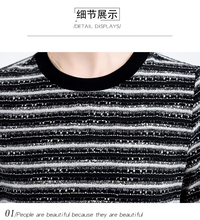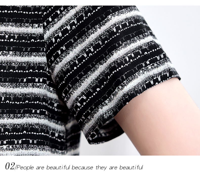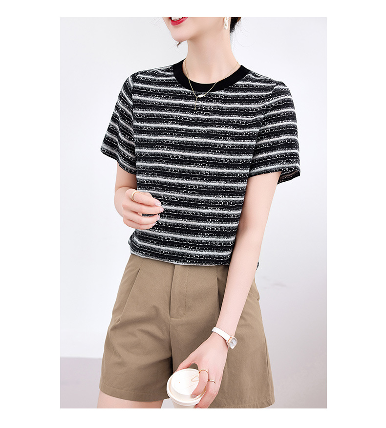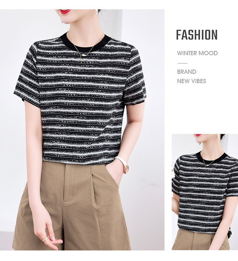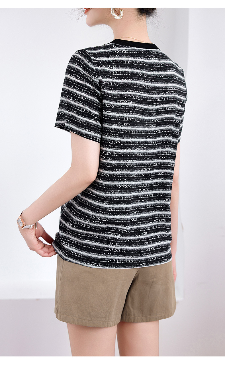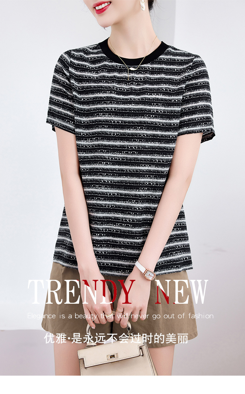 丁摩时尚高端双绉重磅真丝上衣女短袖新款桑蚕丝条纹显瘦T恤AL