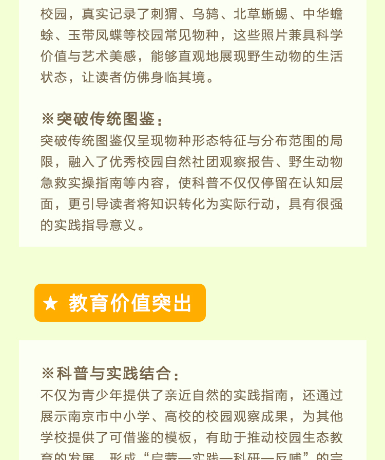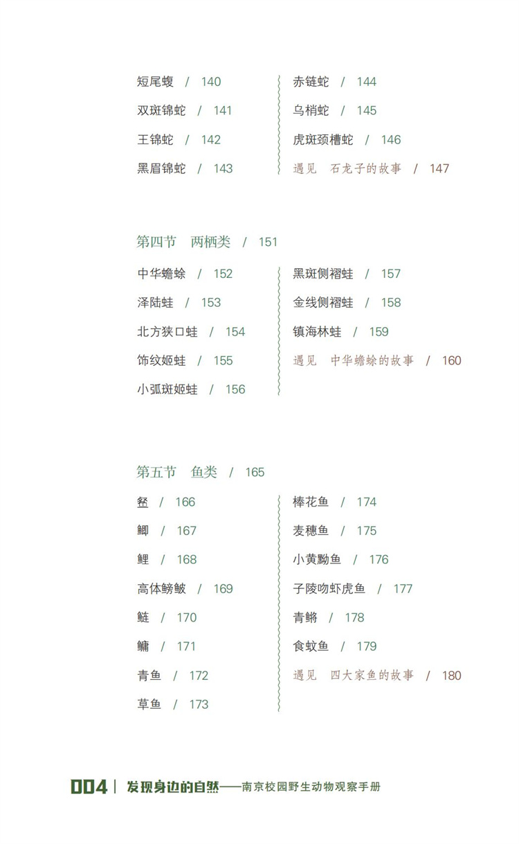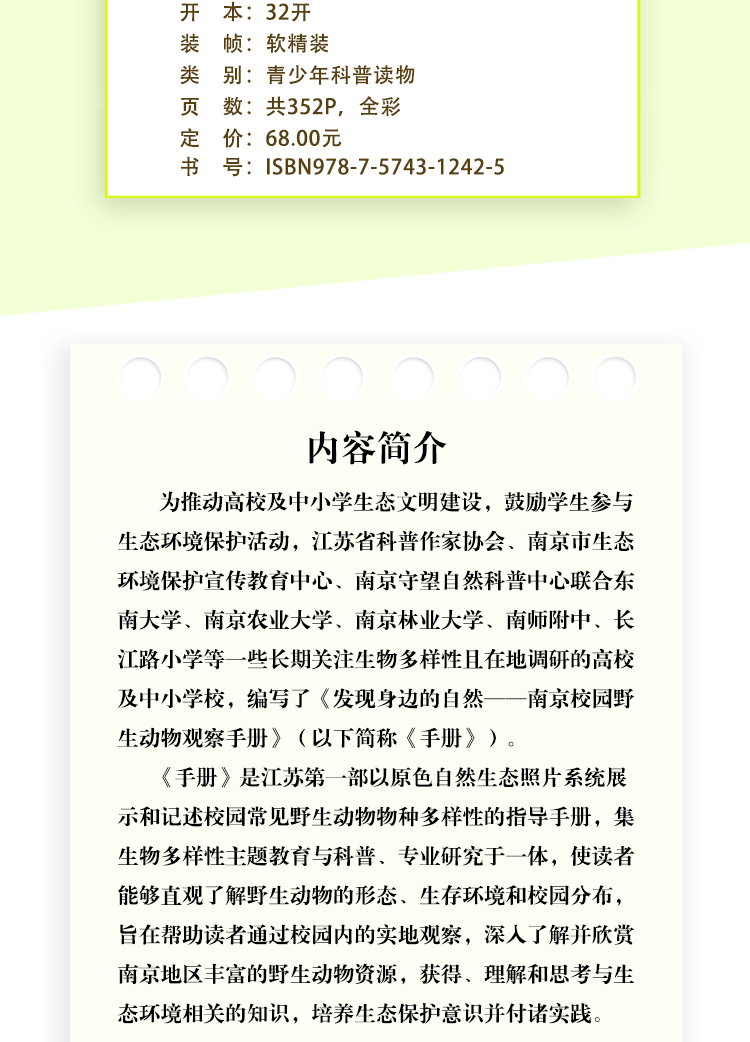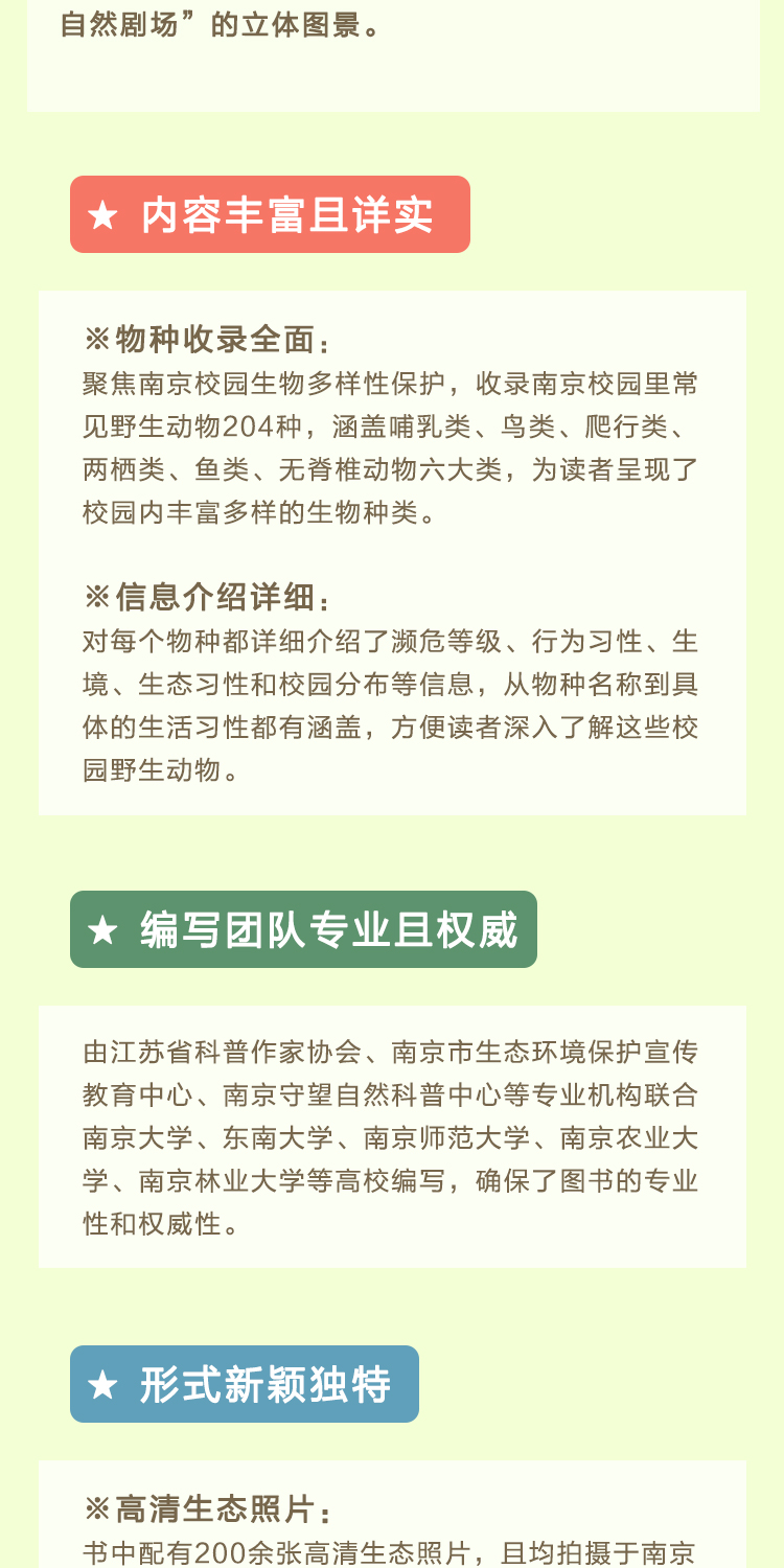 发现身边的自然 南京校园野生动物观察手册 收录了南京校园中127种脊椎动物和77种无脊椎动物的详细资料 江苏凤凰教育出版社