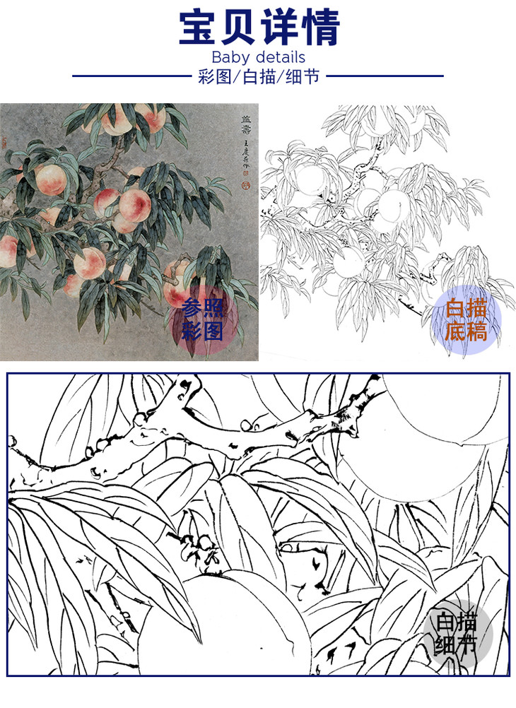工笔花鸟白描底稿-桃子-王庆升《益寿》斗方小品册页-多种白描尺寸可选-QB03