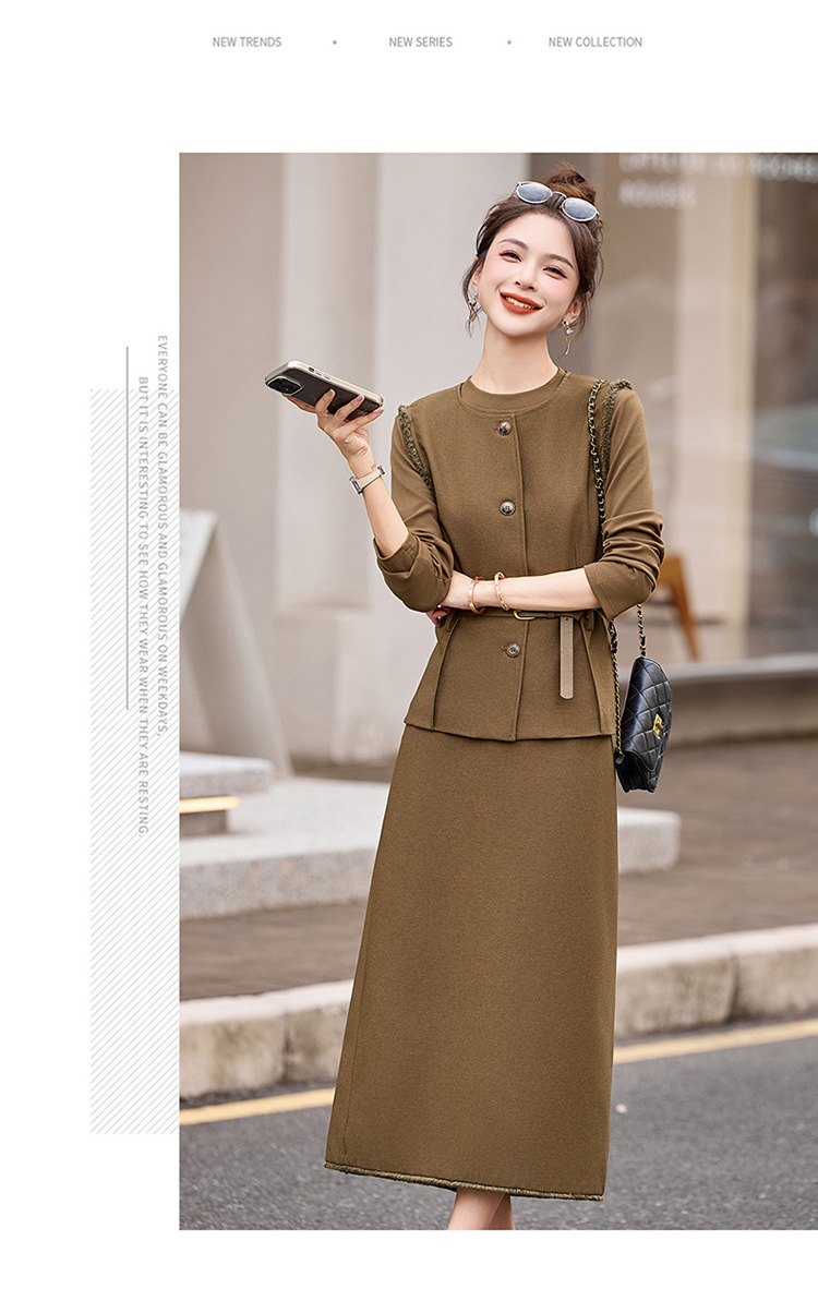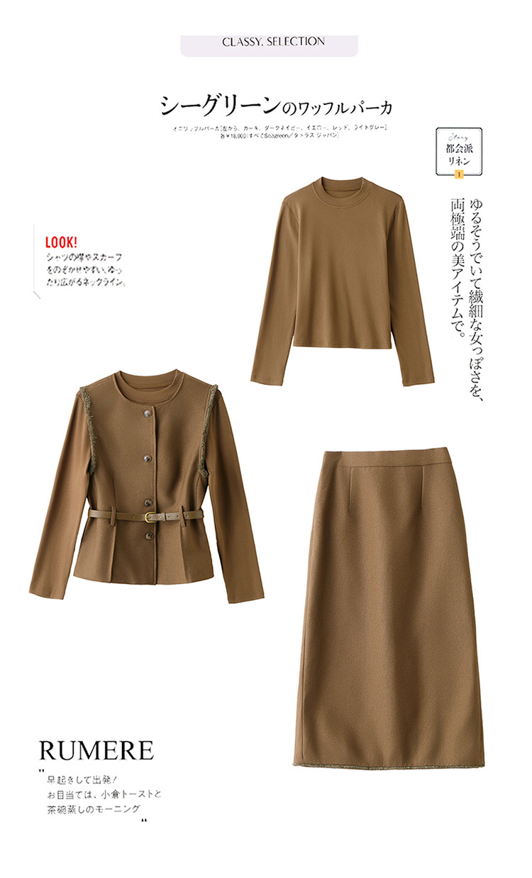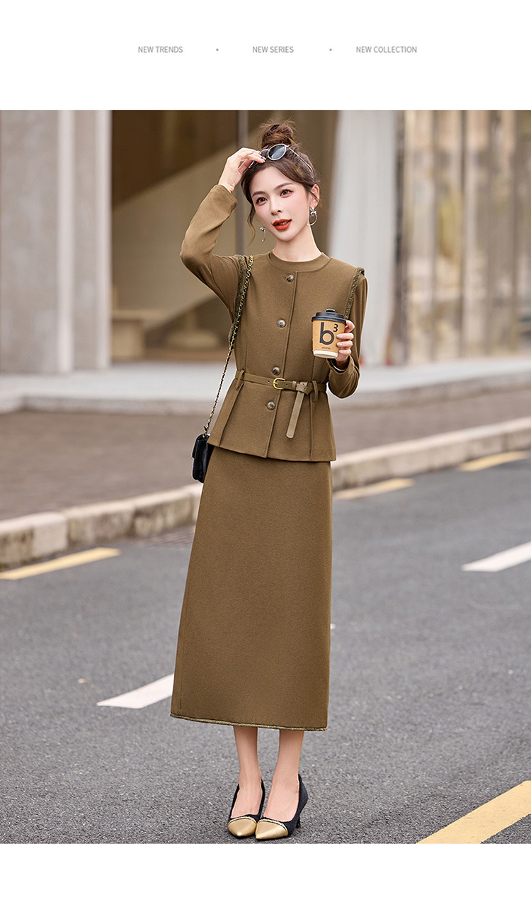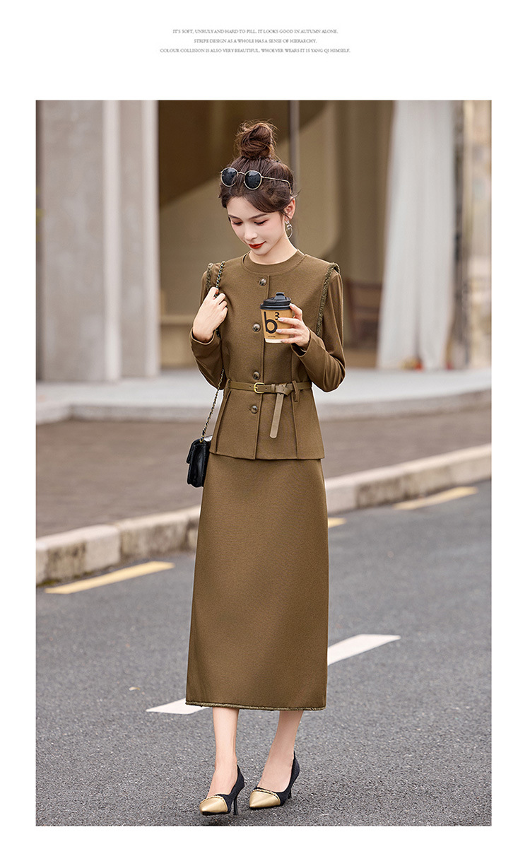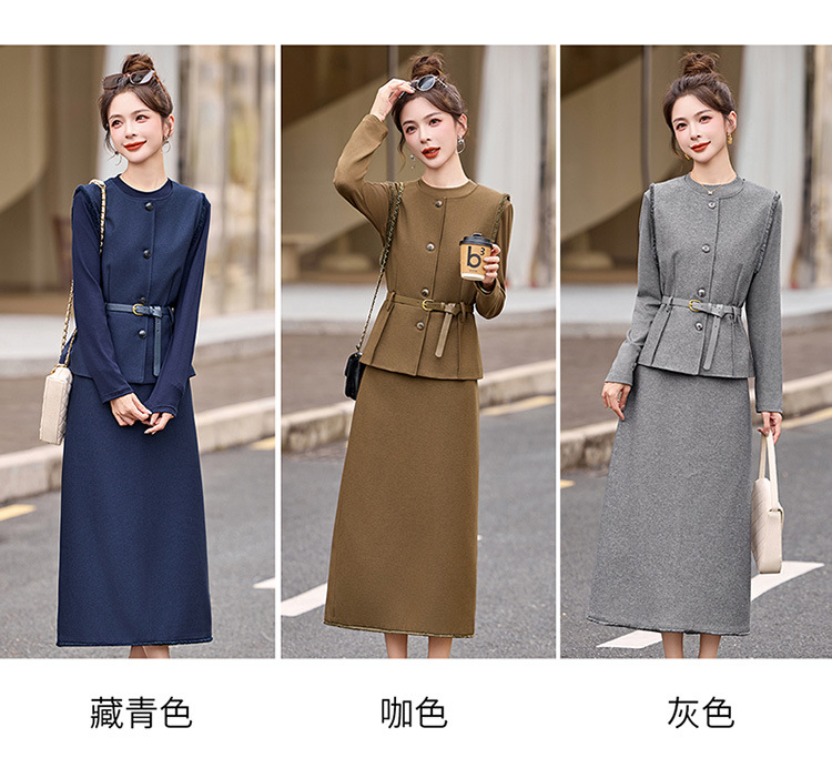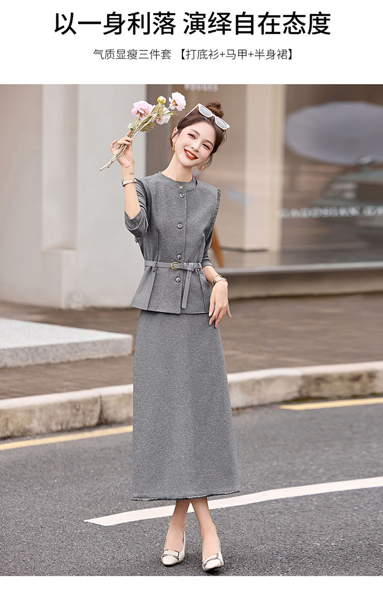 HR YBX8609韩系气质毛边马甲套装系带收腰半身裙三件套 商品图1