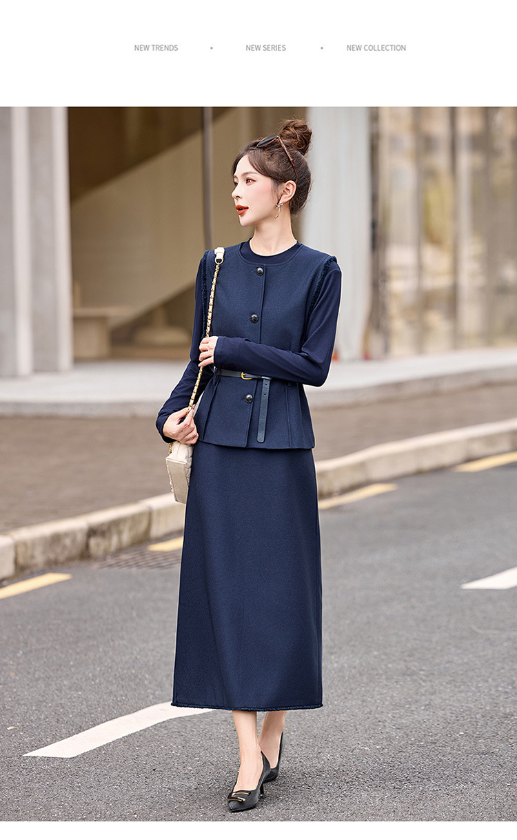 HR YBX8609韩系气质毛边马甲套装系带收腰半身裙三件套 商品图0