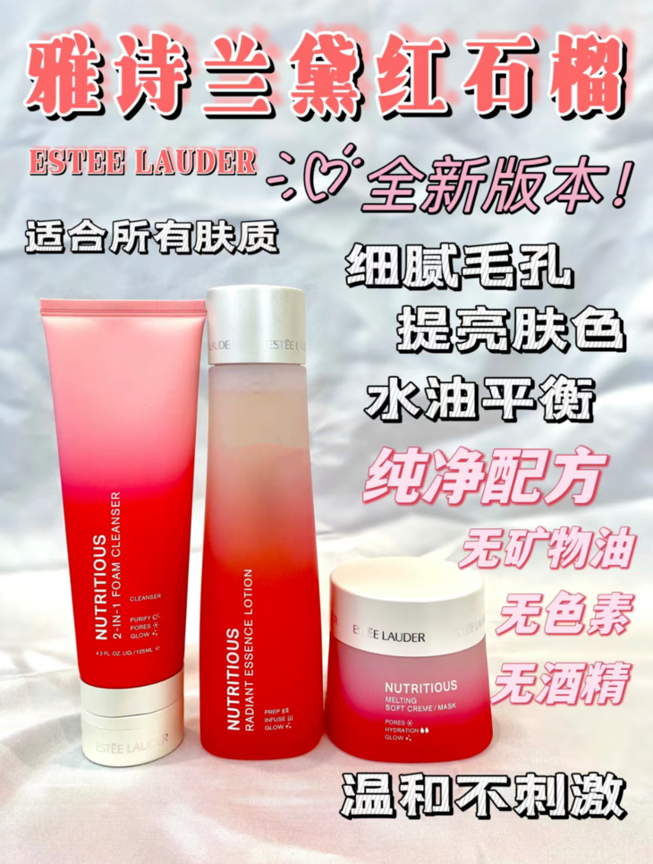 👑雅诗兰黛红石榴三件套 💥主打:补水、抗氧化、去黄提亮,美白肌肤 ✨一套搞定:暗沉、痘印、毛孔,解决80%肌肤问题 ☀️纯净配方,温和不刺激,对皮肤友好 ♻️16大无添加:无酒精、无色素、无矿物油等 ✅适合:所有肤质 【套盒包括】:洗面奶125ml+爽肤水200ml+面霜50ml