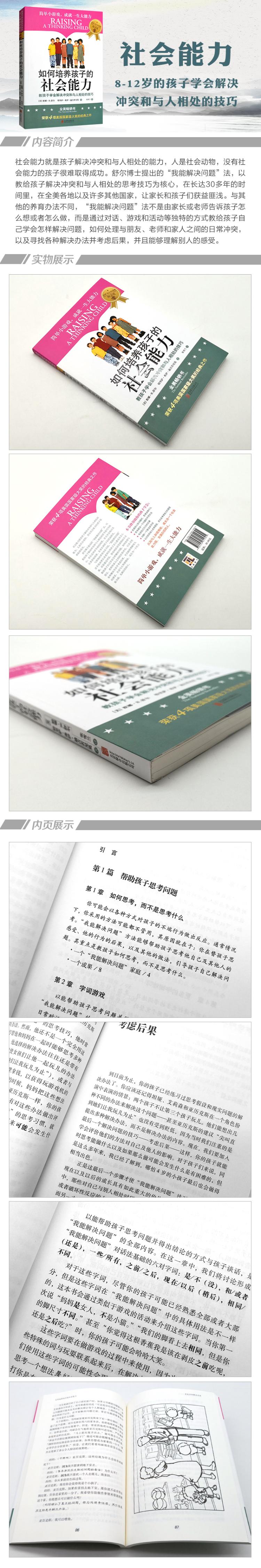 社会能力就是孩子解决冲突和与人相处的能力,人是社会动物,没有社会能力的孩子很难取得成功。舒尔博士提出的“我能解决问题”法,以教给孩子解决冲突和与人相处的思考技巧为核心,在长达30多年的时间里,在全美各地以及许多其他国家,让家长和孩子们获益匪浅。与其他的养育办法不同,“我能解决问题”法不是由家长或老师告诉孩子怎么想或者怎么做,而是通过对话、游戏和活动等独特的方式教给孩子自己学会怎样解决问题,如何处理与朋友、老师和家人之间的日常冲突,以及寻找各种解决办法并考虑后果,并且能够理解别人的感受。