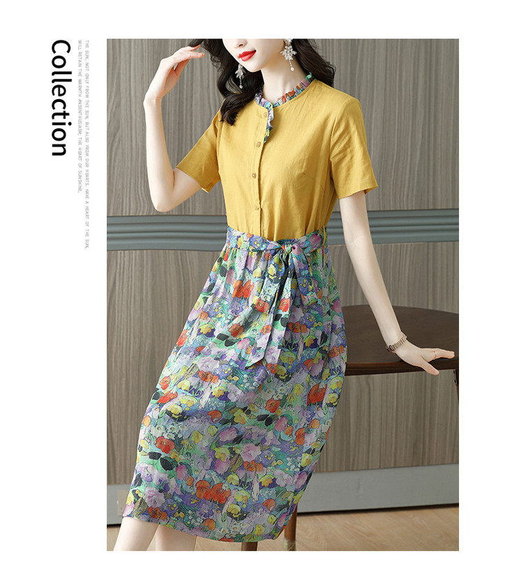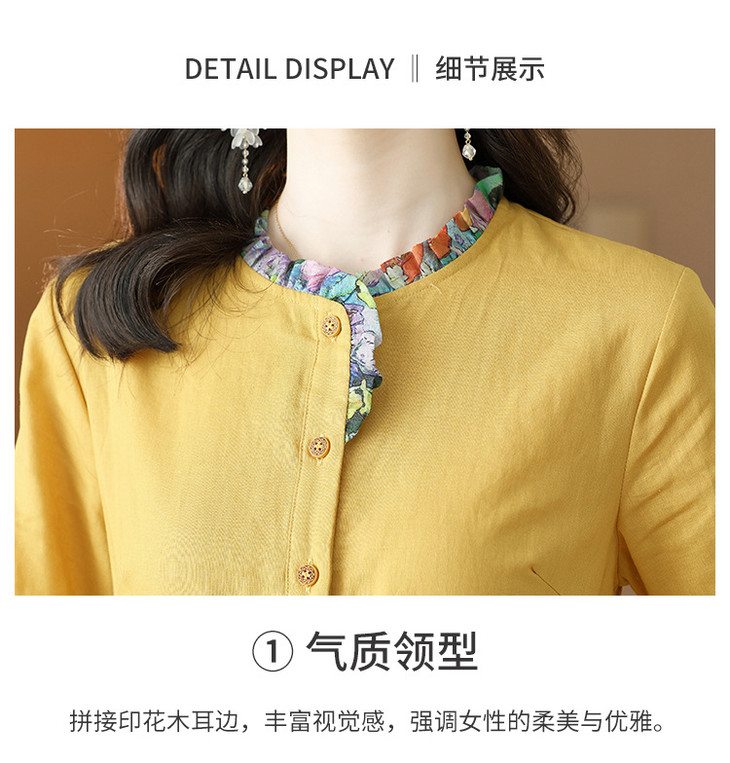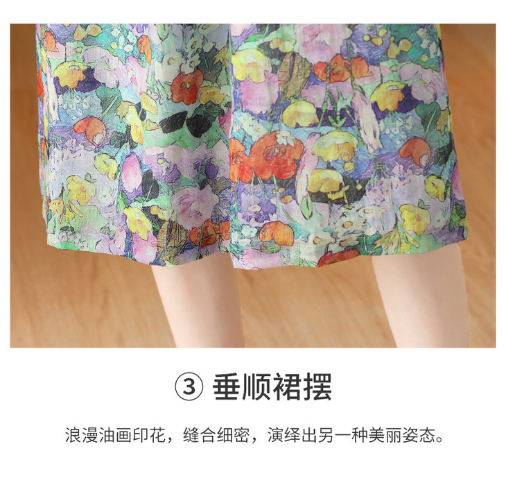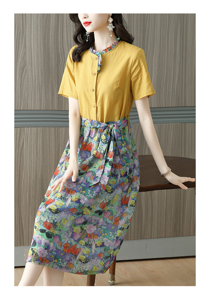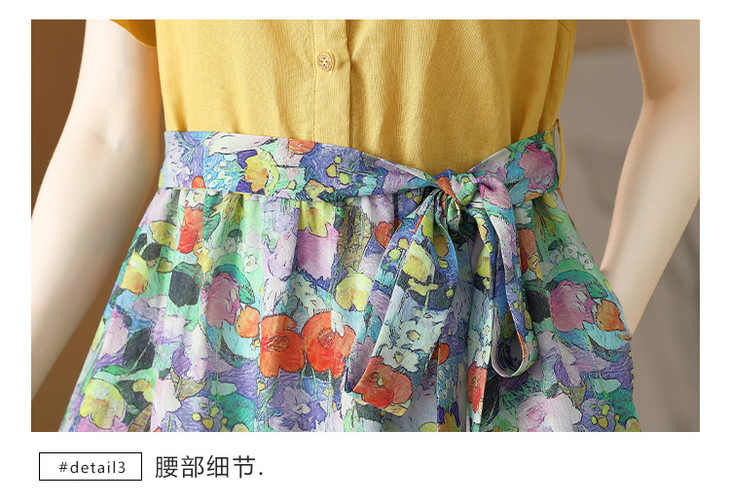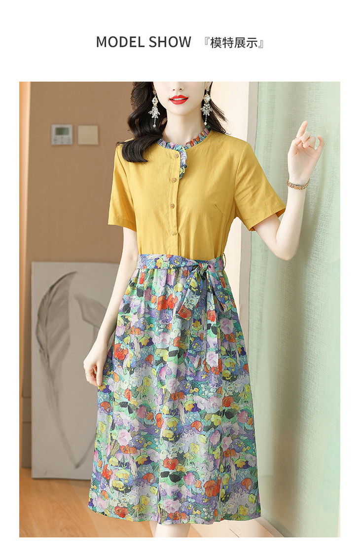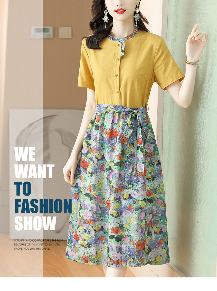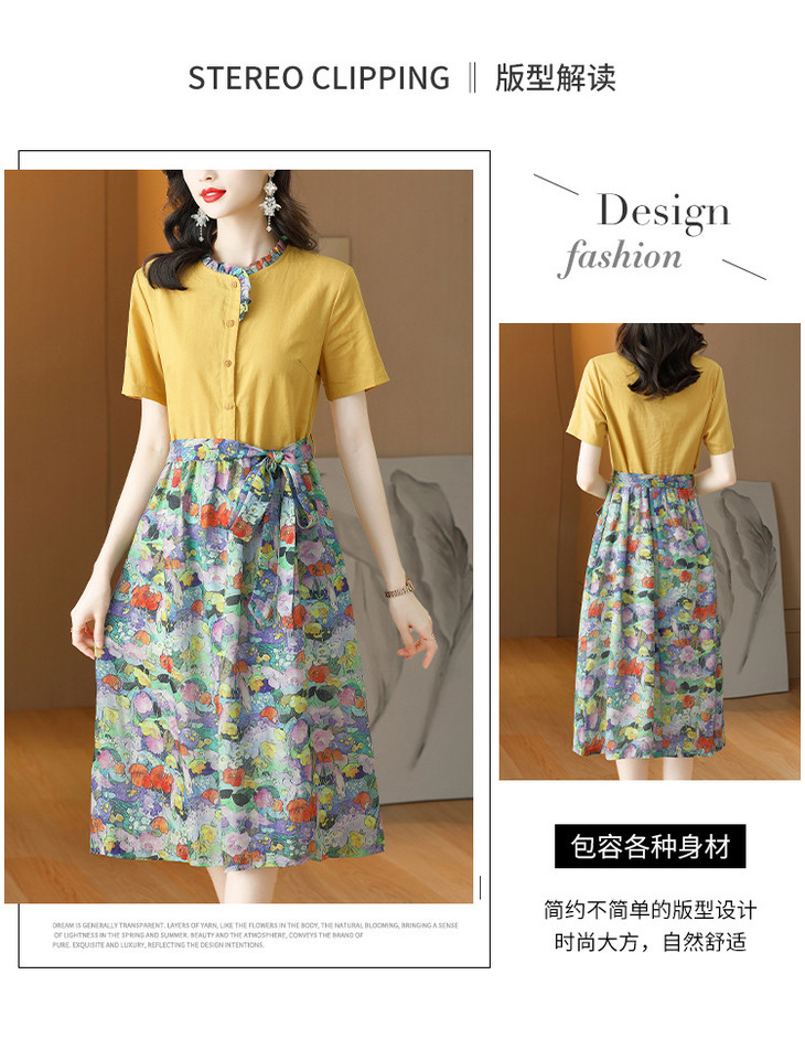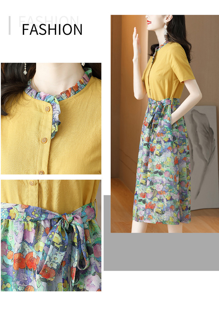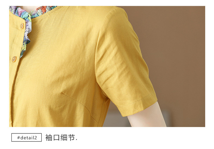 AHM-xxnz6036时尚优雅减龄木耳边裙子棉麻拼接碎花连衣裙