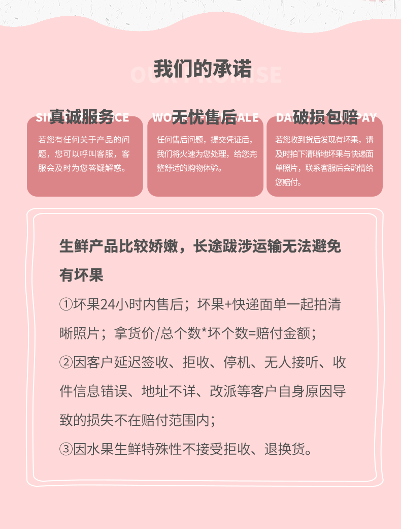 品名:新疆香妃海棠果 规格1:3斤大果礼盒装(单果35~50g;整箱约30~43枚) 规格2:4斤大果礼盒装(单果35~50g;整箱约40~58枚) 规格3:4斤特大果礼盒装(单果50g+;整箱约30~36枚)数量仅供参考,以实际重量为准;拍几份发几个包裹,不一定能同时到达,请耐心等待; 发货地/产地:四川成都/河北/新疆 包装方式:礼盒+保鲜盒 物流信息:默认顺丰快递,不支持指定快递 发货区域:西藏、新疆、内蒙、黑龙江、吉林、辽宁不发货; 物流详情:周六、周日及节假日除外,正常48小时内发货,到货时间约为2~5天,请耐心等待 售后说明:收到货后有质量问题,在24小时内都可以拍照(坏品+快递单面箱子一起拍)上传,申请按坏品比例理赔或联系客服,生鲜性质特殊,因地址错误,手机号联系不上,拒收等造成的损失无法售后,请理解; |
