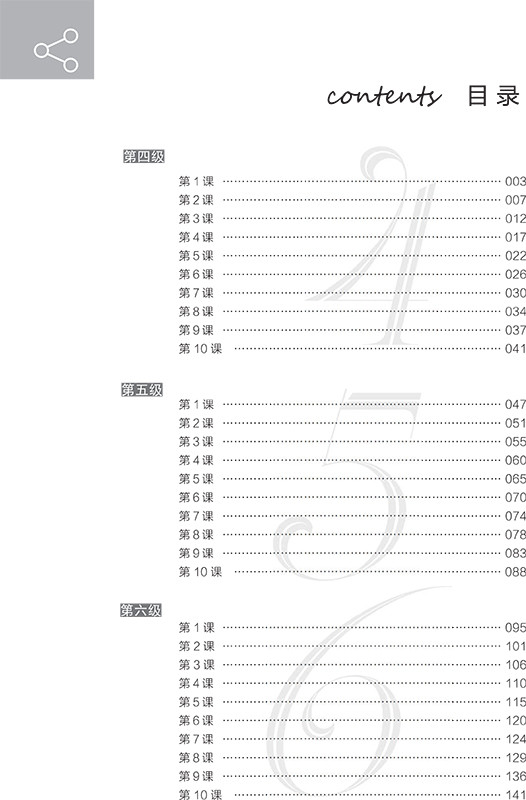 《视唱练耳与乐理考级教程》(4-6级)是西安音乐学院社会考级视唱练耳教程考级系列丛书之中级部分。该书每个级别各有10课,共30课。每课均有“乐理部分”和“视唱练耳部分”两个板块,其中乐理部分包括理论知识的讲解与练习题,含各类基本乐理知识;视唱练耳部分则涉及了模唱、听唱、节奏、视唱等训练,力图从多个训练角度来培养学生对视唱练耳学科的认知、掌握、通晓等能力。该书难度适宜、编排合理、内容丰富,学生通过系统的学习,其音乐理论和视唱练耳方面能力将得到全面提升。该书可以用于西安音乐学院社会音乐考级使用,还可作为业余音乐爱好者学习视唱练耳及乐理的必备教材。