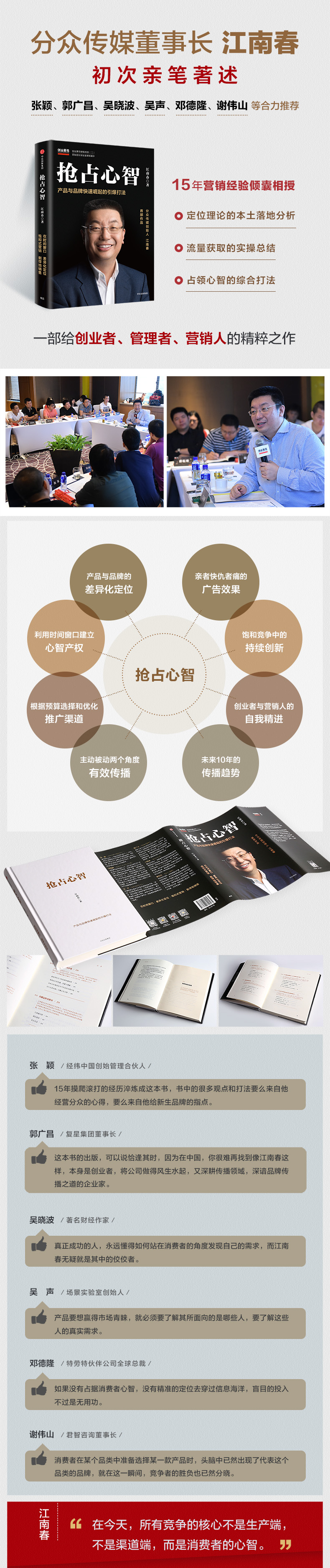 很多人将分众的成功归结于占领了一个入口,却忽视了江南春自带的营销能力,15年来,他将众多品牌植入到消费者的心智中。在信息粉尘时代,这本书的出版,可以说恰逢其时,因为在中国,你很难再找到像江南春这样,本身是创业者,将公司做得风生水起,又深耕传播领域,深谙品牌传播之道的企业家。