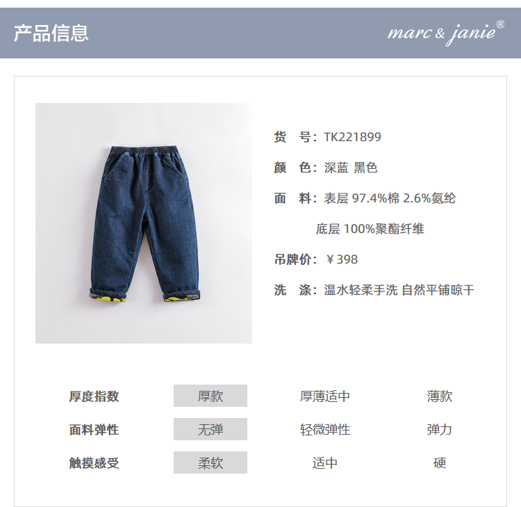 马克珍妮秋冬新款 男童加绒直筒牛仔裤 儿童裤子221899