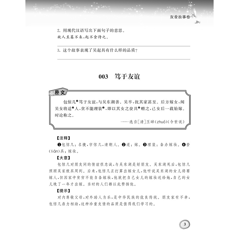 书稿精选我国的古代人物的诚信故事,对重难点词句用现代汉语解释,辅助学生阅读。原文翻译以直译为主,语言活泼,浅显易懂。注重语感培养,简单的文言知识积累,以及阅读能力的培养。适合小学中、高年级学生课外阅读使用。