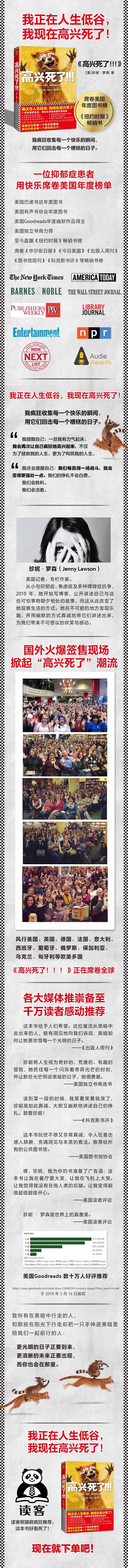 我正在人生低谷,我现在高兴死了!一位抑郁症患者将自己的故事写成《高兴死了!!!》,用快乐席卷美国年度榜单!揽下美国亚马逊年度图书、美国巴诺书店年度图书、美国有声书协会年度图书等,盘踞《纽约时报》畅销书榜近半年!风行美国、英国、德国、法国、意大利、西班牙、葡萄牙、俄罗斯、保加利亚、匈牙利等欧美多国。鼓舞千千万万读者。我疯狂收集每一个快乐的瞬间,用它们回击每一个糟糕的日子。