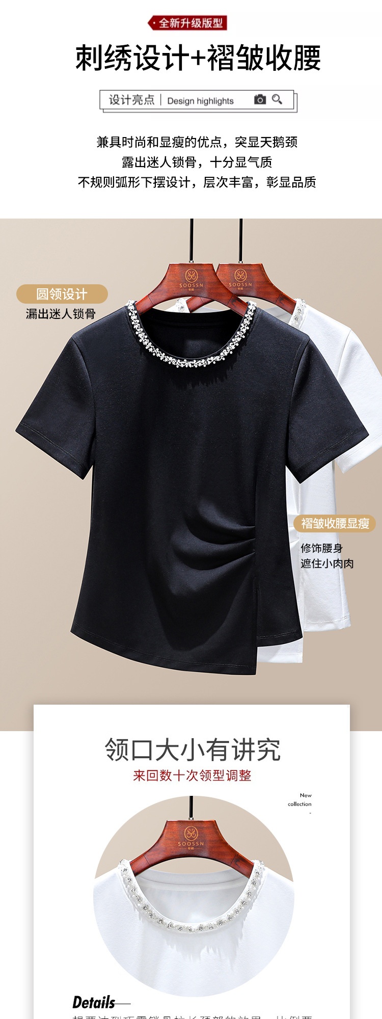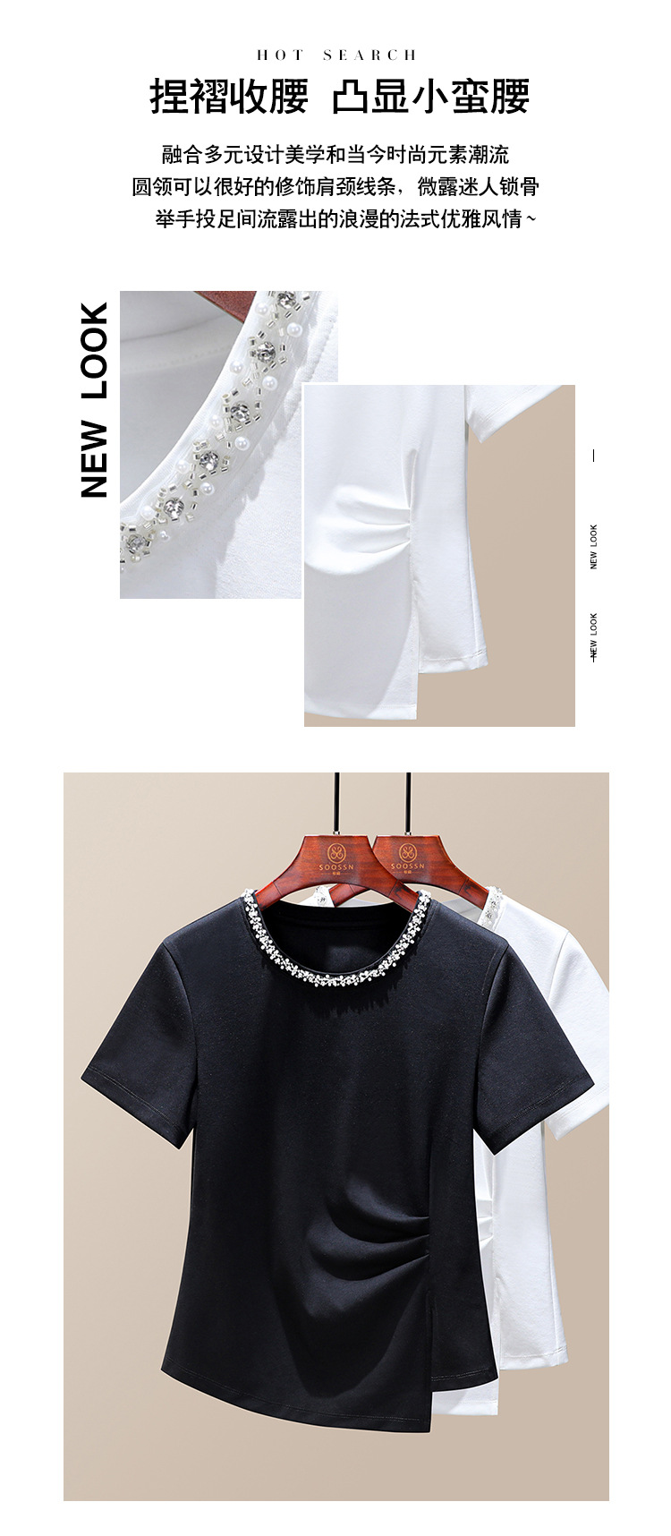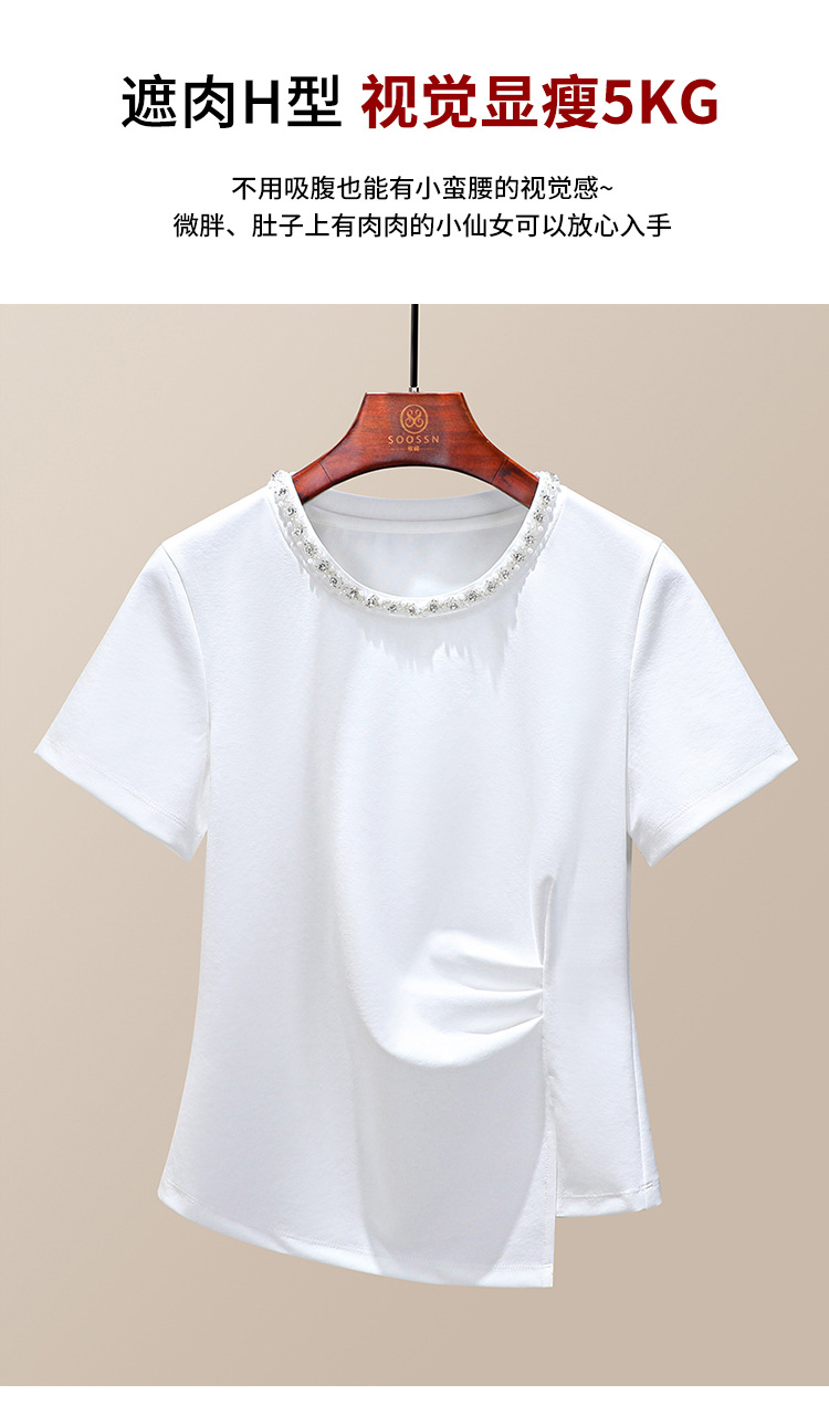 「自」全新升级【铂金会员109/天猫149/差价40】(74018)洛诗琳设计感压褶T恤2025夏季新款钉珠不规则下摆短袖上衣女