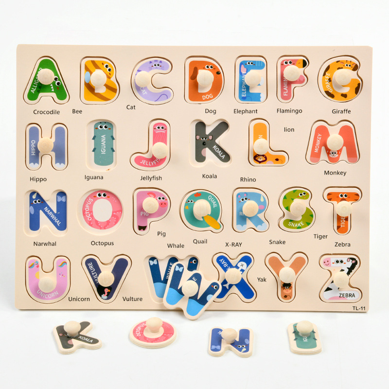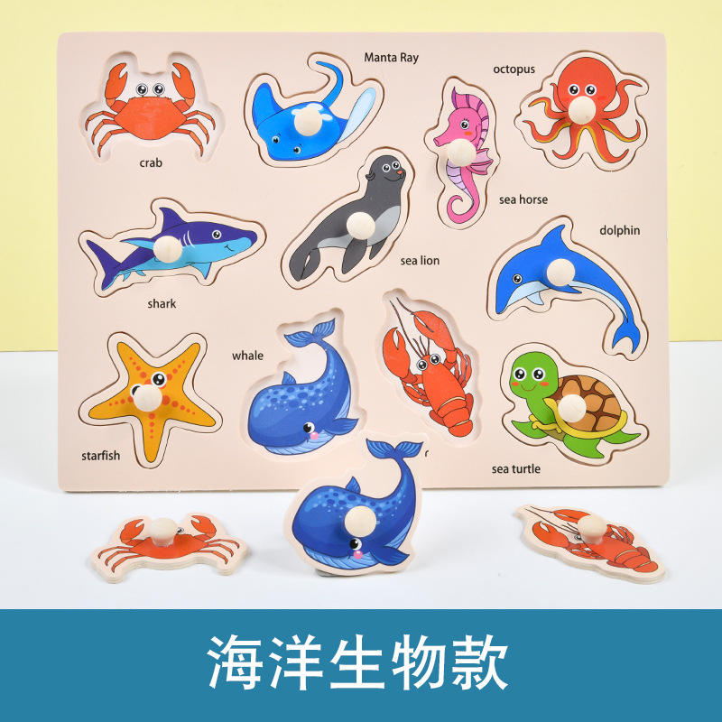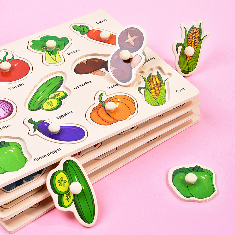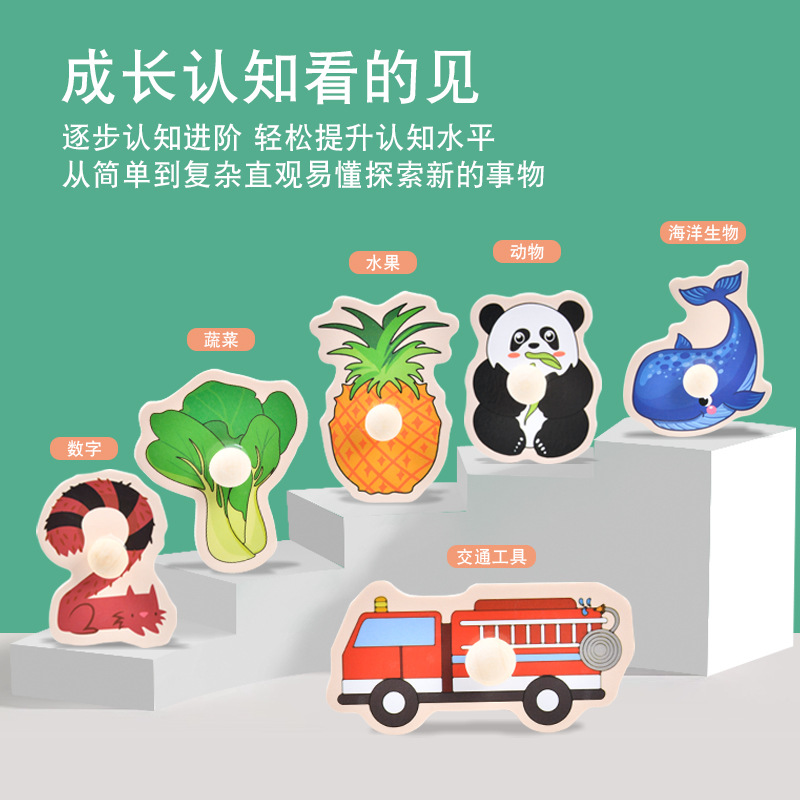 【寓教于乐,动手动脑,以学为乐!】木制儿童手抓板 早教开发 智力抓板 数字字母水果 动物蔬菜拼图拼板-QB