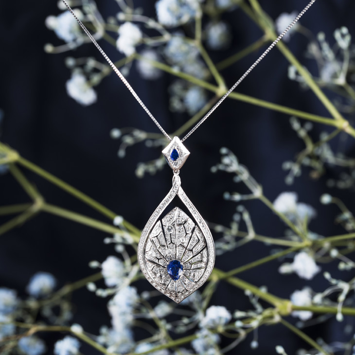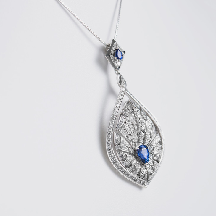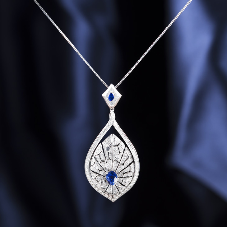 水滴形的蓝宝石与六角蜂巢结构散开的羽毛外圈的细碎蓝宝相呼应,形成无与伦比的轻盈浪漫之风格。