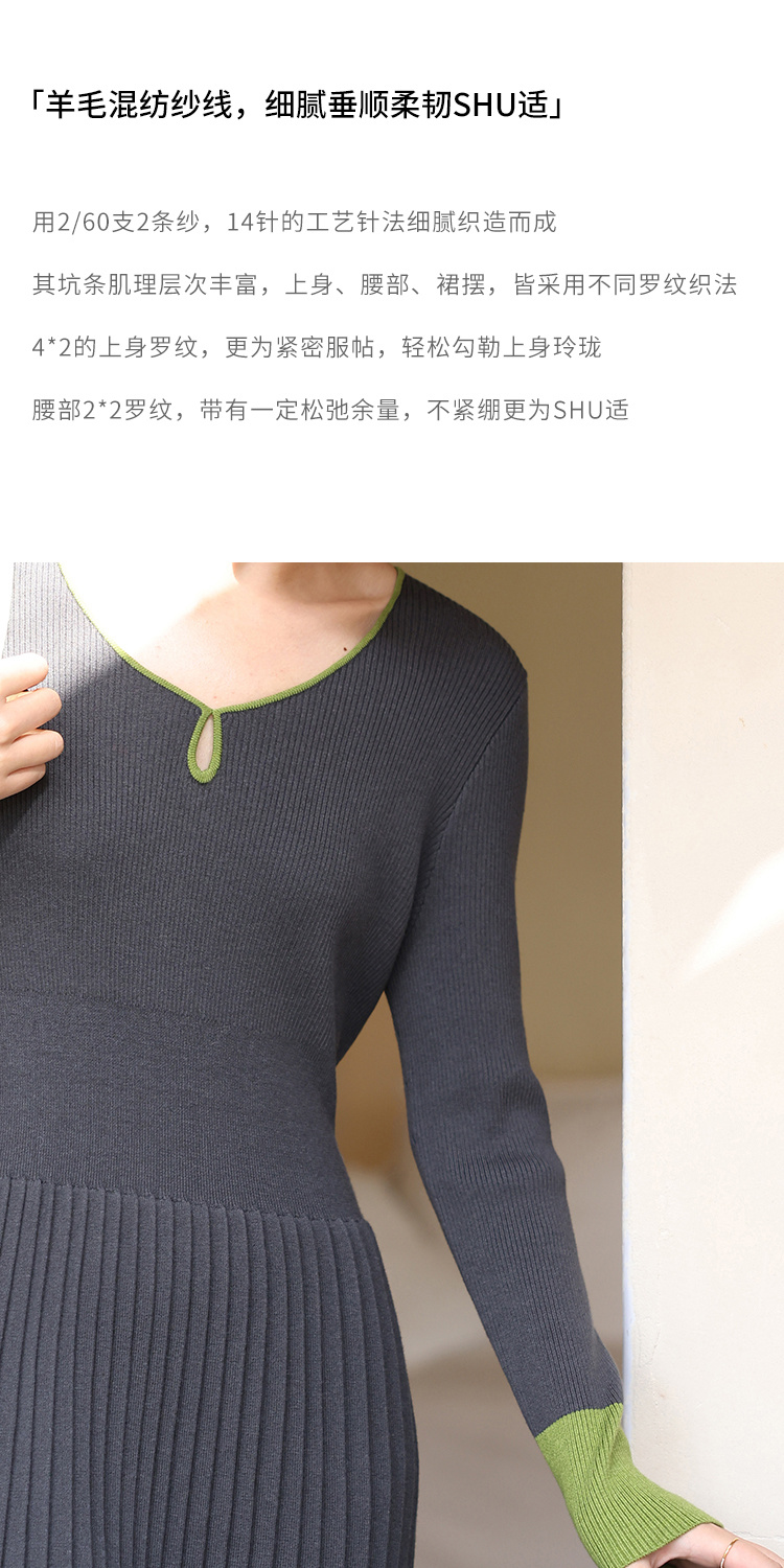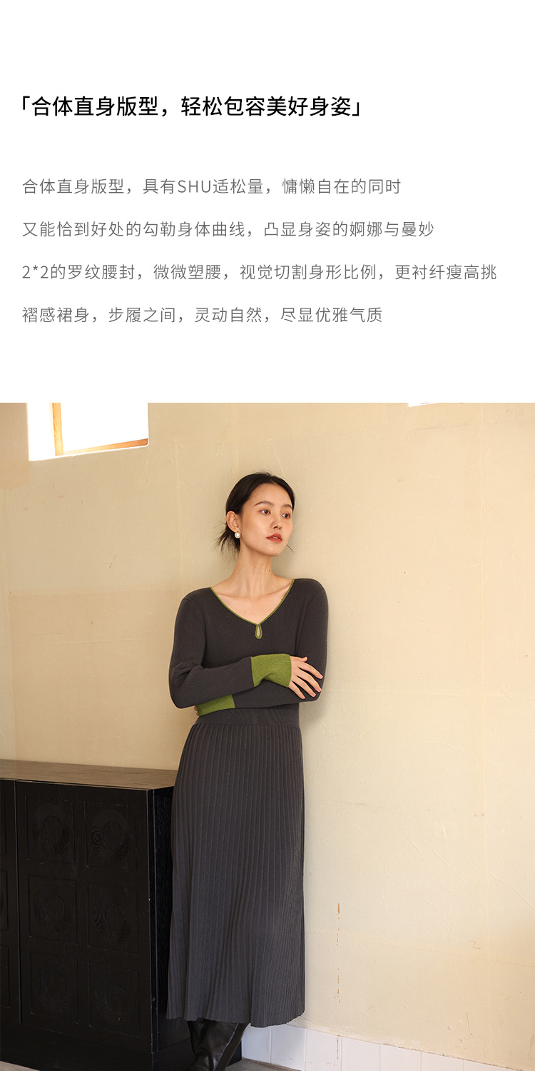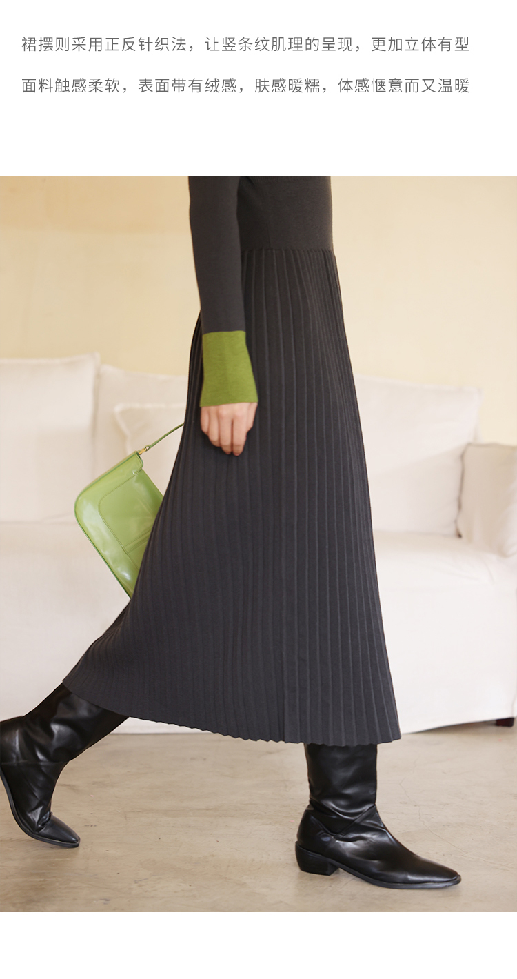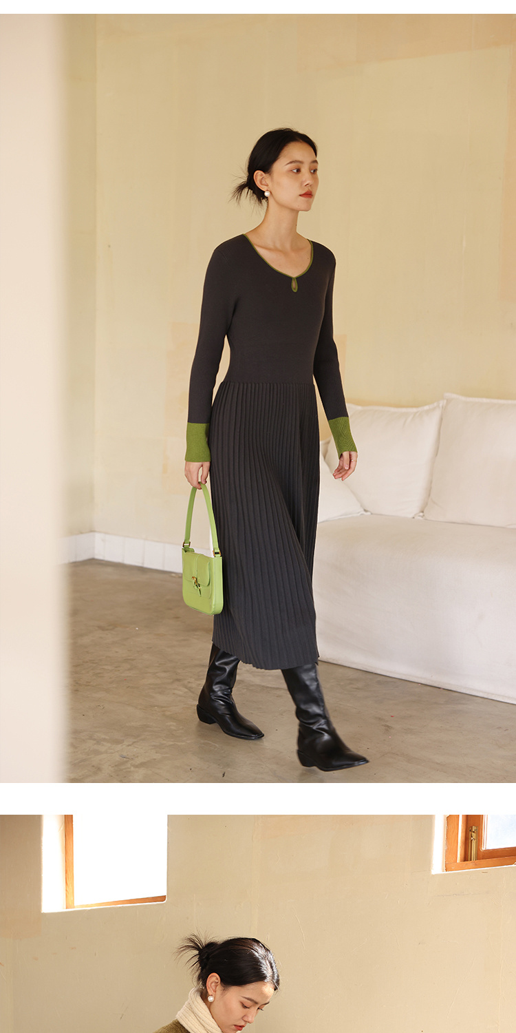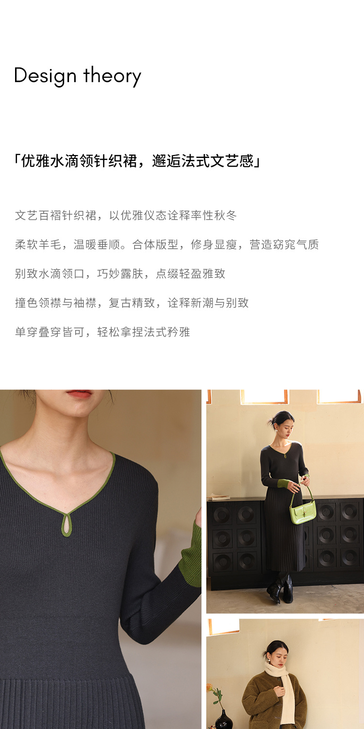 HeyDress水滴领针织羊毛连衣裙女秋冬法式复古收腰a字百褶长裙子