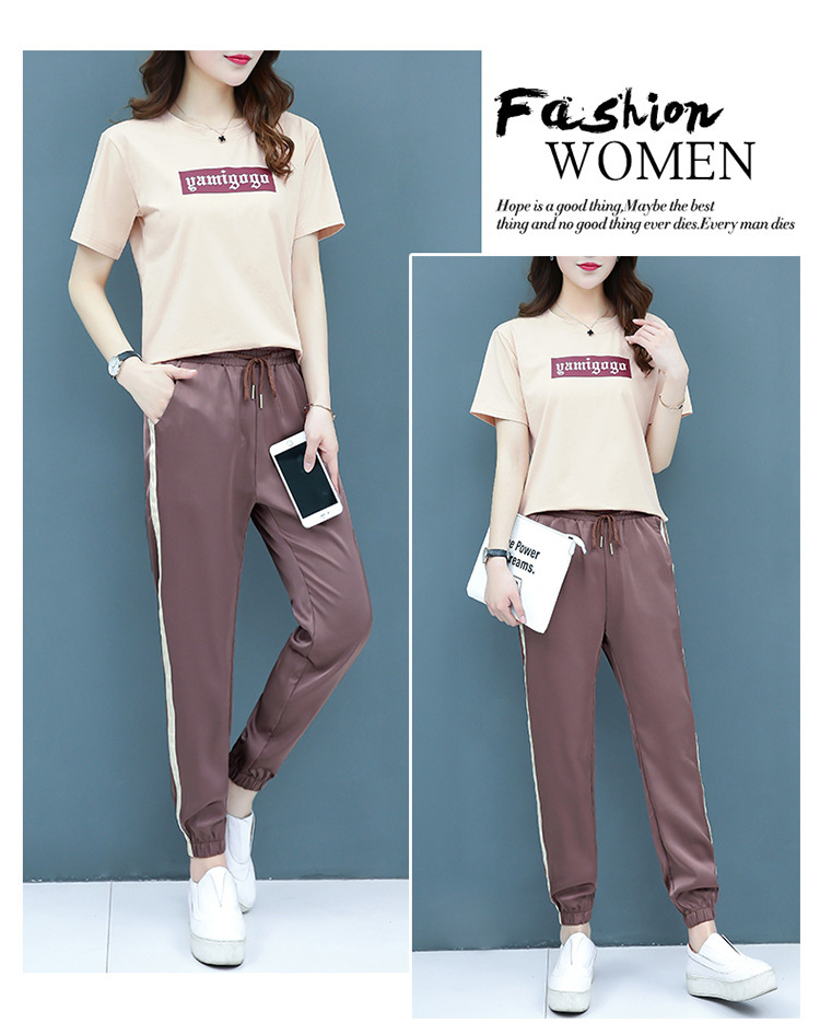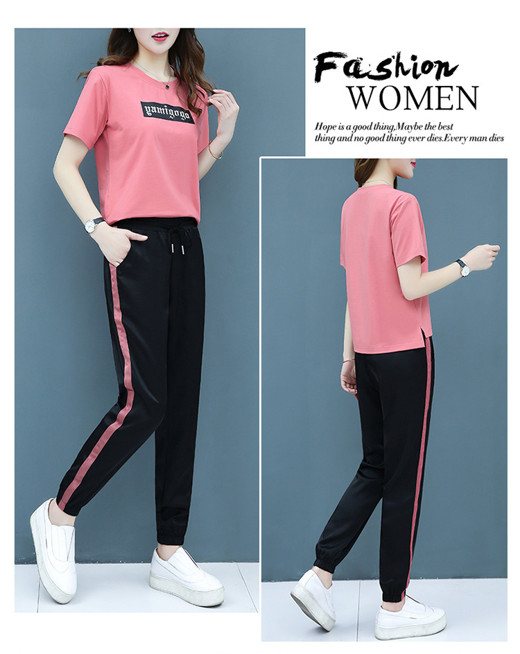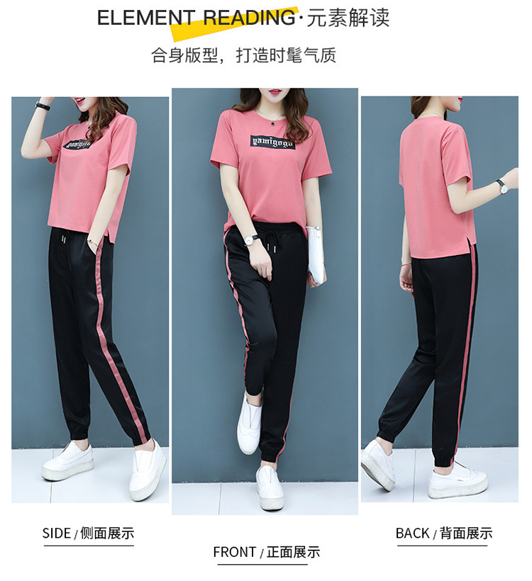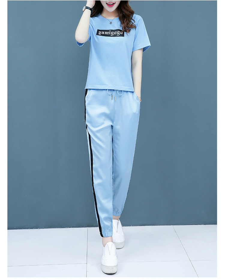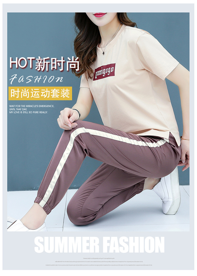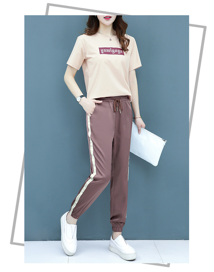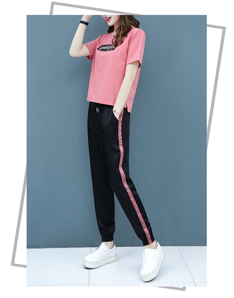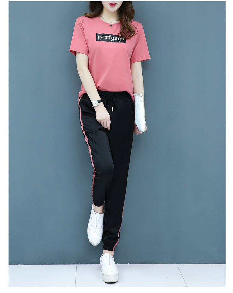 图荣夏季款女生短袖休闲套装韩版时尚字母印花束脚长裤运动两件套