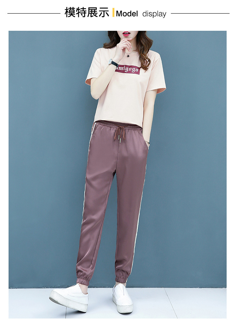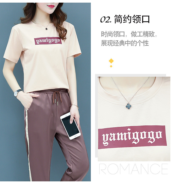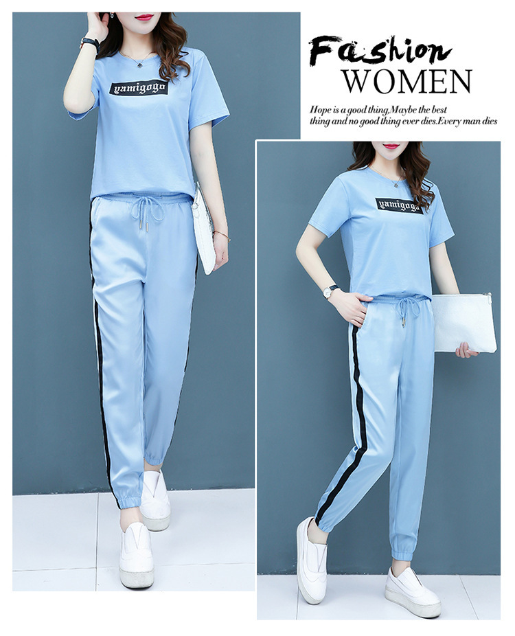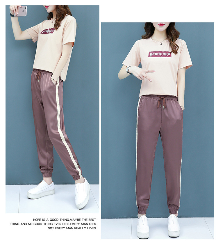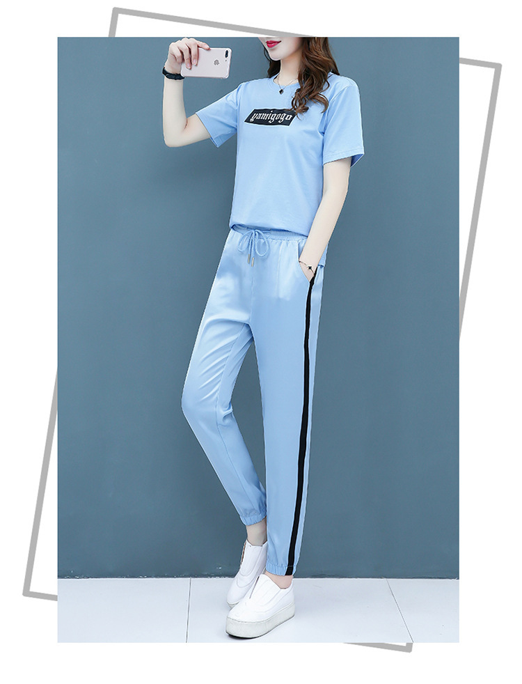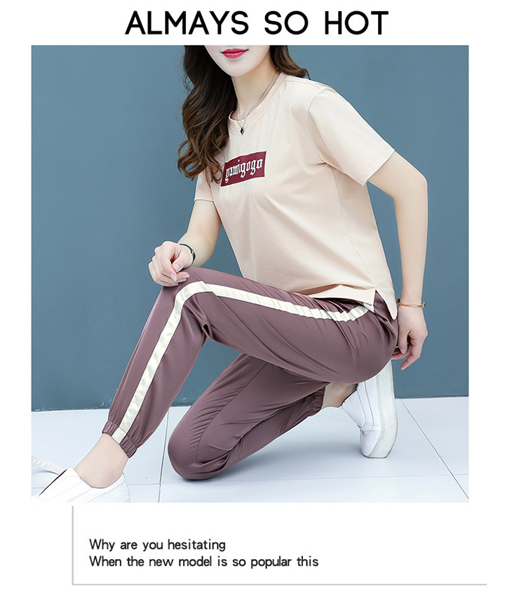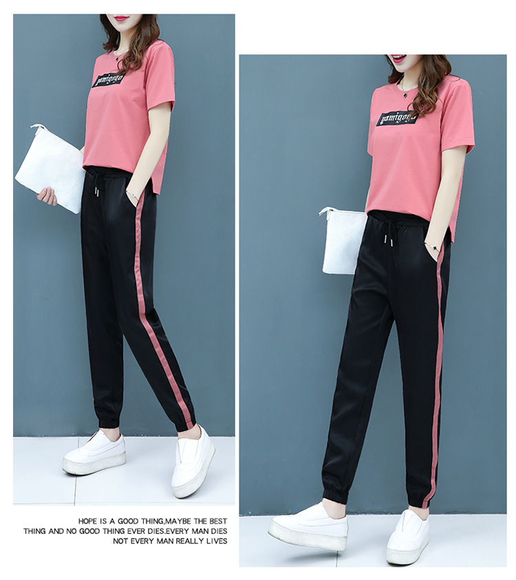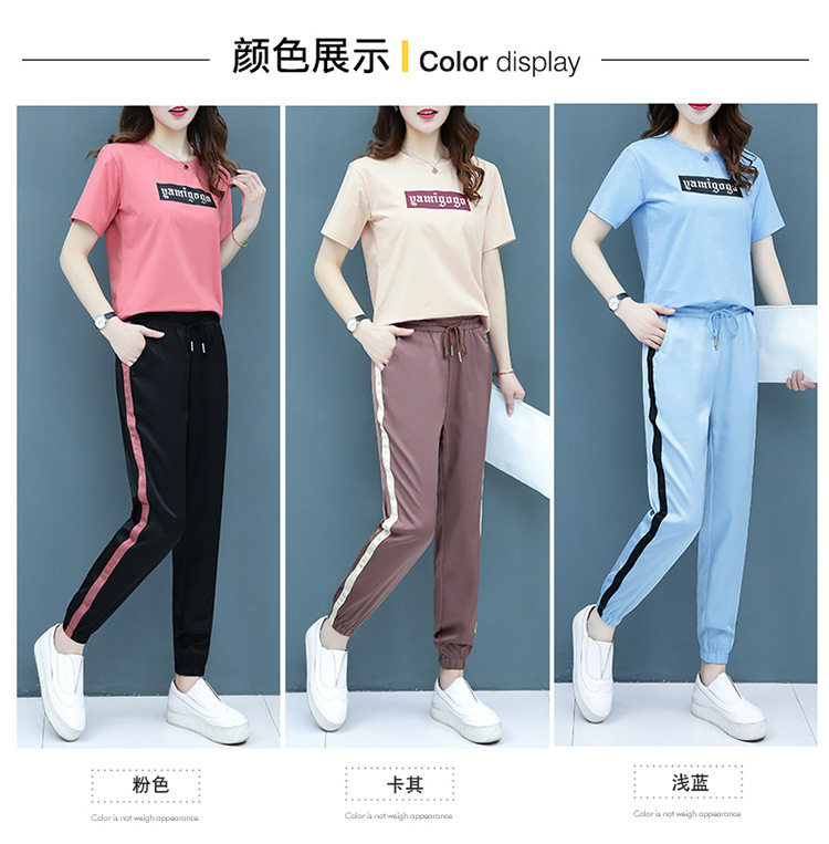 图荣夏季款女生短袖休闲套装韩版时尚字母印花束脚长裤运动两件套