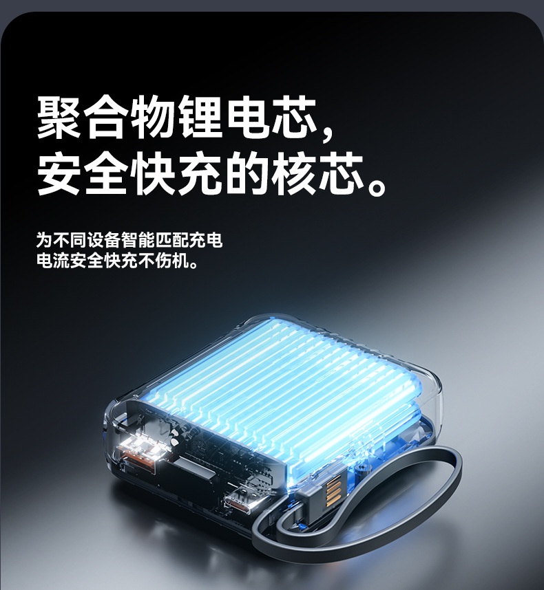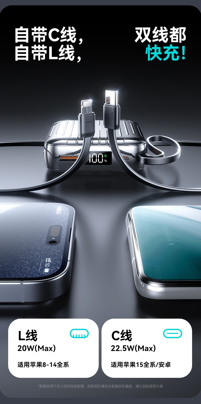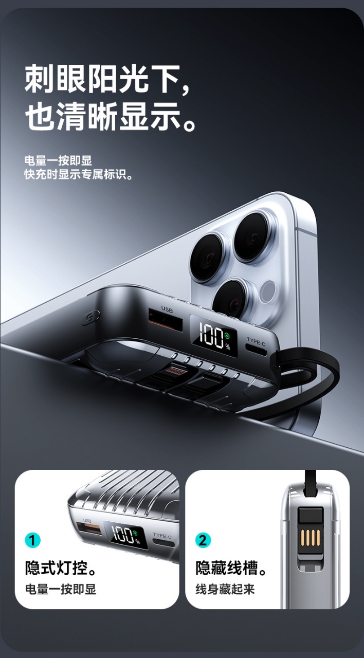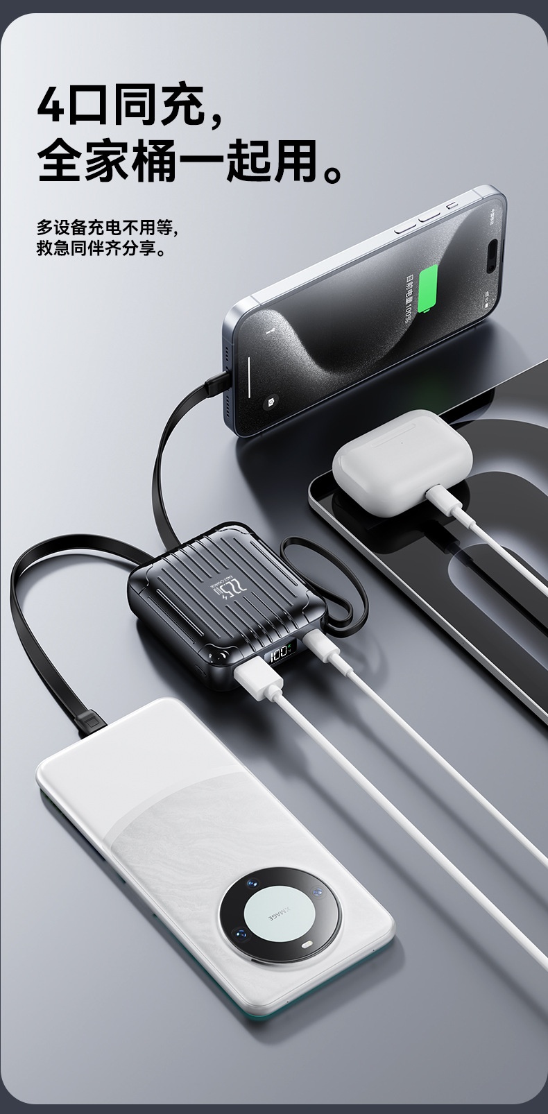 ✅自带Type-C+Lightning+usb三线,外出无需再带其它充电线