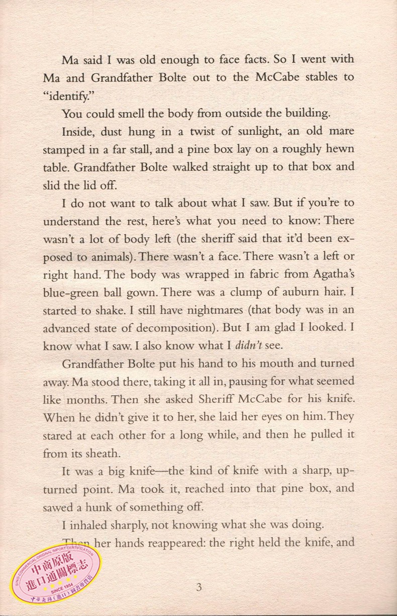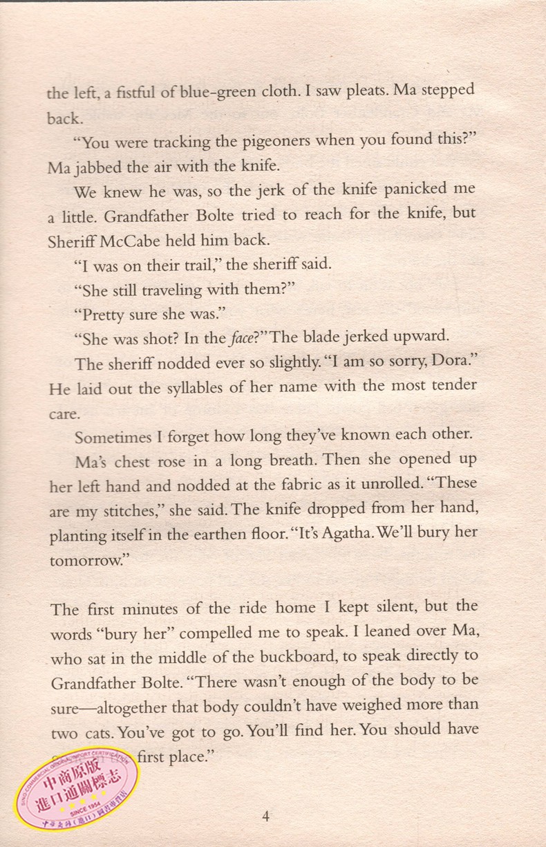 In the town of Placid, Wisconsin, in 1871, Georgie Burkhardt is known for two things: her uncanny aim with a rifle and her habit of speaking her mind plainly.But when Georgie blurts out something she shouldn't, her older sister Agatha flees, running off with a pack of "pigeoners" trailing the passenger pigeon migration. And when the sheriff returns to town with an unidentifiable body—wearing Agatha's blue-green ball gown—everyone assumes the worst. Except Georgie. Refusing to believe the facts that are laid down (and coffined) before her, Georgie sets out on a journey to find her sister. She will track every last clue and shred of evidence to bring Agatha home. Yet even with resolute determination and her trusty Springfield single-shot, Georgie is not prepared for what she faces on the western frontier.