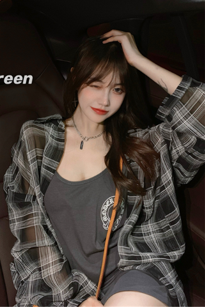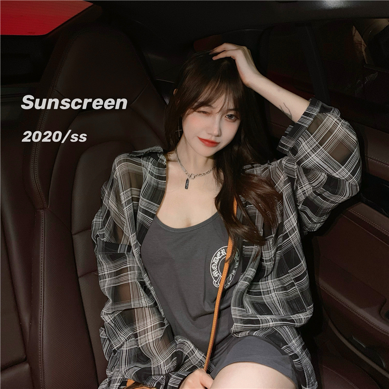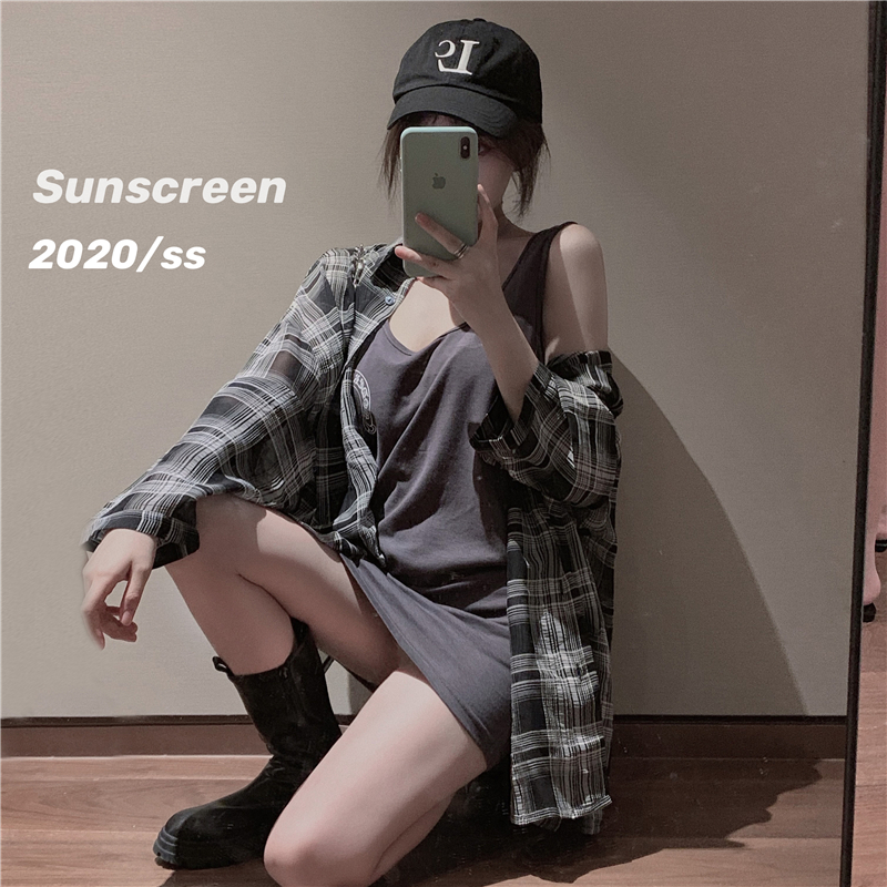 【防晒裙套装】chic风轻薄透气防晒格子衬衣女2021夏季新款防晒衣连衣裙吊带裙
