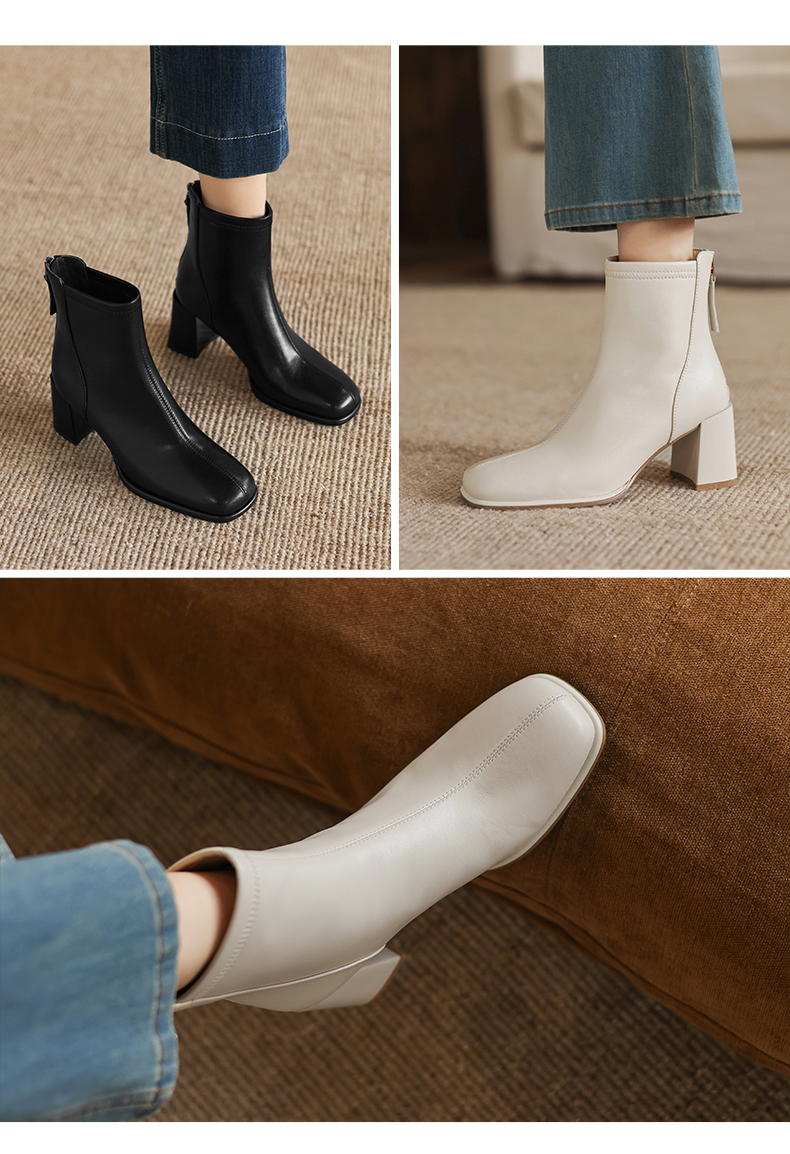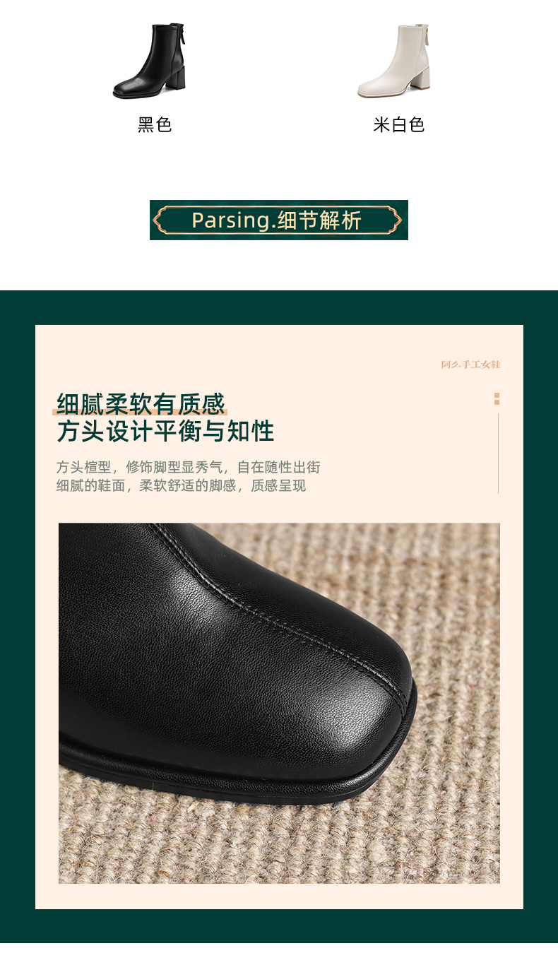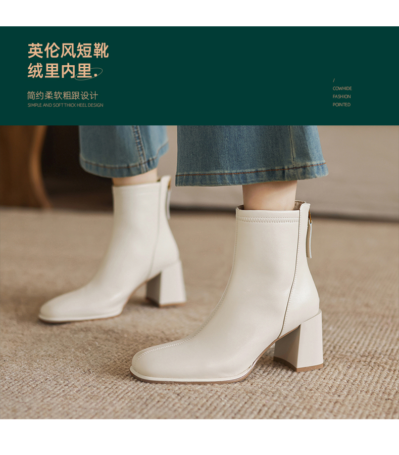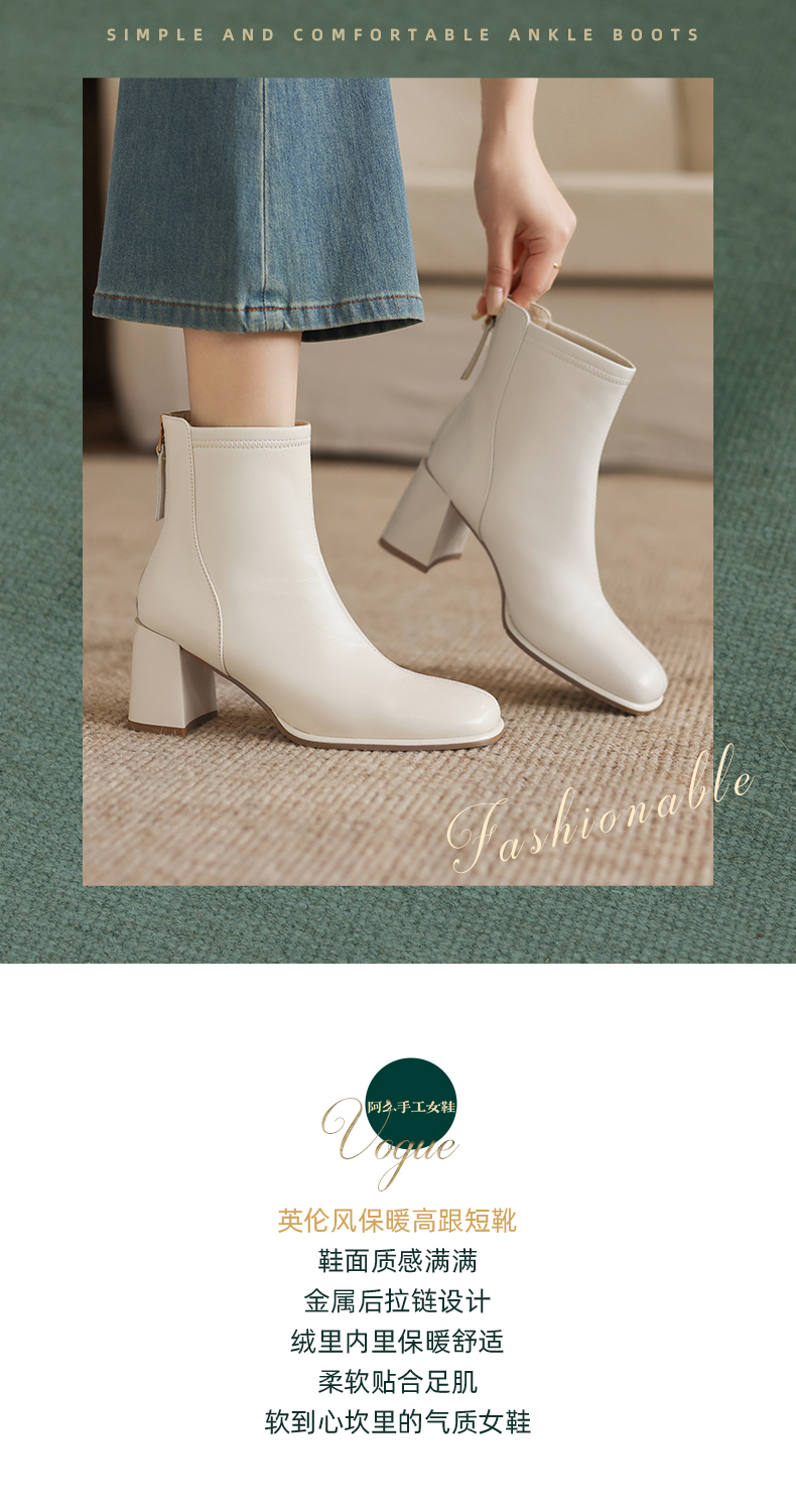 阿么手工女鞋冬季加绒法式高跟短靴女保暖白色真皮方头瘦瘦靴7CM