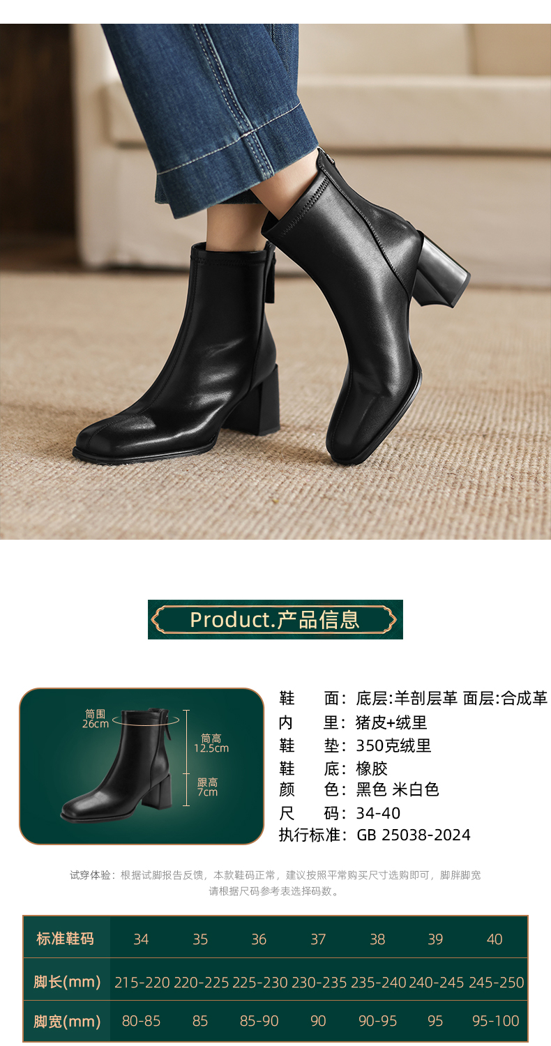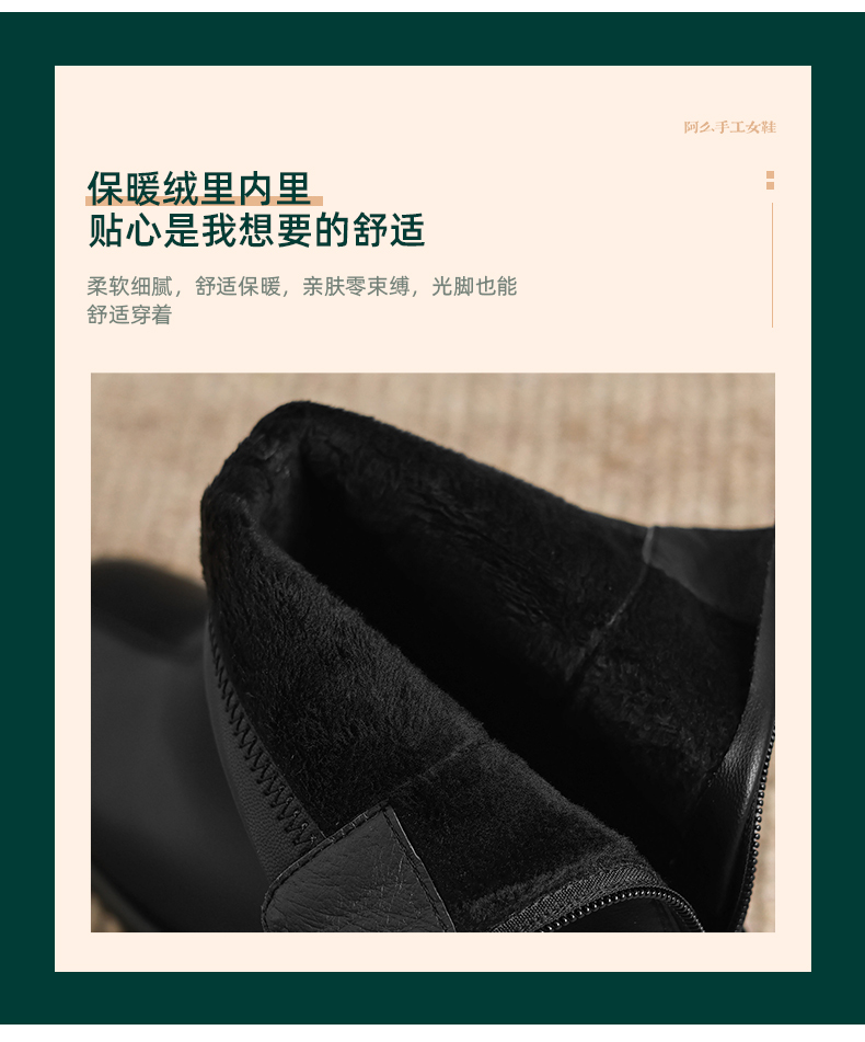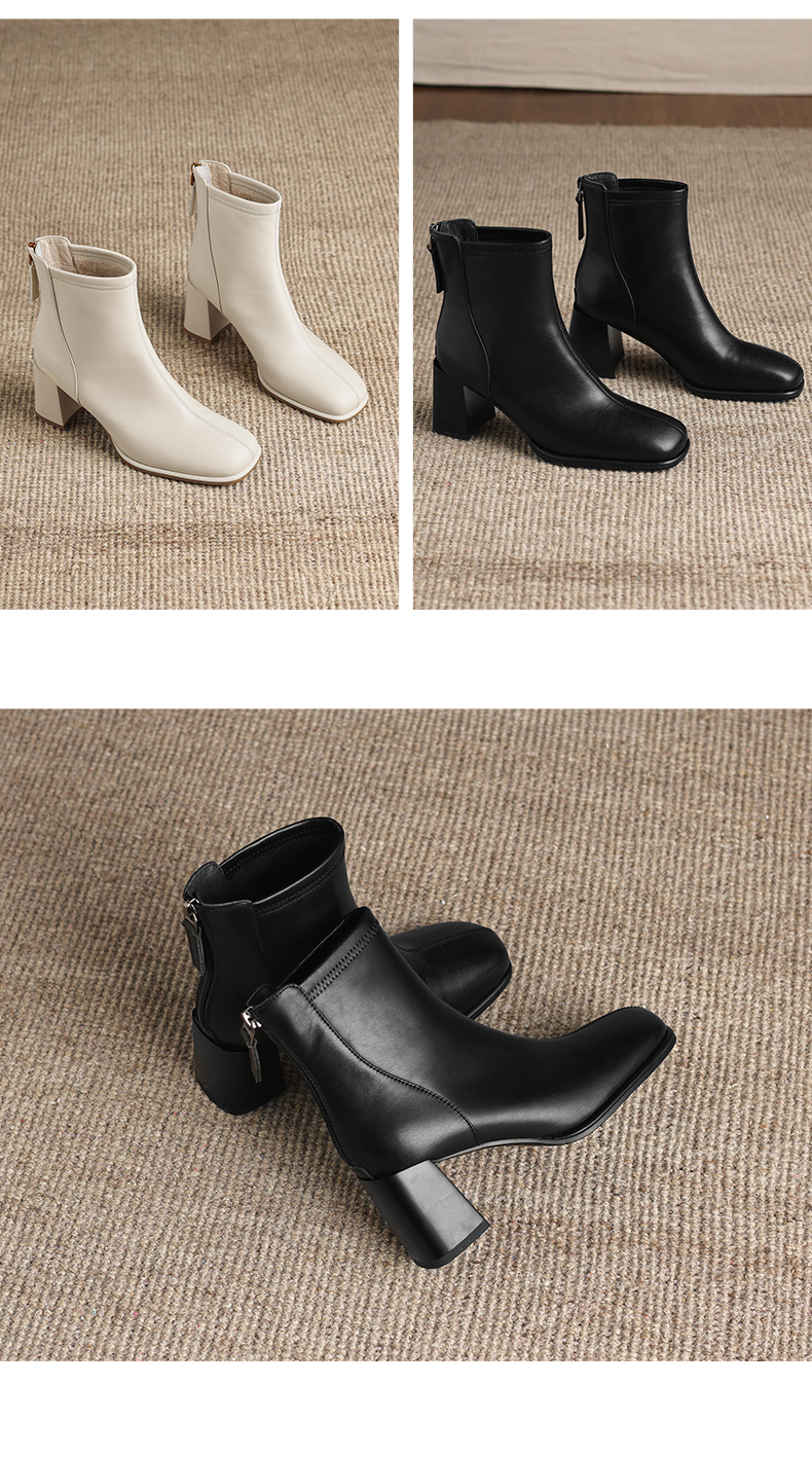 阿么手工女鞋冬季加绒法式高跟短靴女保暖白色真皮方头瘦瘦靴7CM