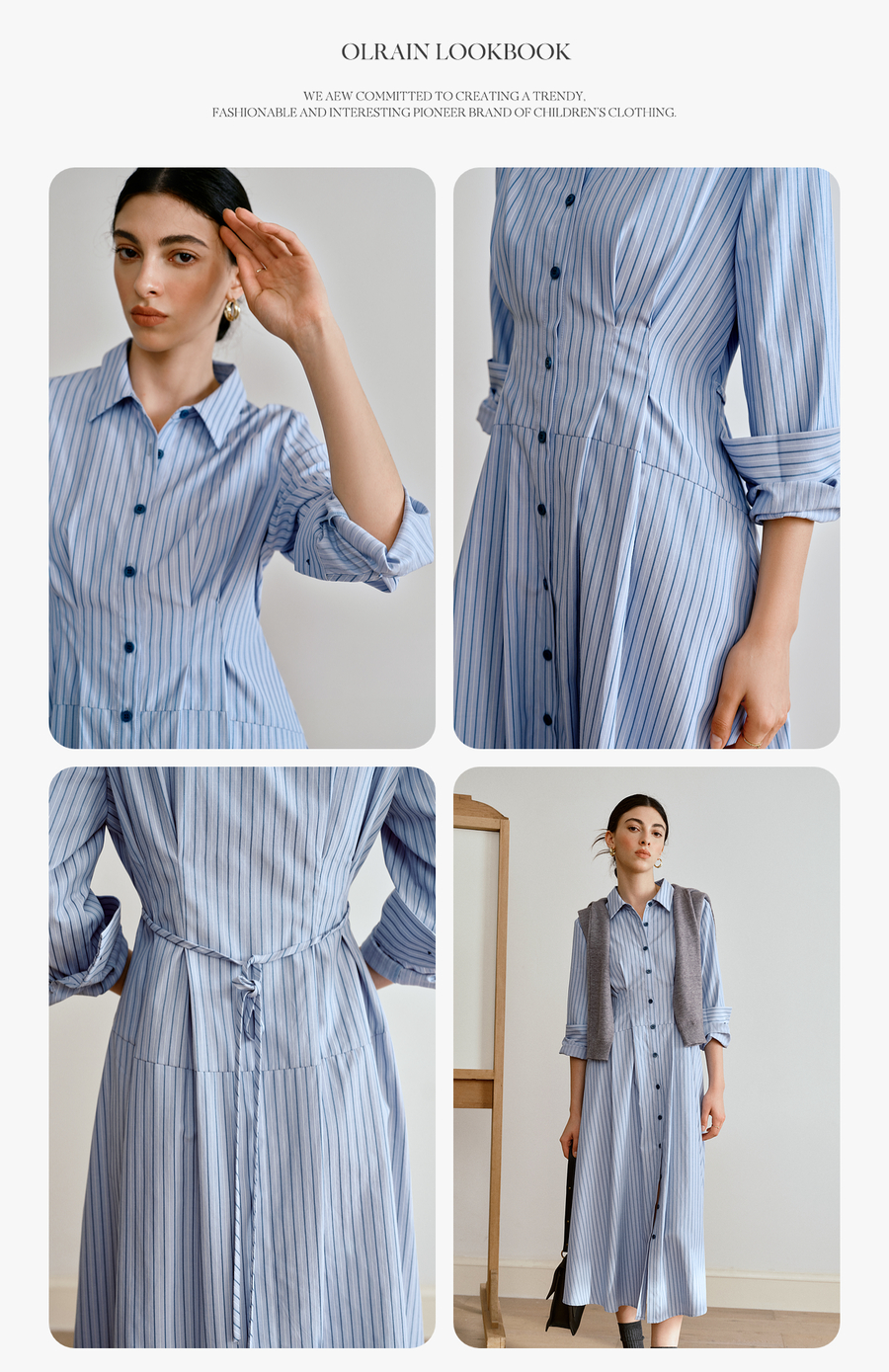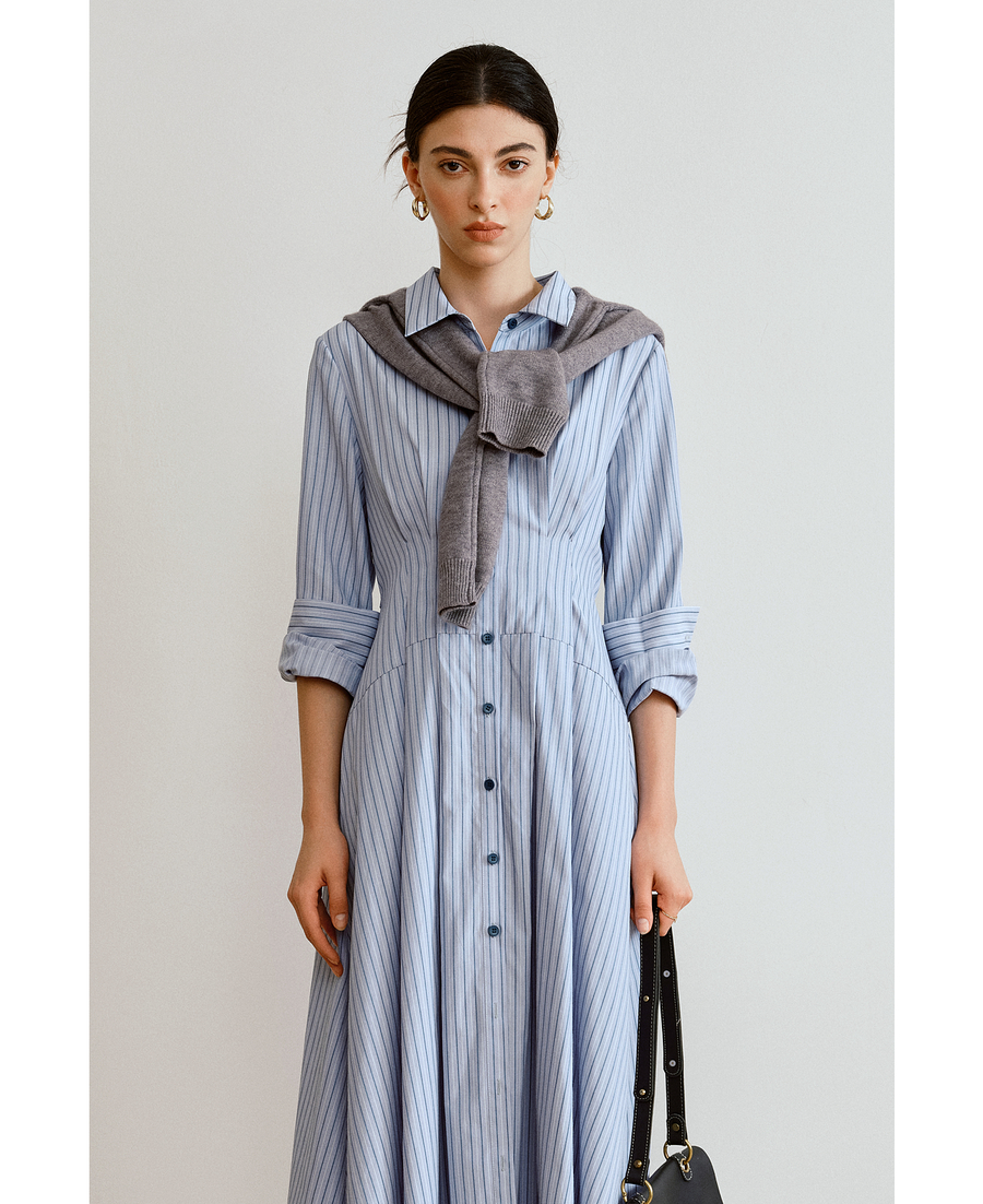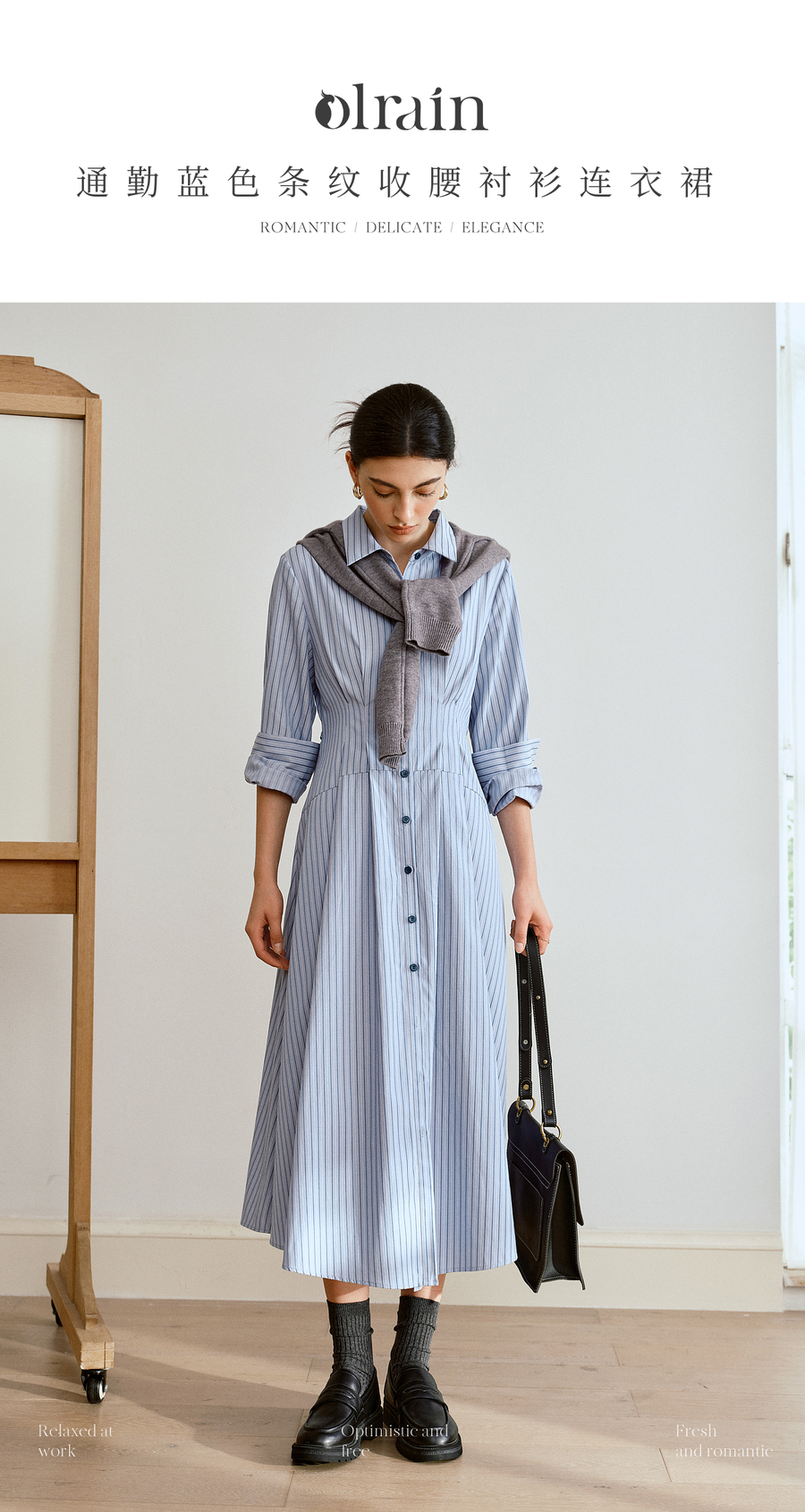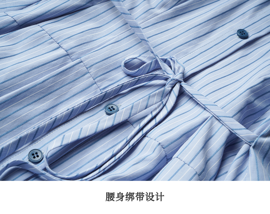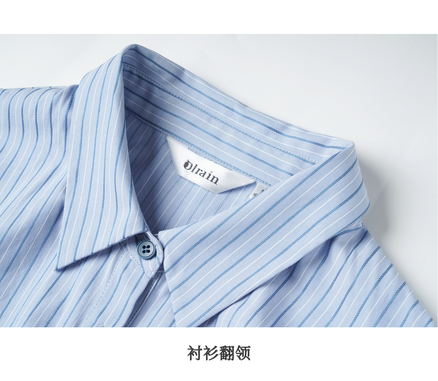 OLrain欧芮儿2025新款女秋季通勤蓝色条纹收腰衬衫连衣裙显示长裙