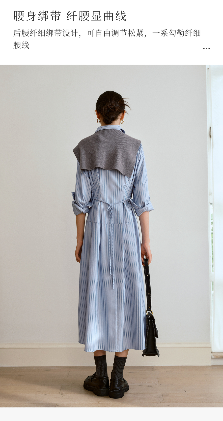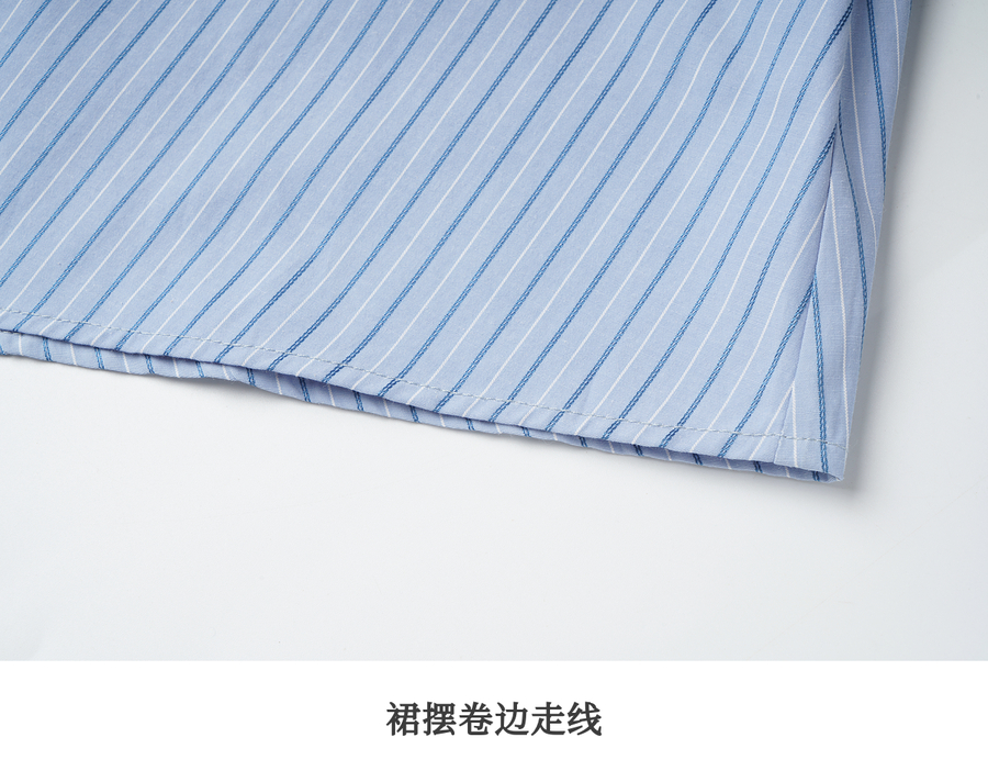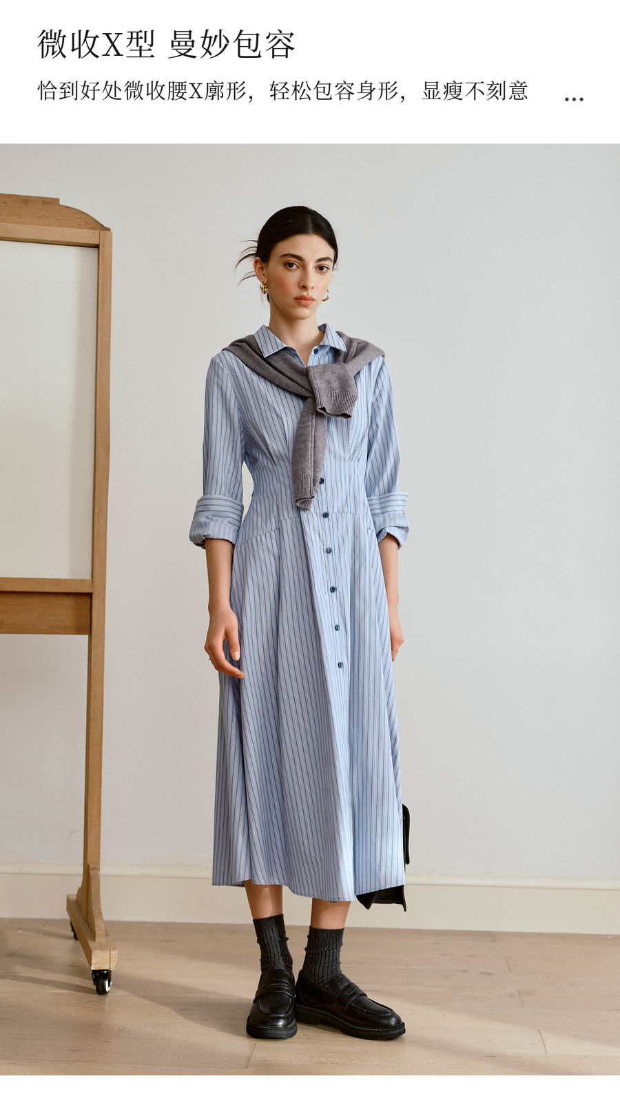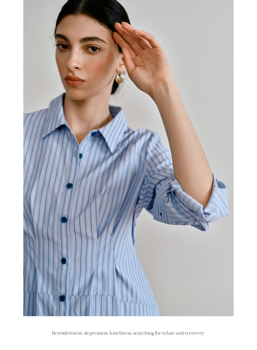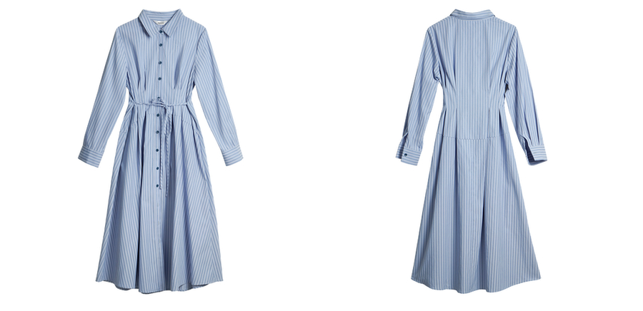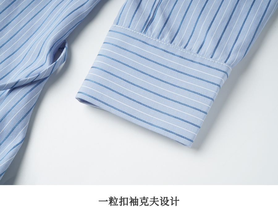 OLrain欧芮儿2025新款女秋季通勤蓝色条纹收腰衬衫连衣裙显示长裙