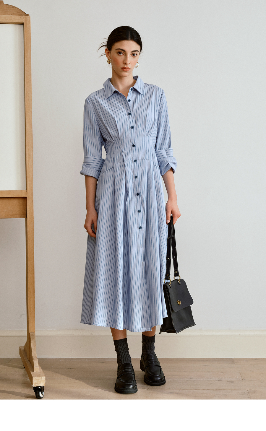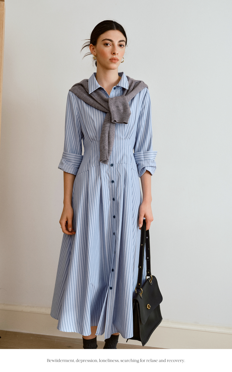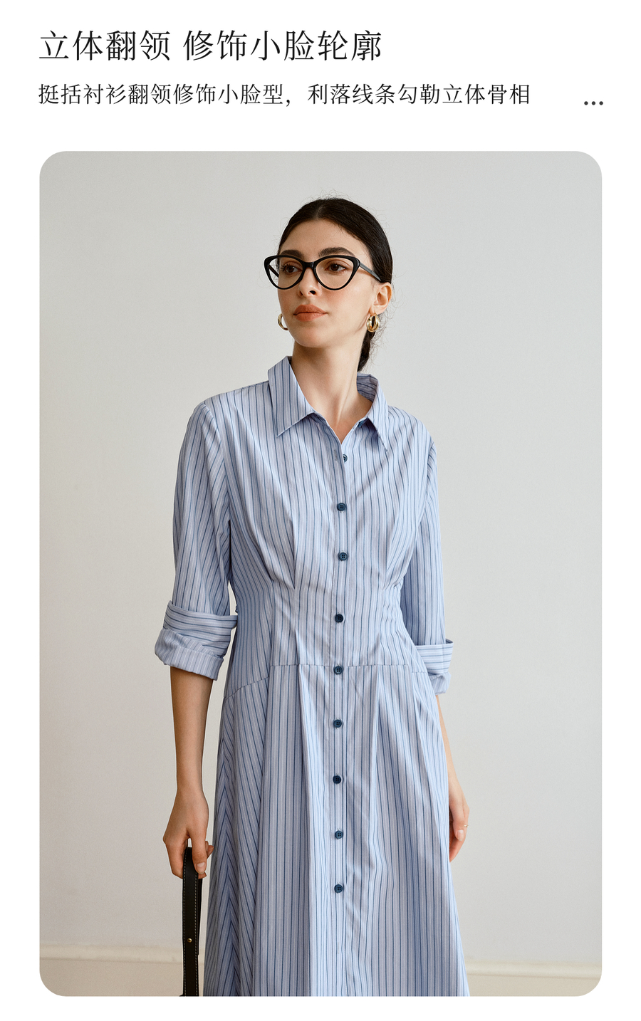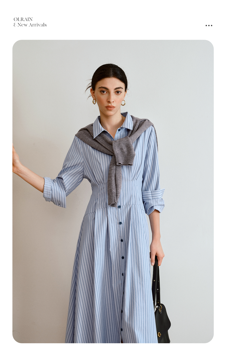 OLrain欧芮儿2025新款女秋季通勤蓝色条纹收腰衬衫连衣裙显示长裙