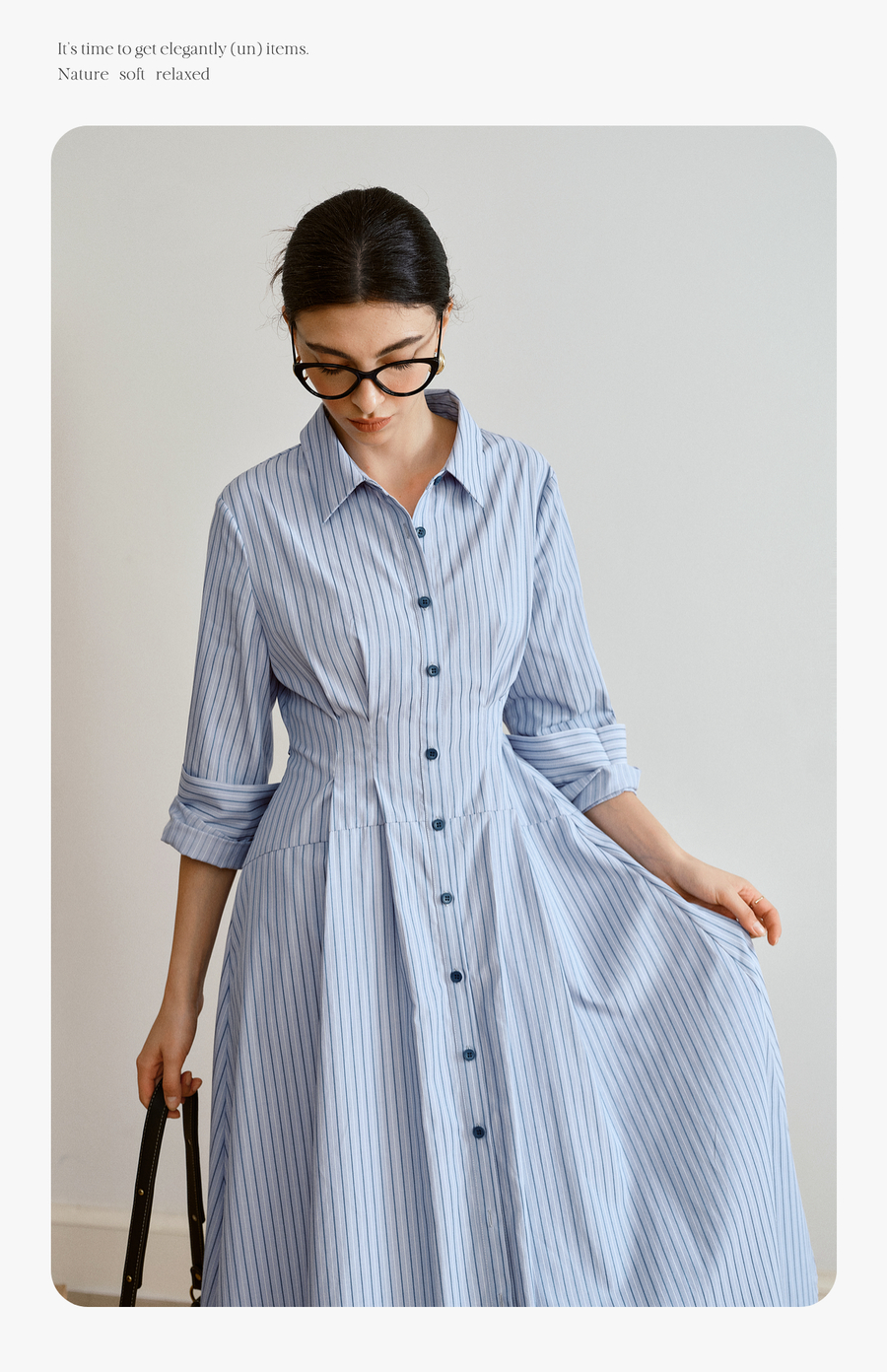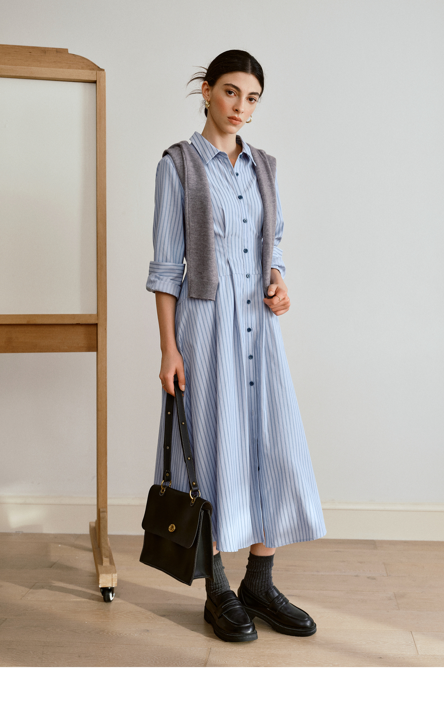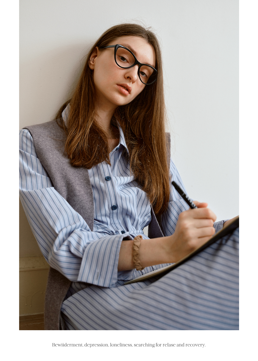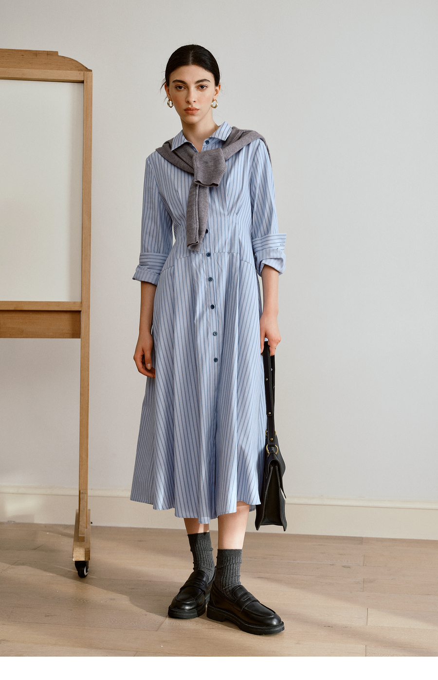 OLrain欧芮儿2025新款女秋季通勤蓝色条纹收腰衬衫连衣裙显示长裙