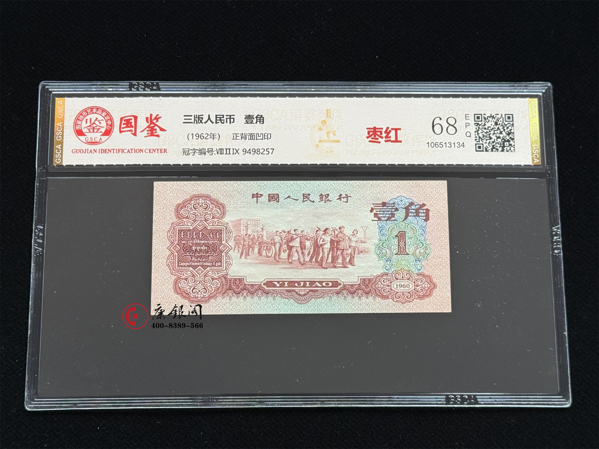 枣红一角又是一张带有政治色彩的纸币,正面主图案的劳动者向右走。在那个年代,右倾主义是被打击改造的对象,于是这枚小小的纸币一度引起了一阵轩然大波,被认为是传播右倾主义的纸币,枣红在那样的年代根本无法流通,在使用了几年后就被背绿所取代。如今,1960年版的枣红度过了它50周岁的生日,以其饱含沧桑的面容,文物般的价值傲然屹立在纸币之林.是第三套人民币中五大珍品之一。