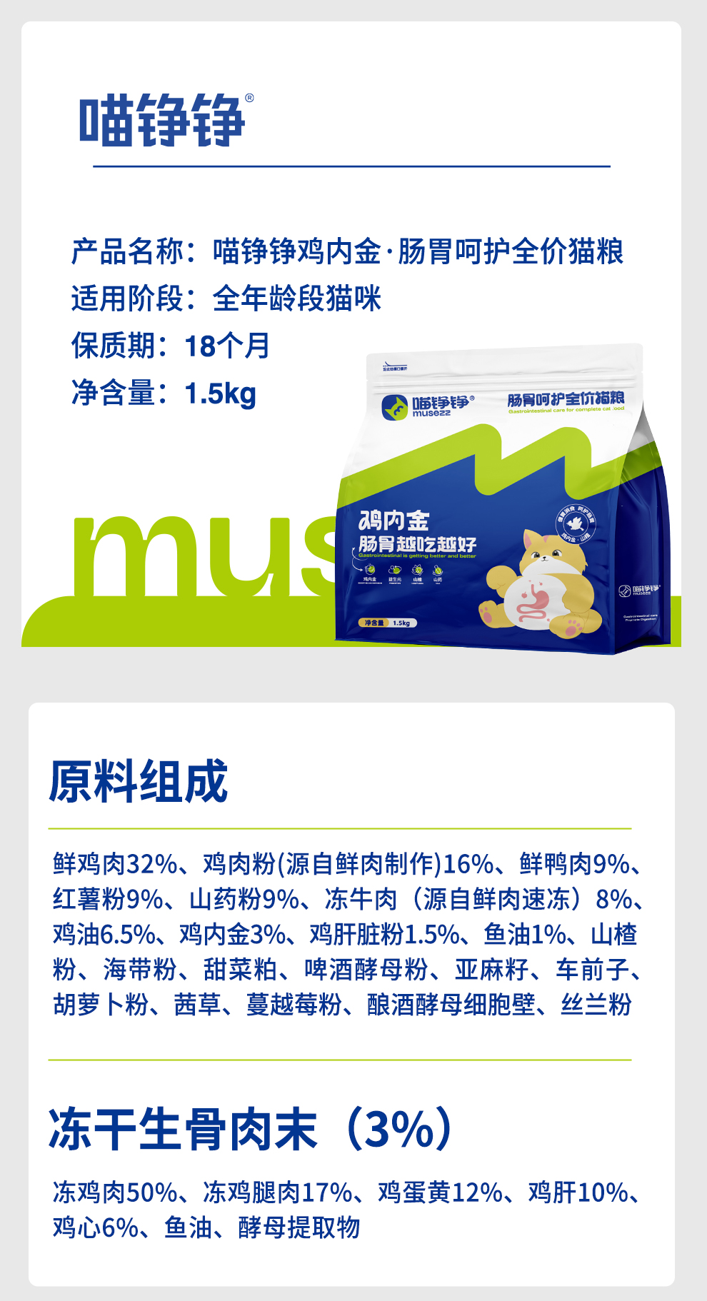 【金卡会员专属】喵铮铮鸡内金猫粮 3斤/包 喵铮铮全阶段生骨肉末营养猫粮