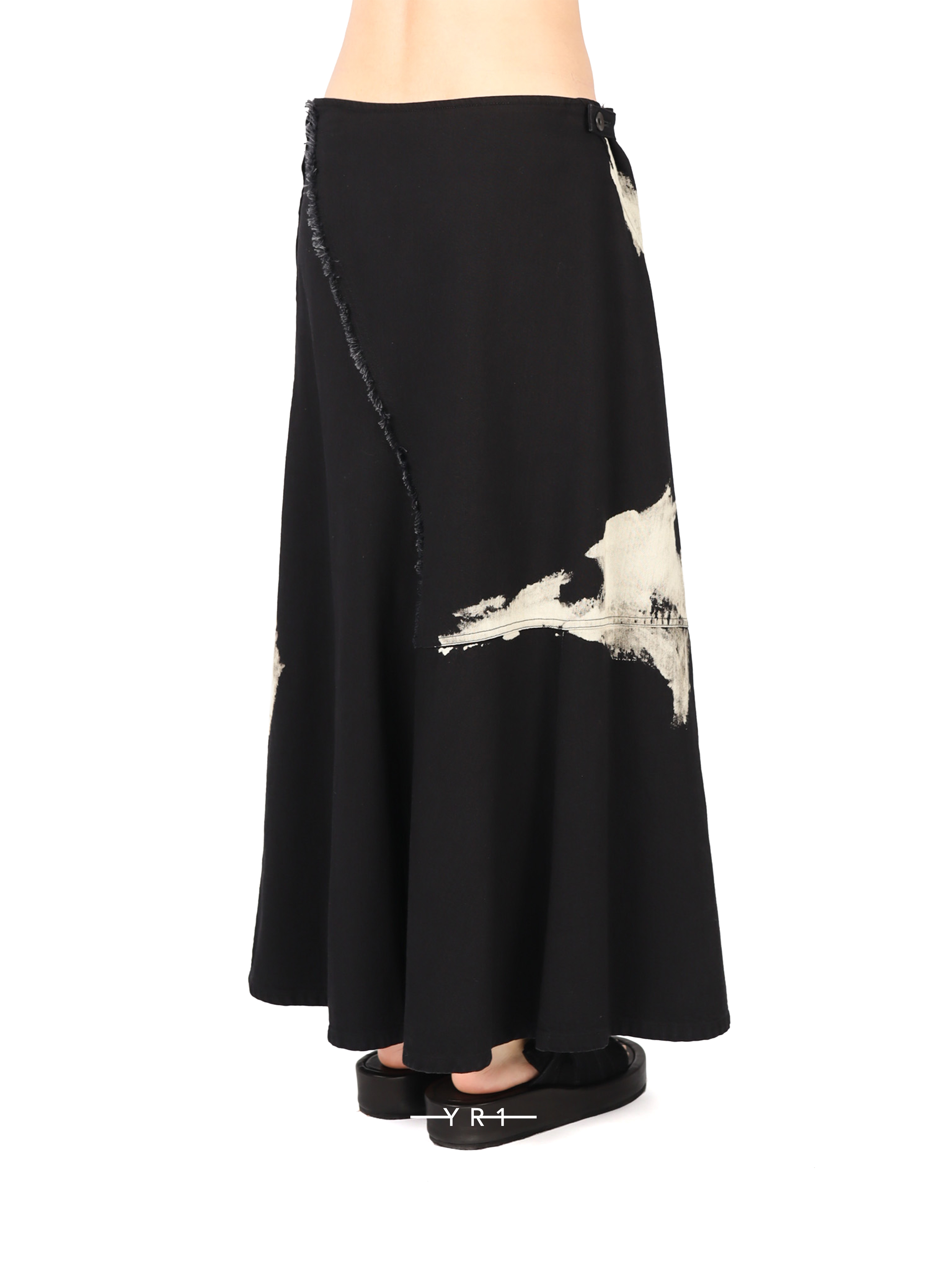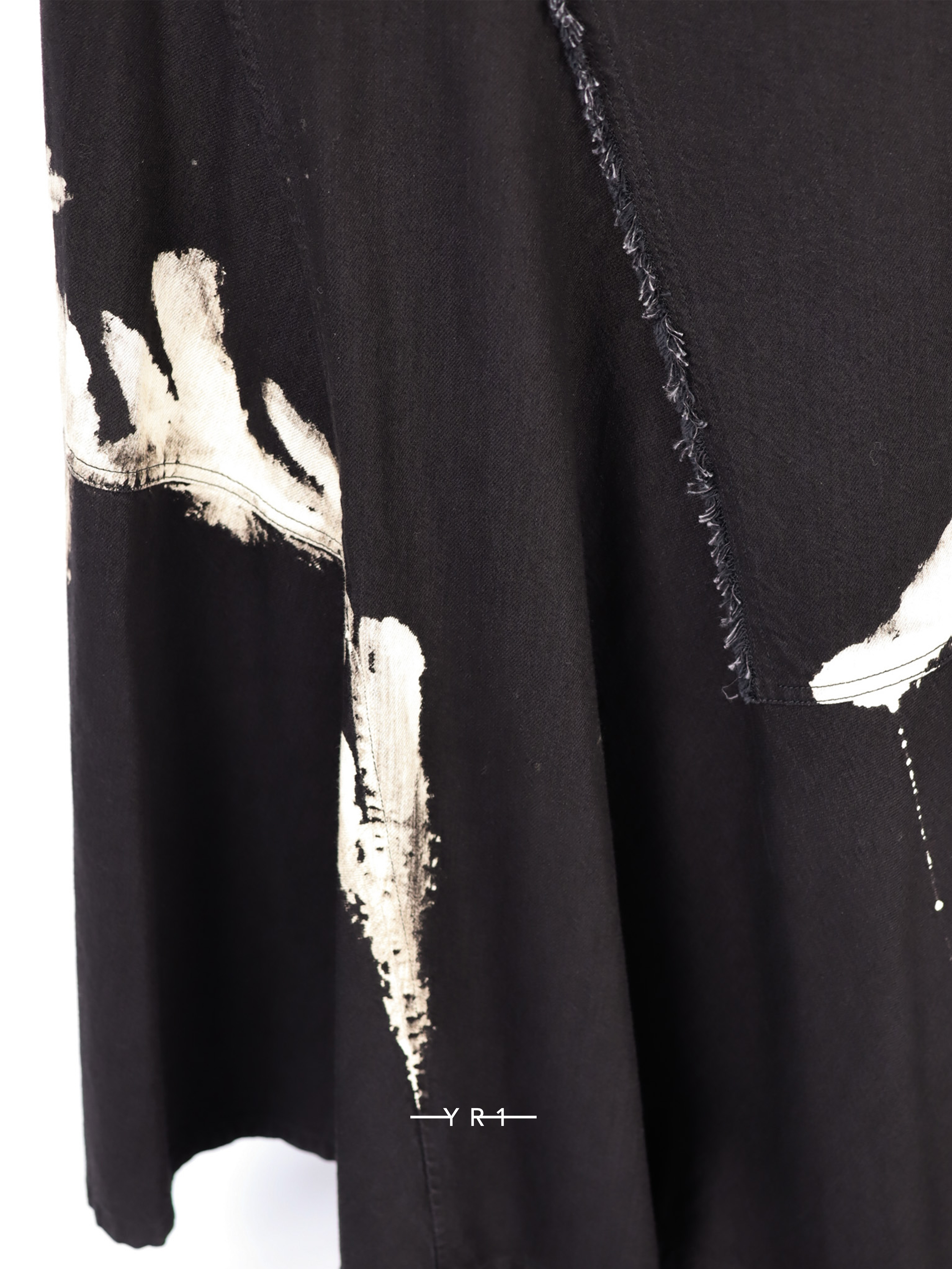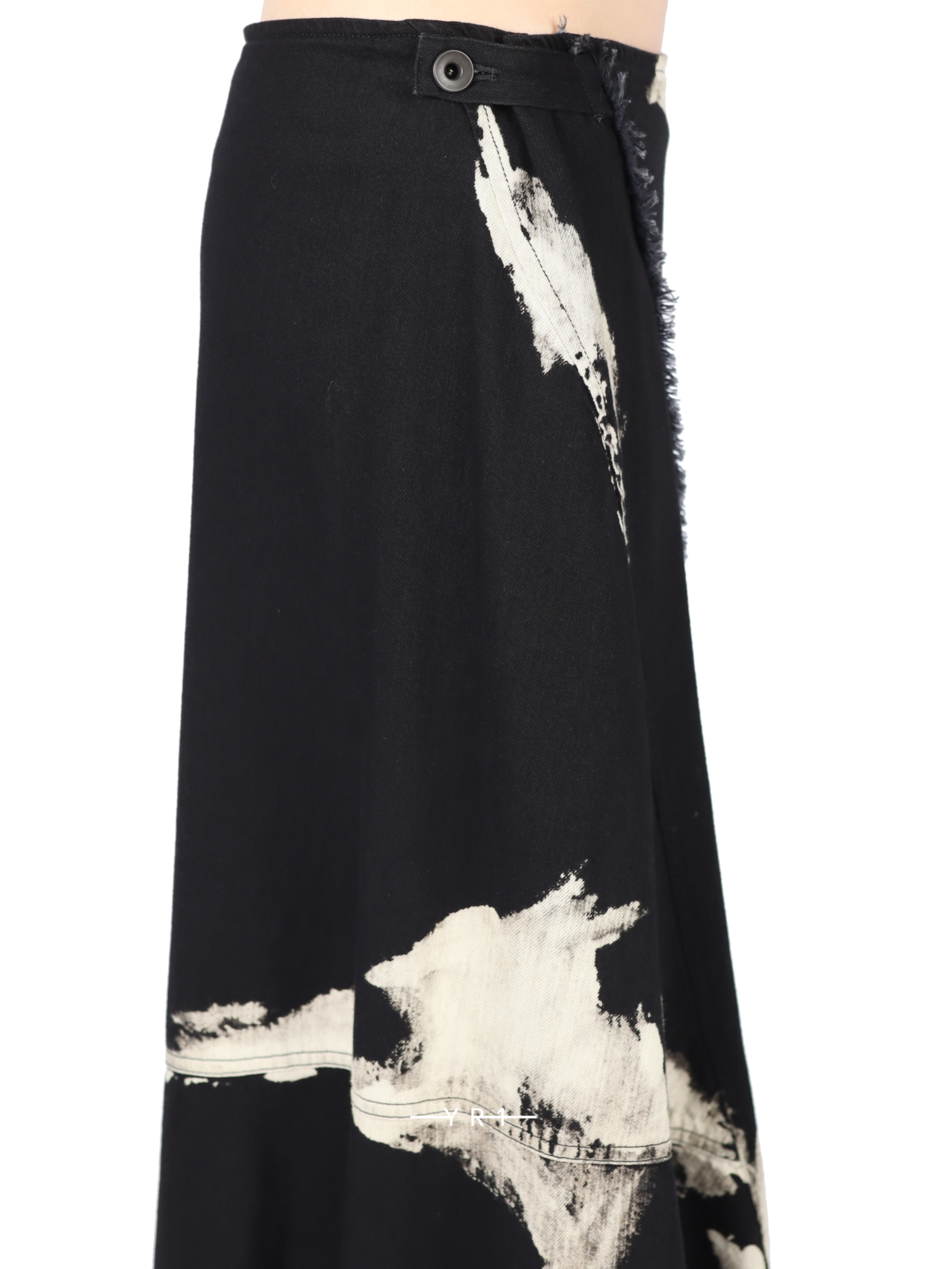 这款8盎司牛仔长裙采用深黑色牛仔布,经过放电处理,带来独特的漂白效果。腰部可通过纽扣调节。由于每件作品均为手工漂白,因此可能存在个体差异。牛仔布材质可能会导致颜色褪色。
