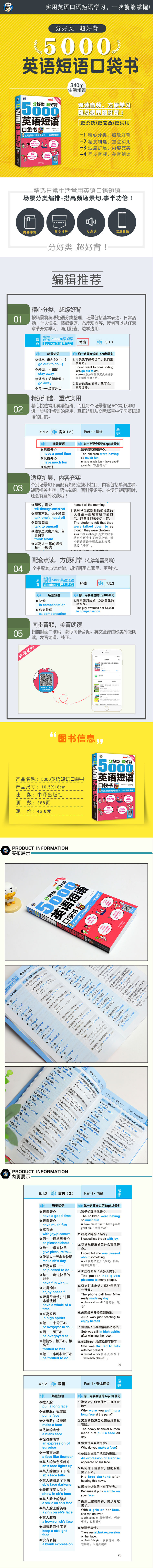 《分好类 超好背 5000英语短语 口袋书》精选日常生活常用英语口语短语,并采用场景分类的编排方式整理而成,再搭配高频场景句,让读者的英语短语学习更加有画面感,学习效果自然事半功倍!全书配有双速音频,方便学习。全书配套点读功能,想学哪里点哪里。开本小巧,可以随身携带随时用,轻松掌握实用地道的英语短语。