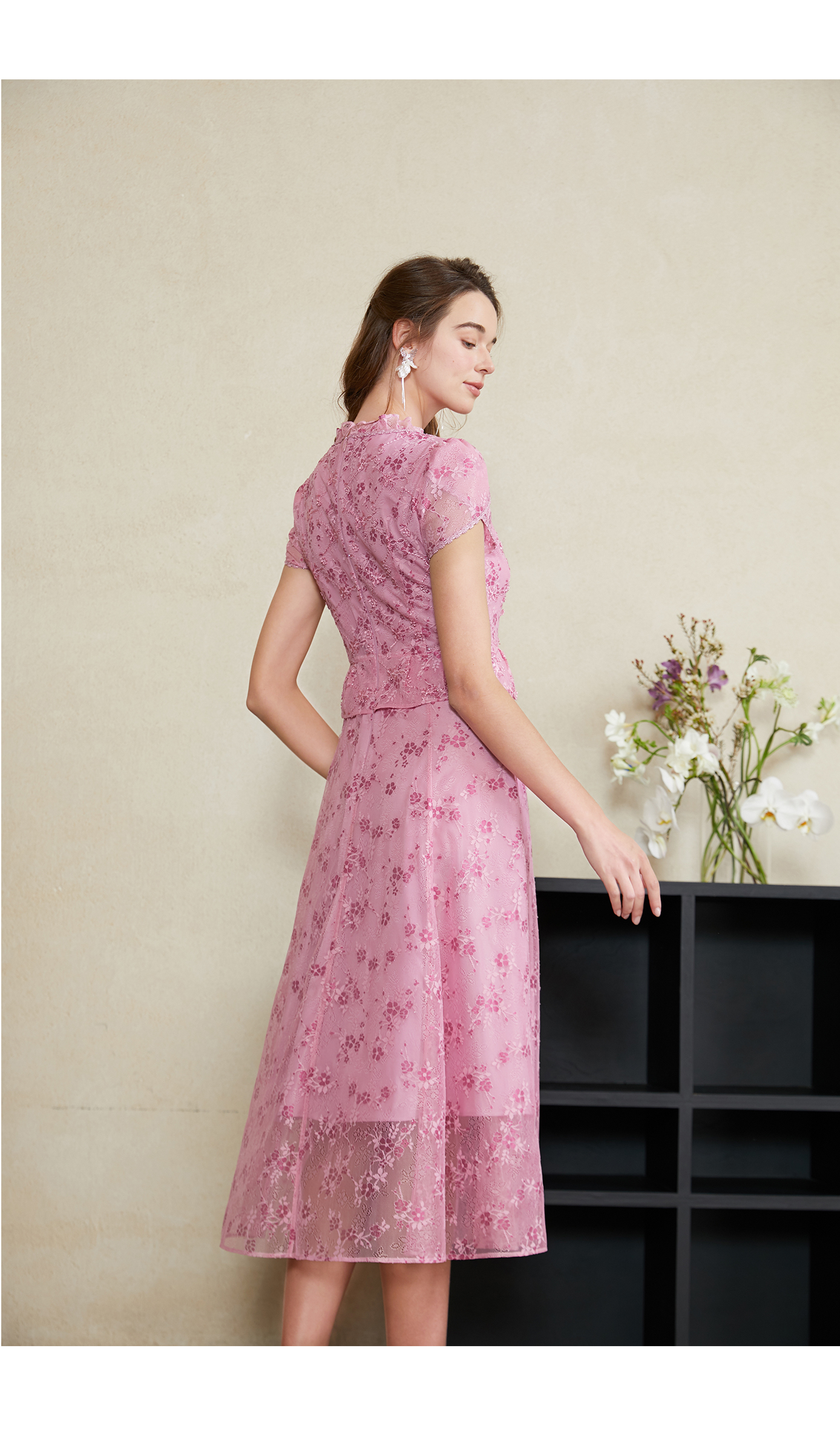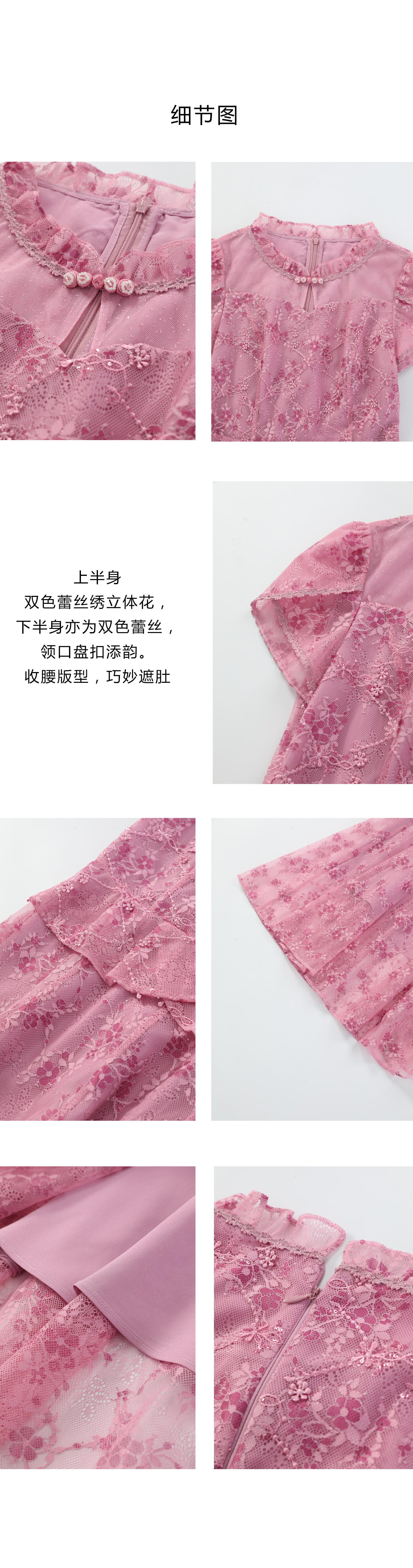 司歌蕾丝假两件收腰连衣裙短袖复古A911245X