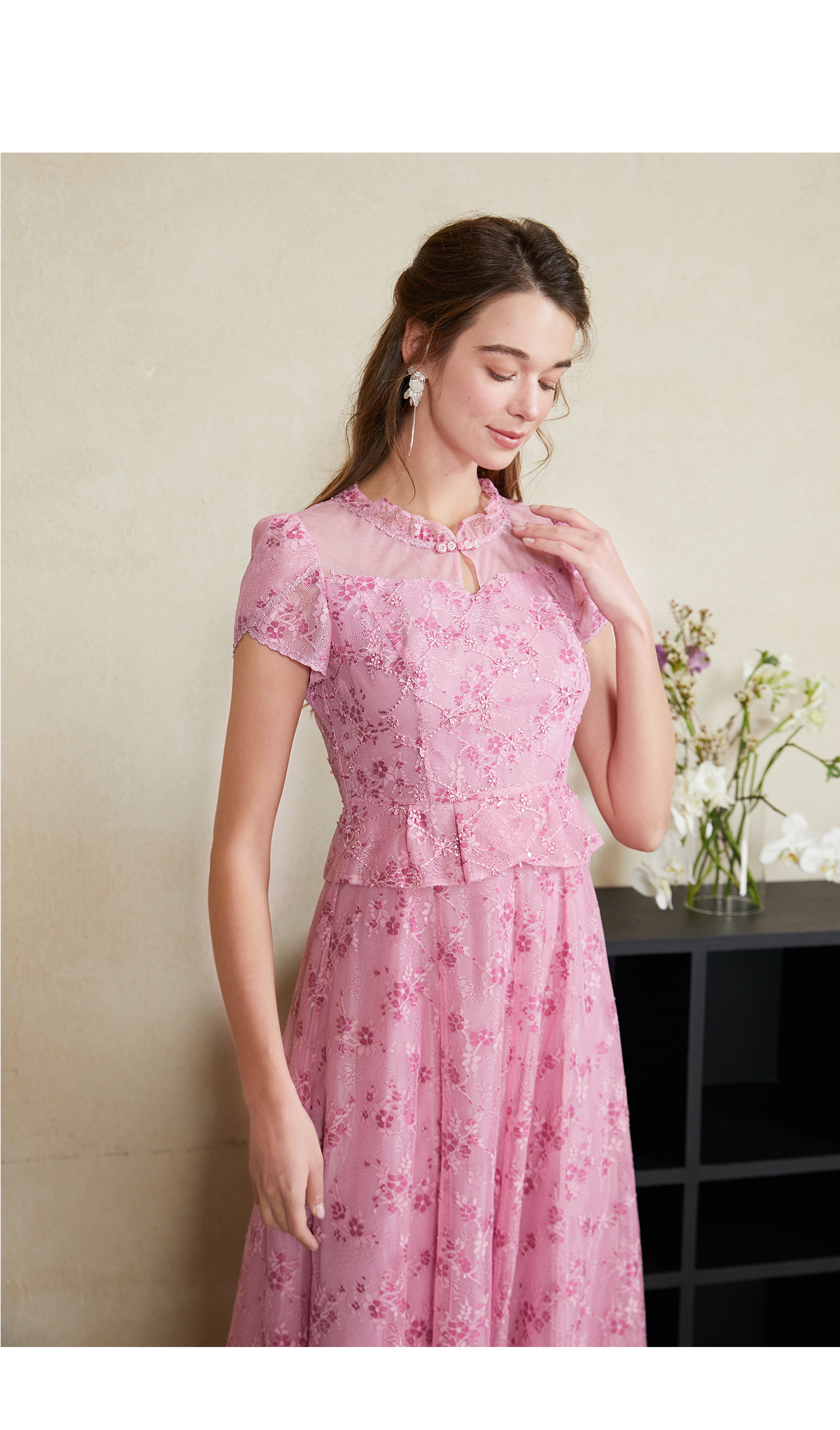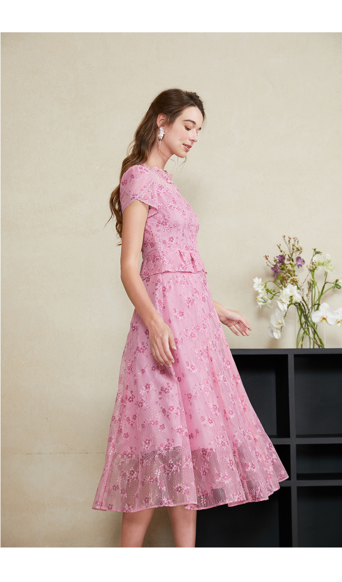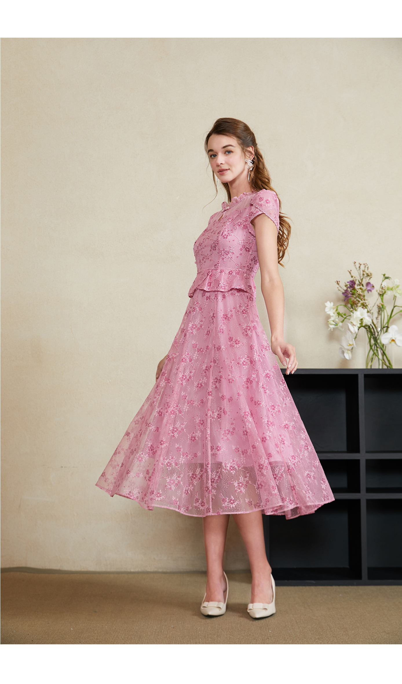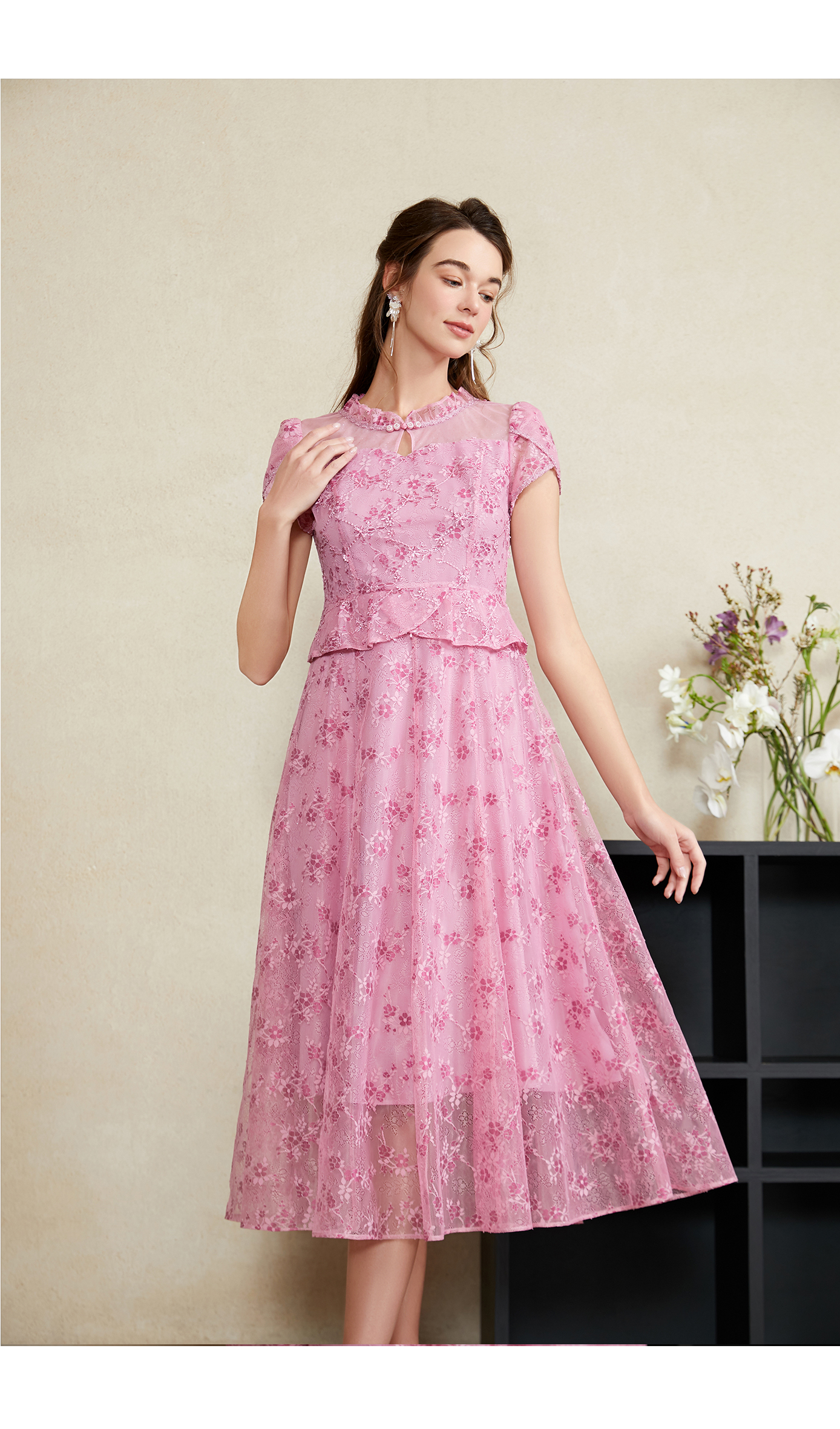 司歌刺绣连衣裙圆领网纱长袖弹力修身A881268