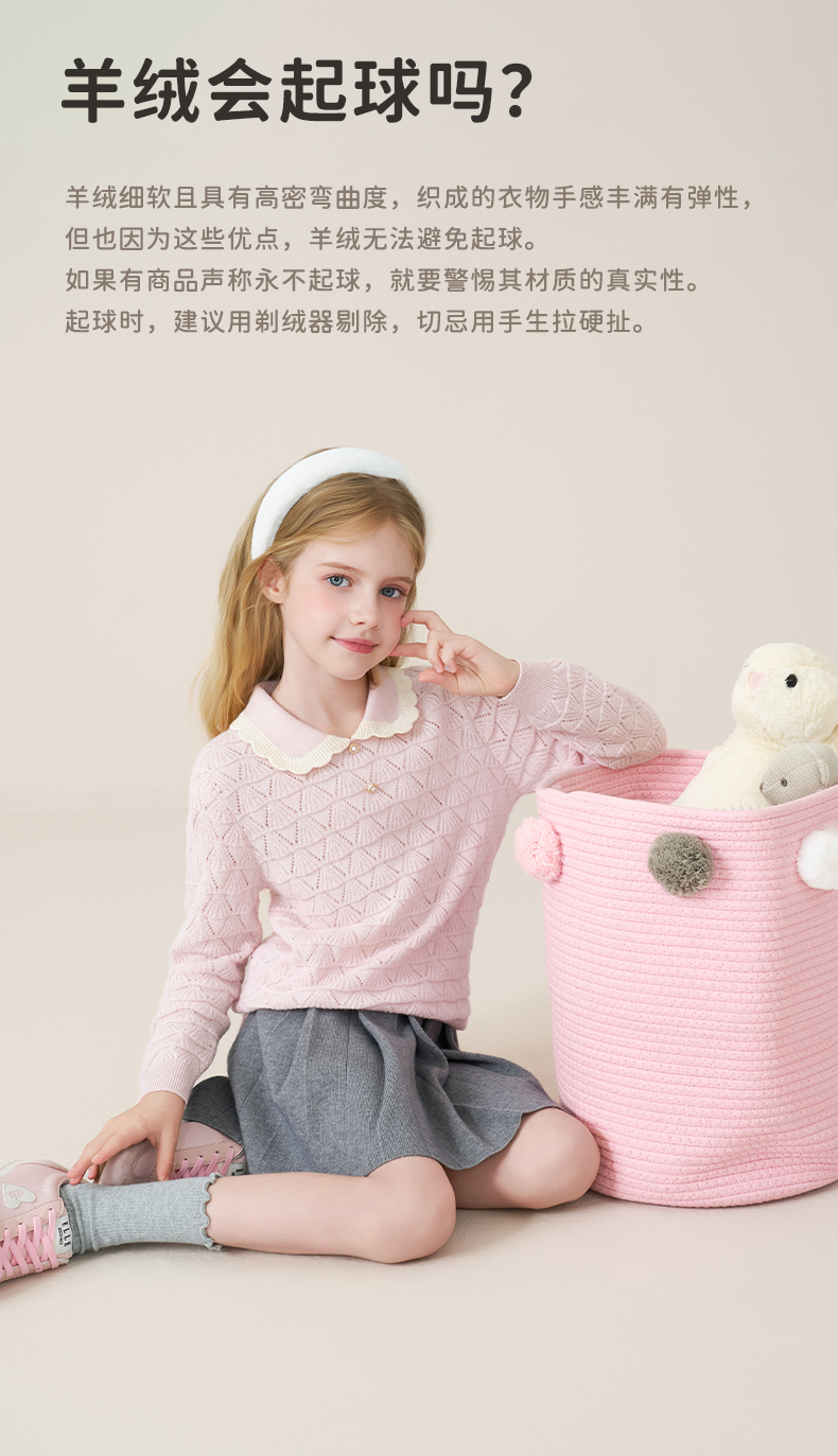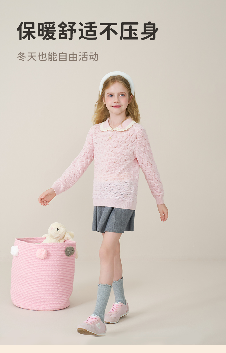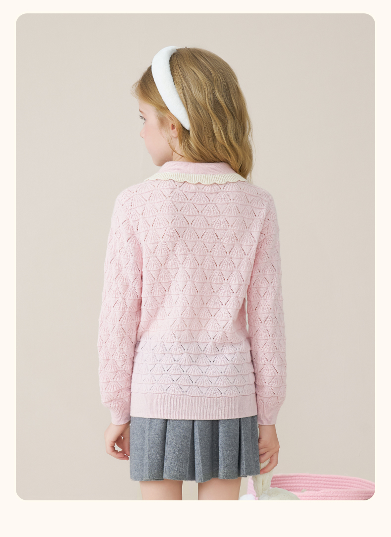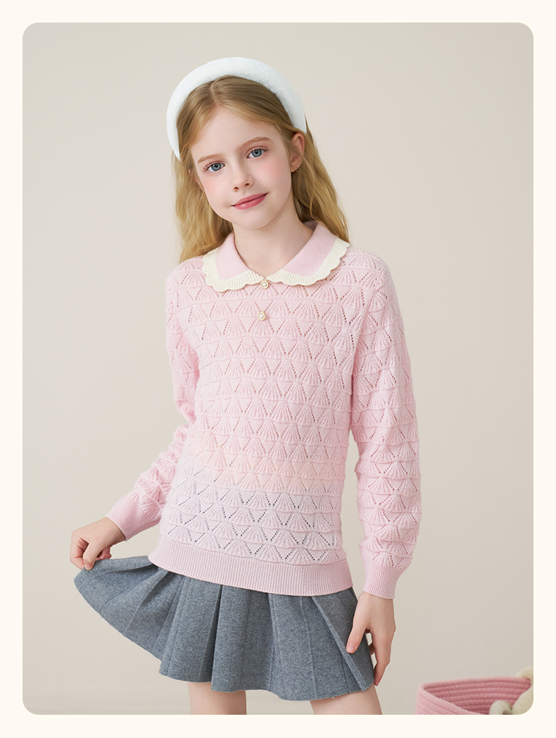 儿童100%羊绒衫2025秋冬女童花边翻领针织毛衣镂空提花甜美打底衫