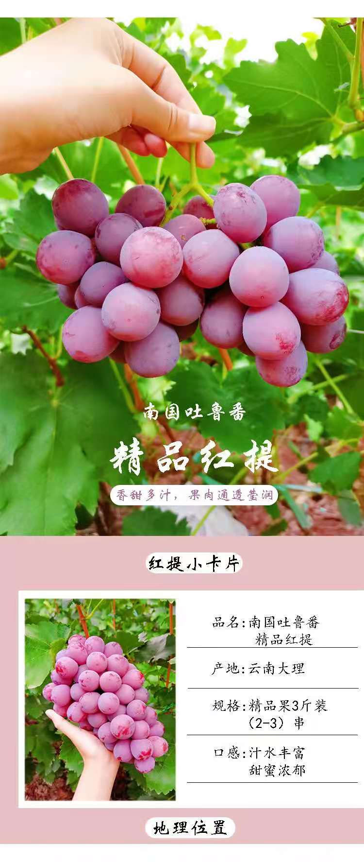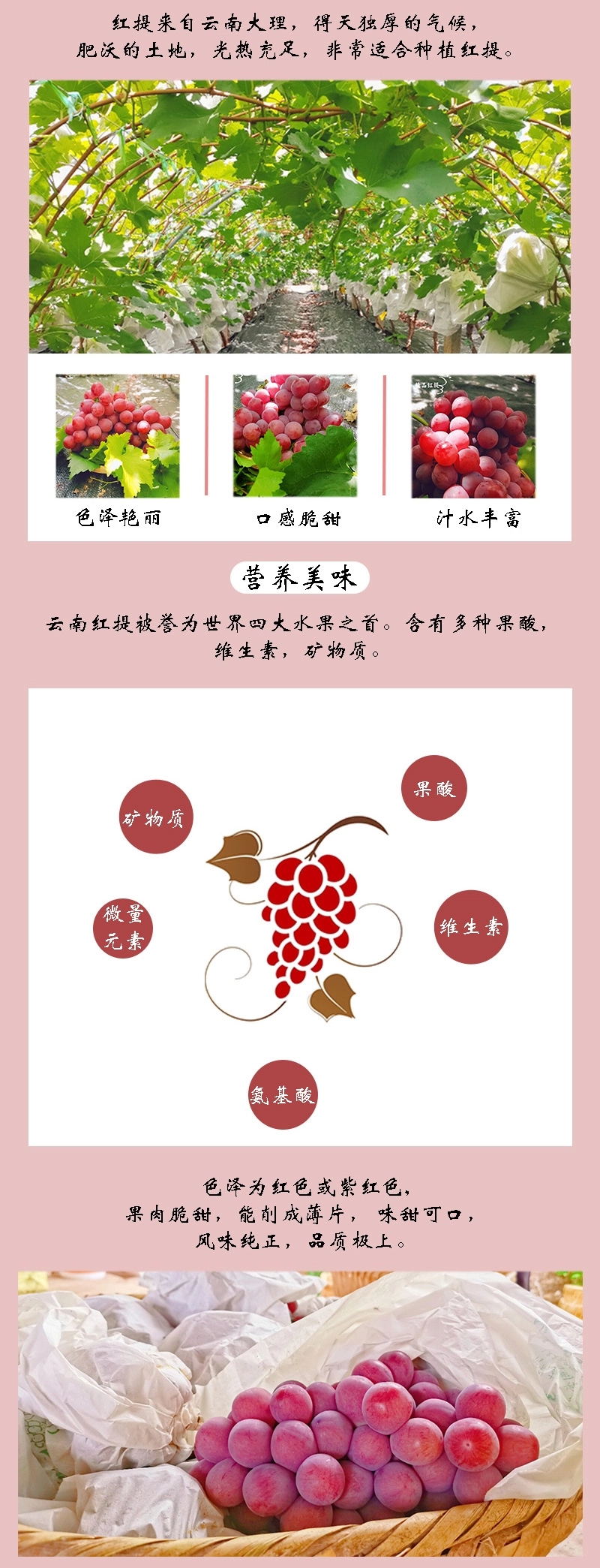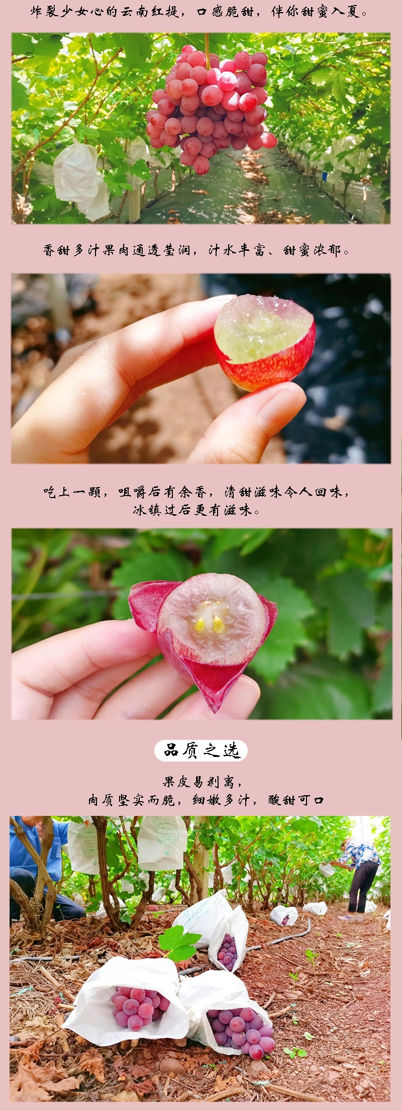 【产品特点】炸裂少女心的云南红提,口感脆甜,伴你甜蜜入夏,香甜多汁果肉通透莹润,汁水丰富、甜甜蜜浓郁,吃上一颗,咀嚼后有余香,清清甜滋味令人回味,冰镇过后更有滋味。