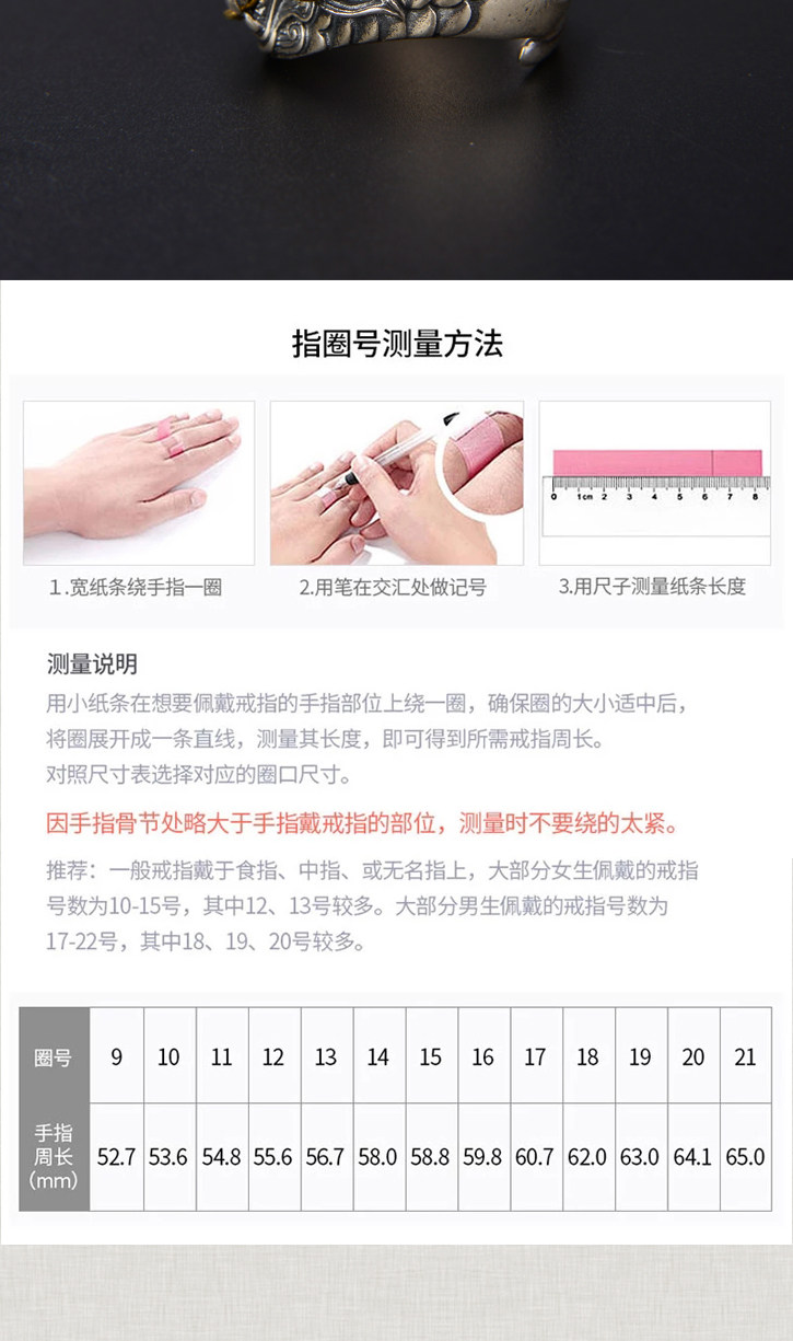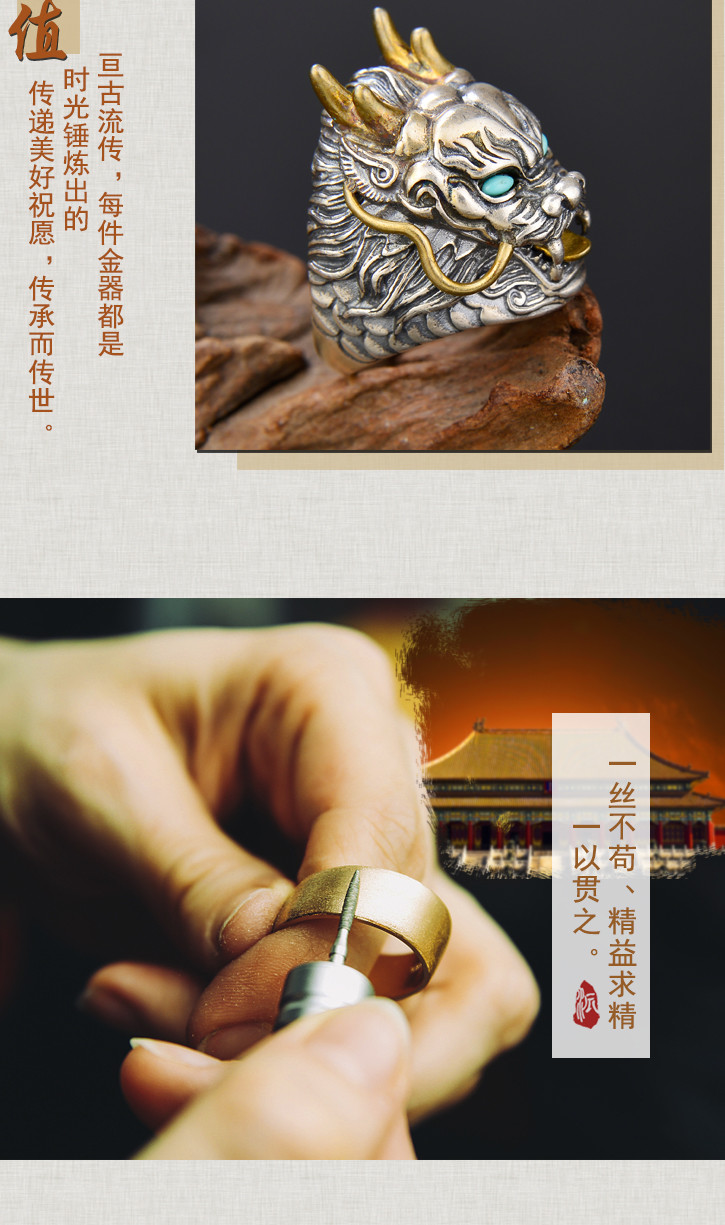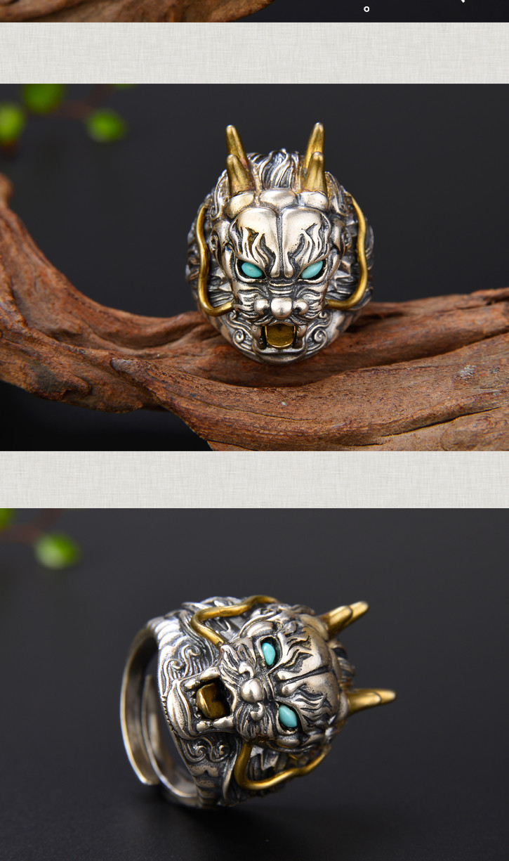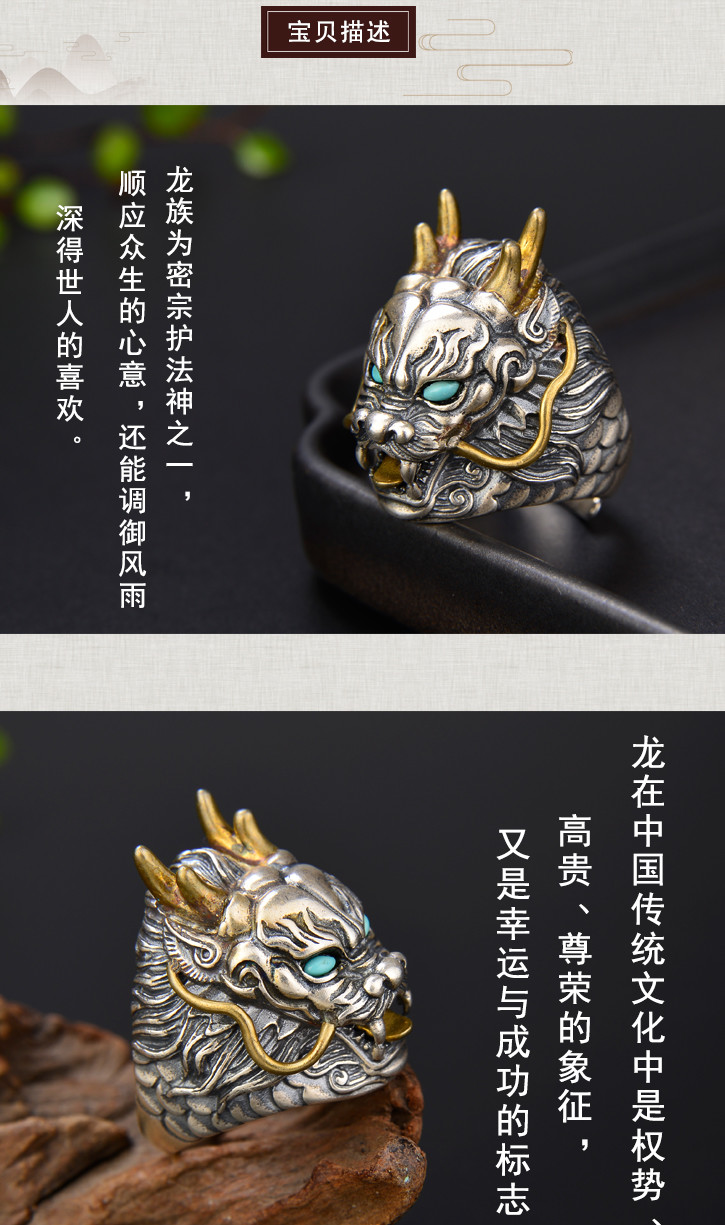 天语龙吟 银精工镶铜龙王龙头指纯银戒指男女款活扣可调节