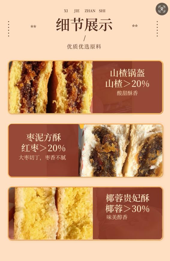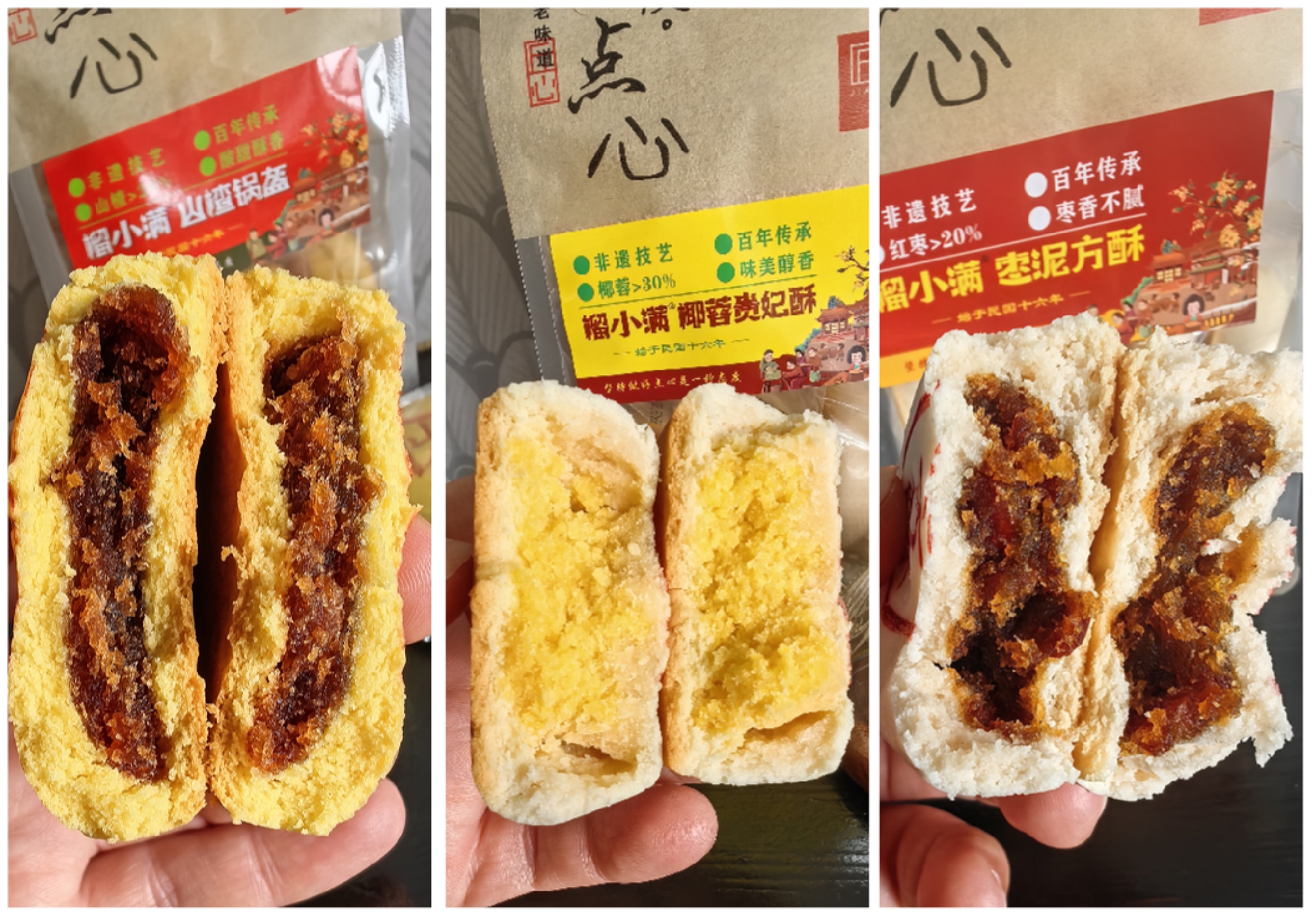 3.三款糕点的馅料及饼皮均为古法匠心制作,手工熬制糖浆,非遗技艺,古法提浆,慢火快火交替熬制而成,味道轻甜不腻。
