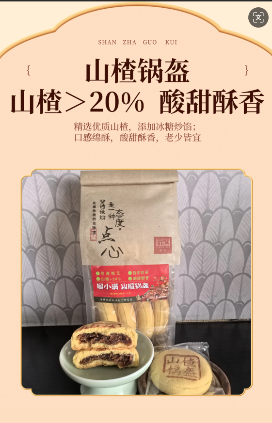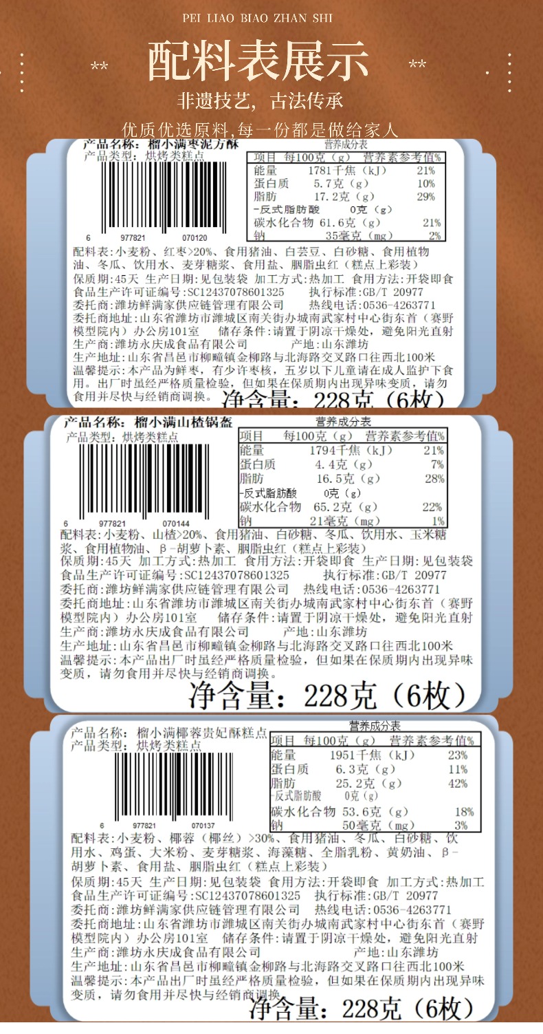 山楂锅盔:小麦粉、山楂>20%、食用猪油、白砂糖、冬瓜、饮用水、玉米糖浆、食用植物油、β-胡萝卜素,胭脂虫红(糕点上彩装);