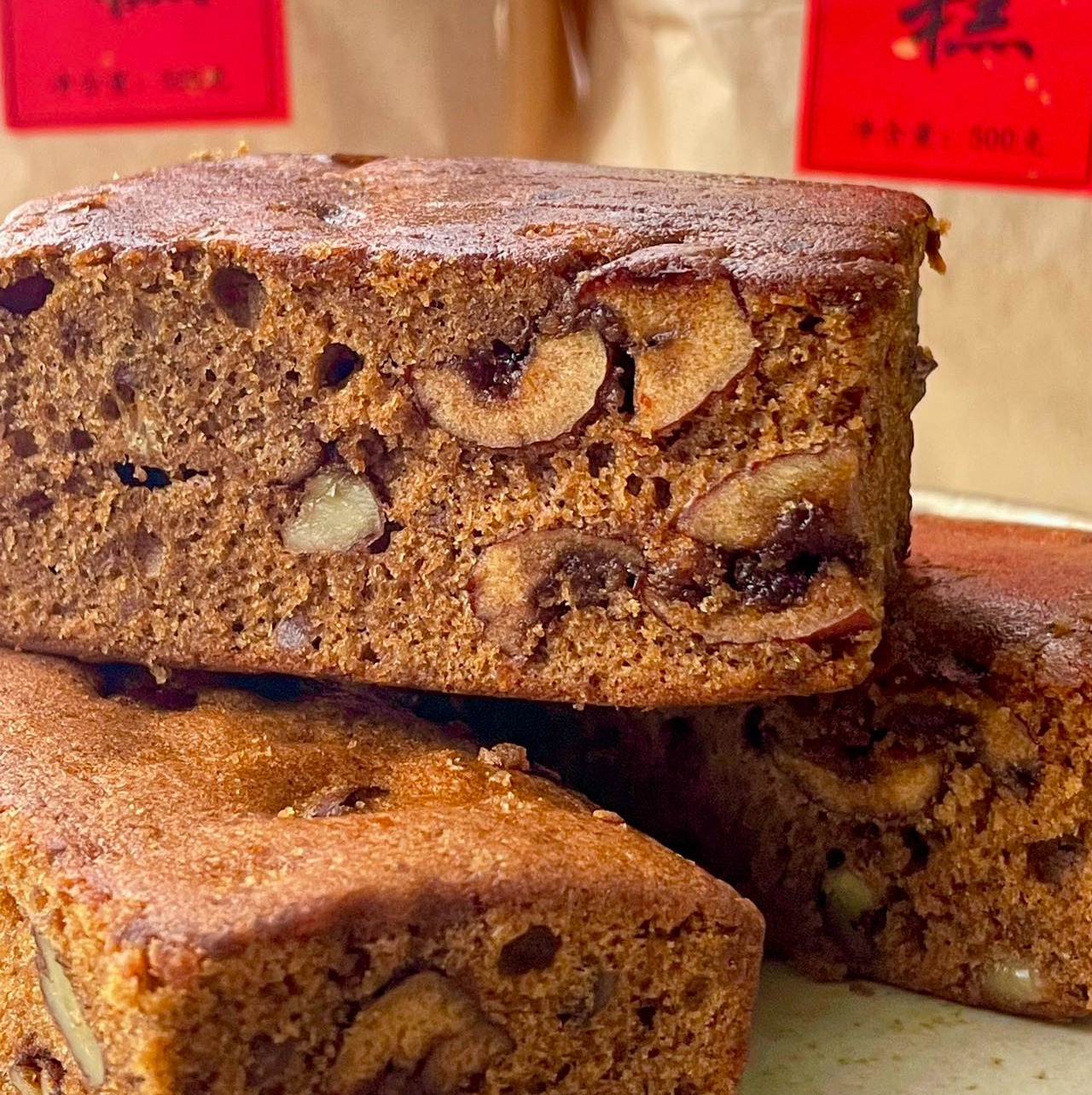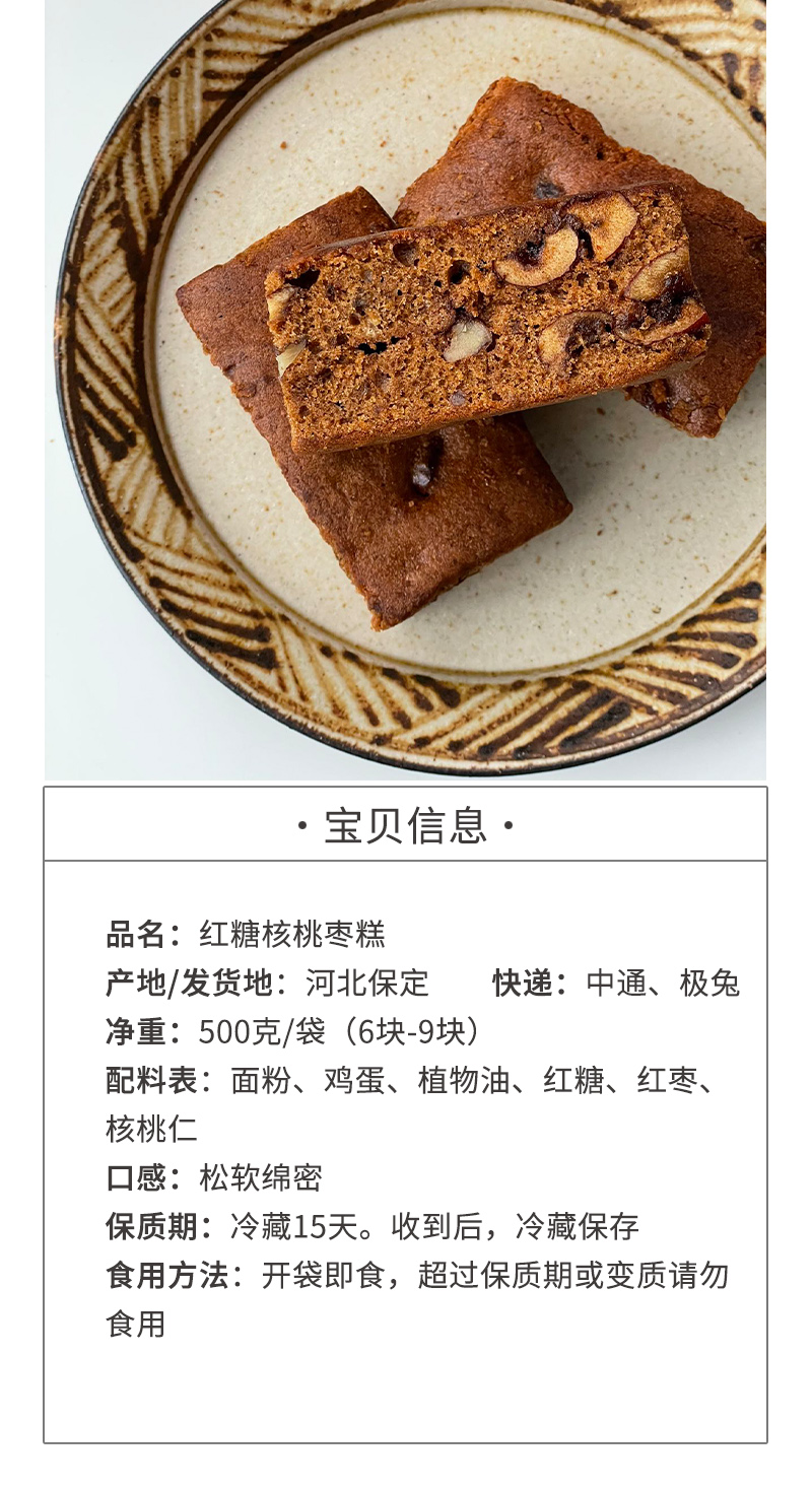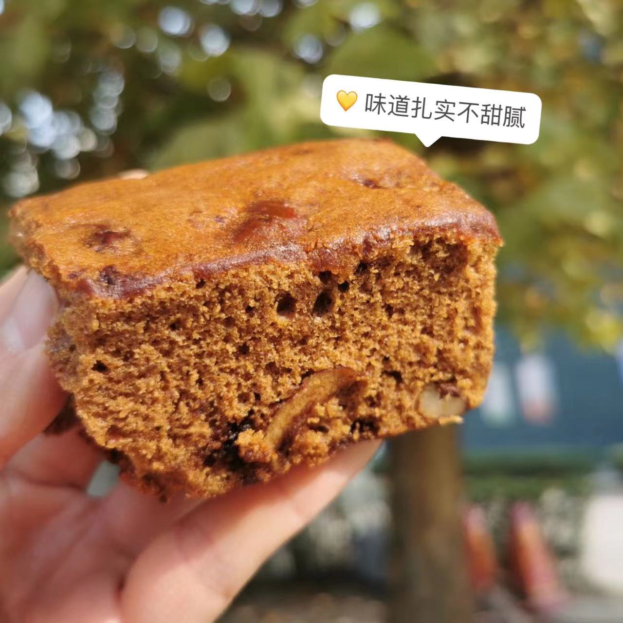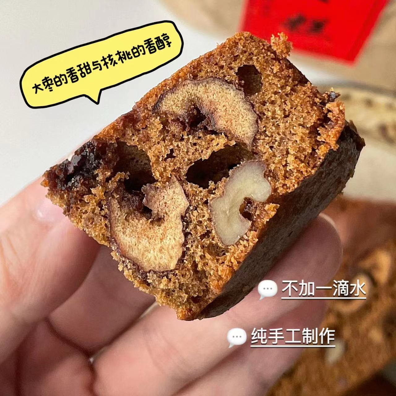 纯手工制作,配料干净又营养的【红糖核桃枣糕】!!!红糖鸡蛋植物油和面,制作过程中不添加一滴水,再加入大量的枣丁核桃仁,可以看得见的真材实料。