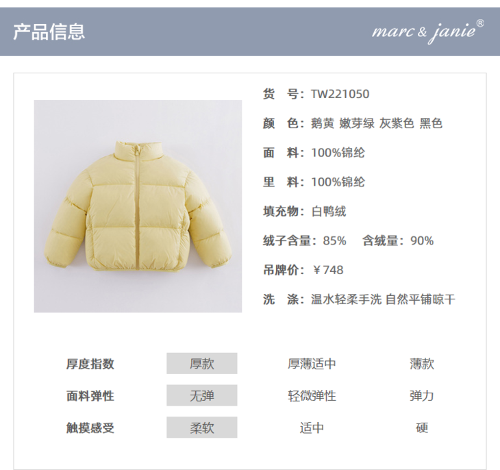 【三防】马克珍妮冬装新款 女童超轻保暖羽绒服面包服221050