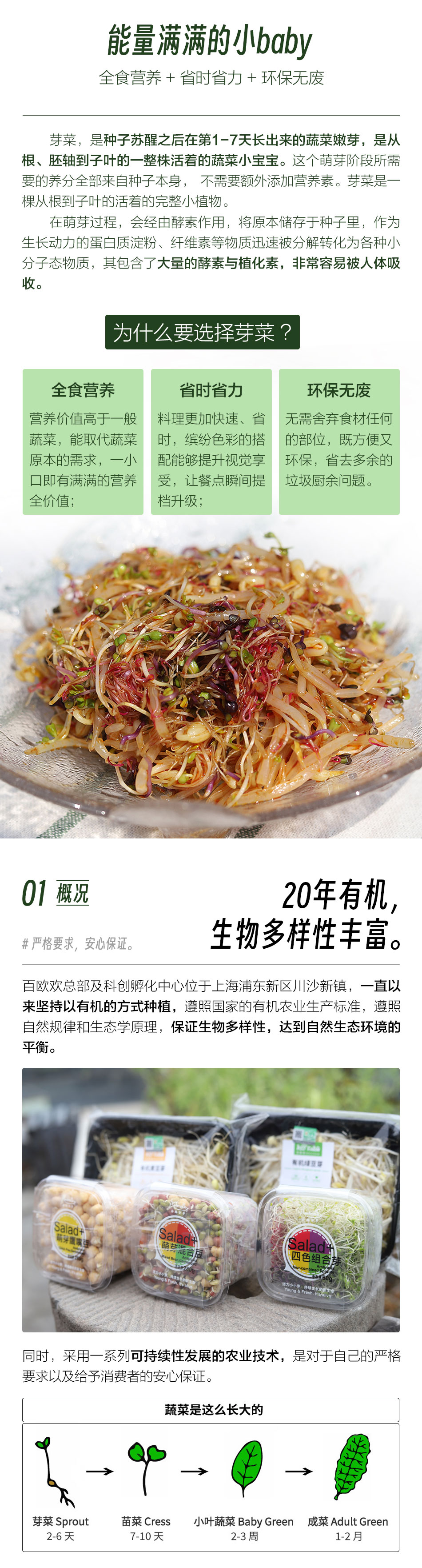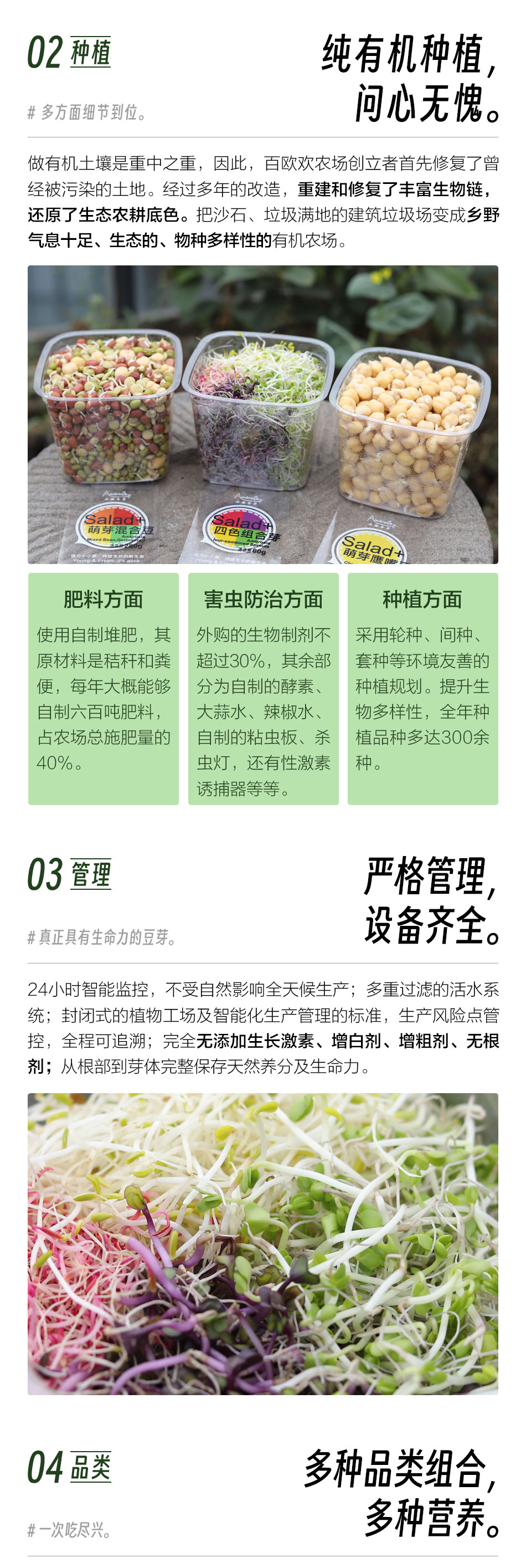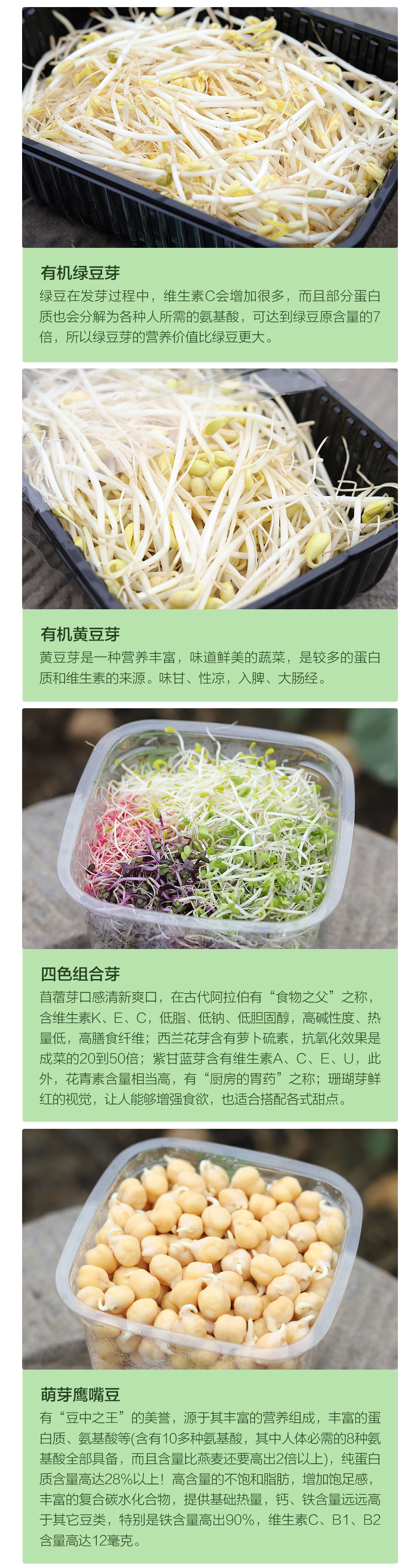 【生产者】:百欧欢有机农场 【规格】:黄豆芽200g/盒+绿豆芽200g/盒+四色组合芽60g/盒+混合萌芽豆280g/盒+萌芽鹰嘴豆280g/盒 【产地】:上海市浦东新区川沙新镇川沙路 【种植方式】:豆子有机种植,发芽过程中不使用任何化学激素处理 【生产日期】:见包装 【保质期】:4天 【储存方式】:冷藏