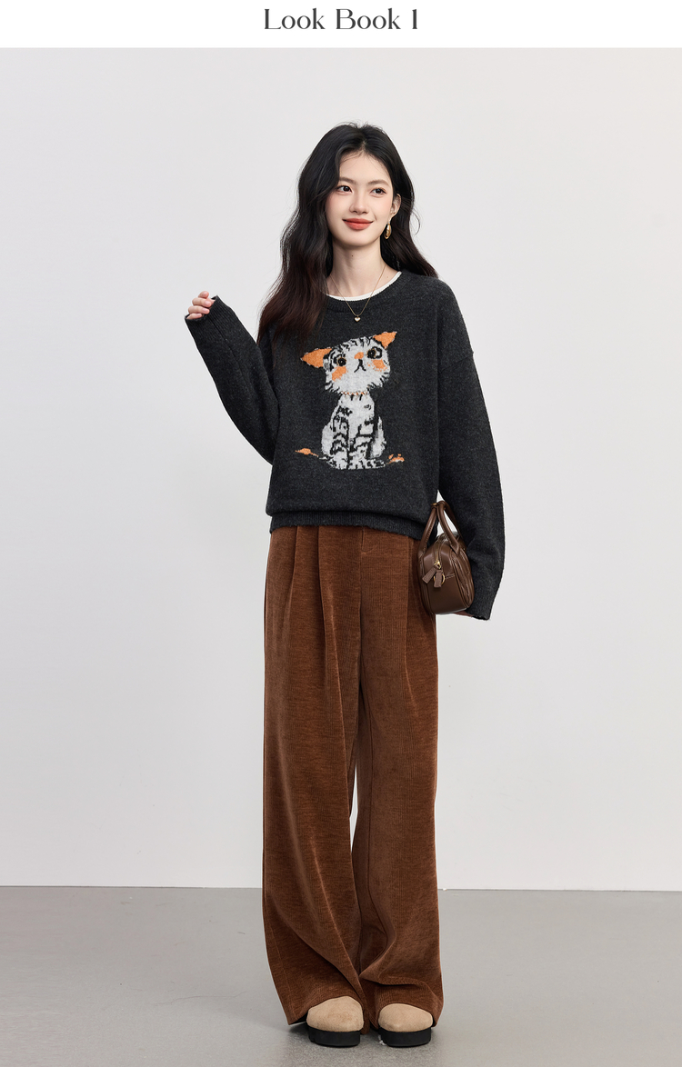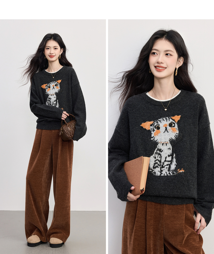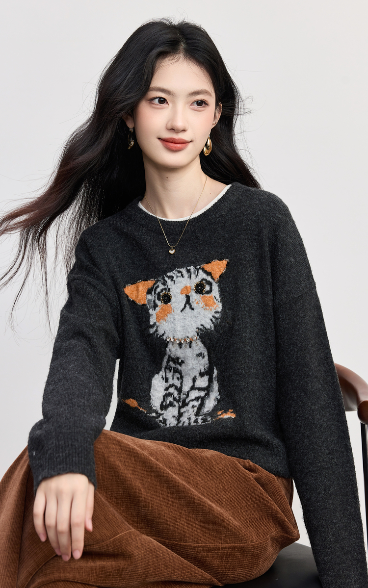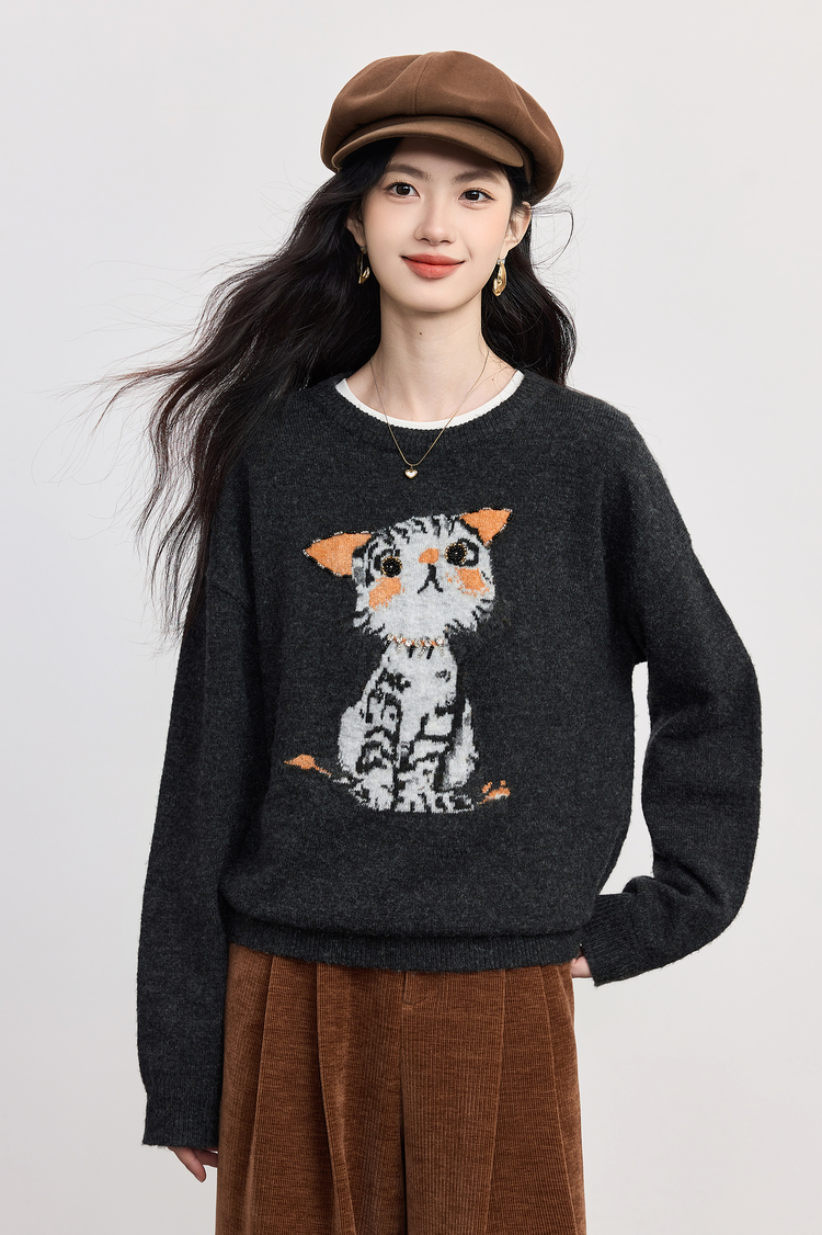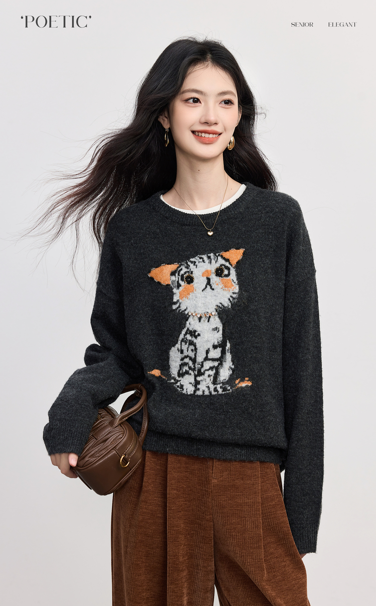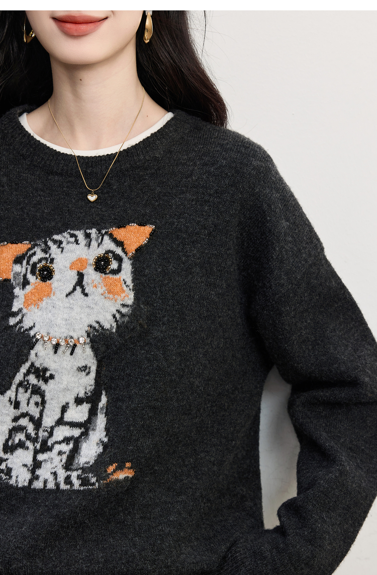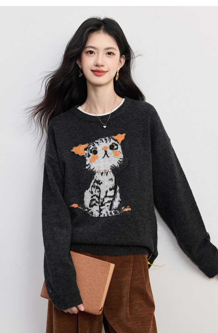 【周末秒杀】熙世界可爱猫咪提花毛衣女秋冬2025新款宽松长袖圆领仿牛绒针织衫