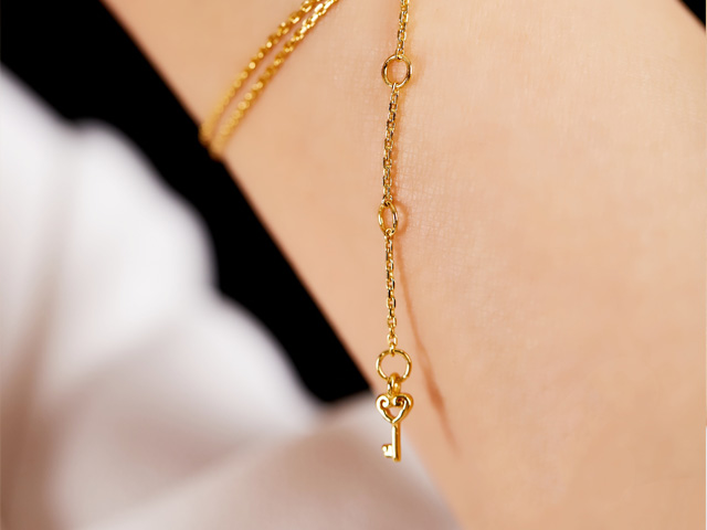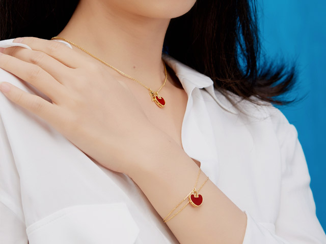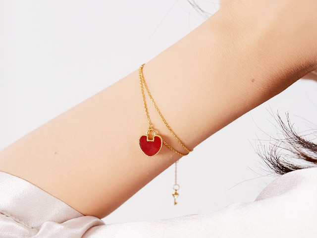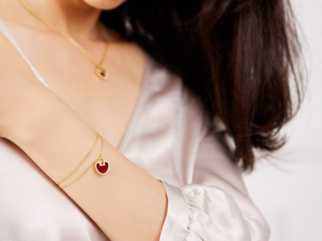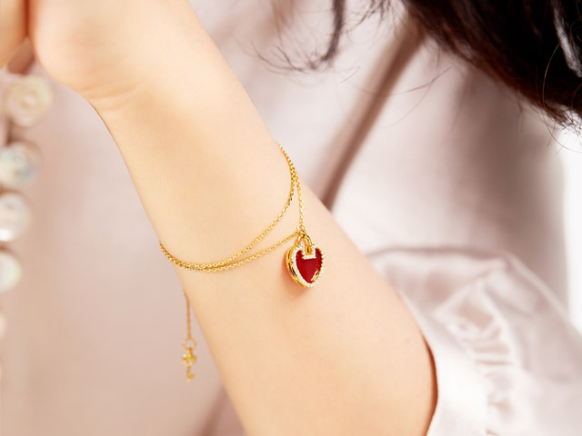 外观整体如一颗红心,灵活的锁扣让它随动作轻轻跳动在胸前,再与如意形态的小钥匙交相呼应,仿若与Ta初见时的怦然心动。