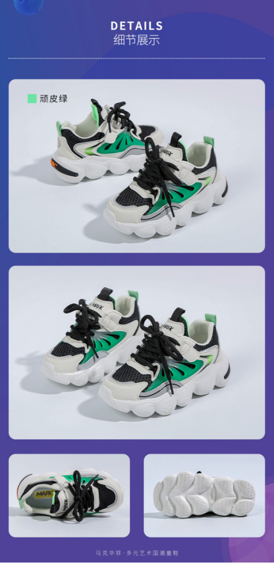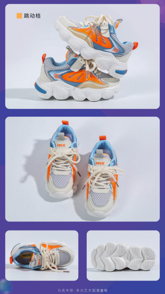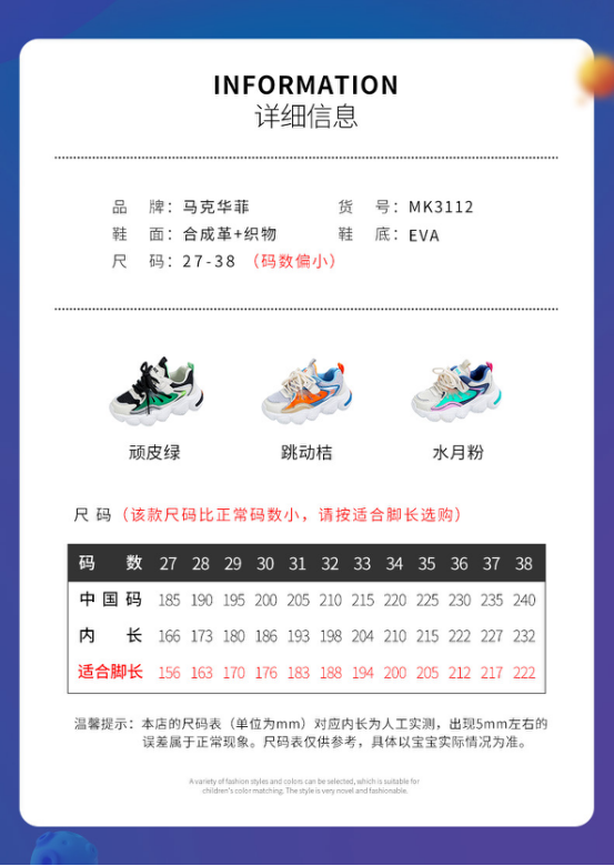 马克华菲23年春季新品童鞋MK3112 品牌:马克华菲 规格:27-38码(码数偏小) 颜色:顽皮绿/跳动桔/水月粉3色可选 材质:合成革+织物+EVA 跟高:3cm 帮高:5cm 产地:福建泉州 发货地:福建泉州 发货快递:圆通快递/丰网速运/中通快递/韵达快递随机发 发货时长:72小时 不发货地区:港澳台、海外 售后说明:在不影响二次销售的情况下,支持7天无理由退换货,非产品本身质量问题需要客户自行承担运费