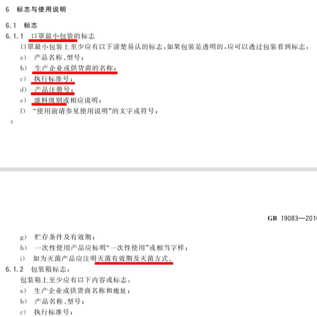 标准中【6 标志与说明】明确规定,单只口罩要有齐全标志,注明相关信息。
