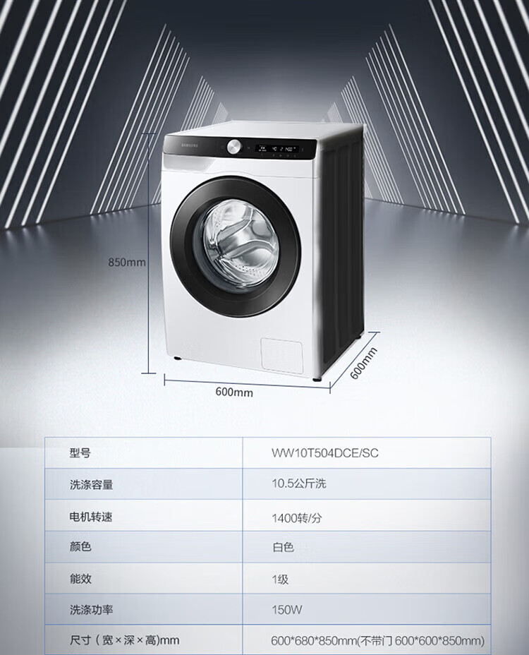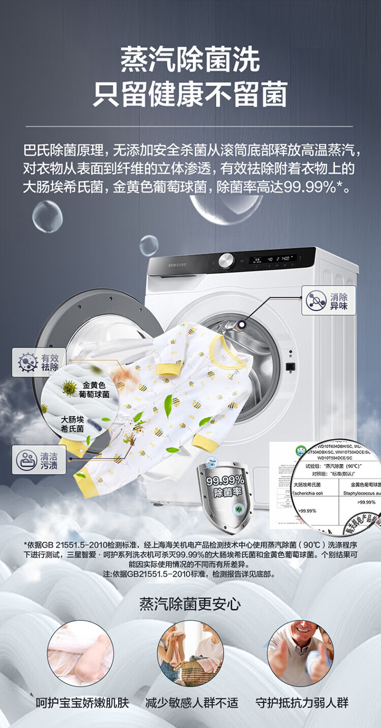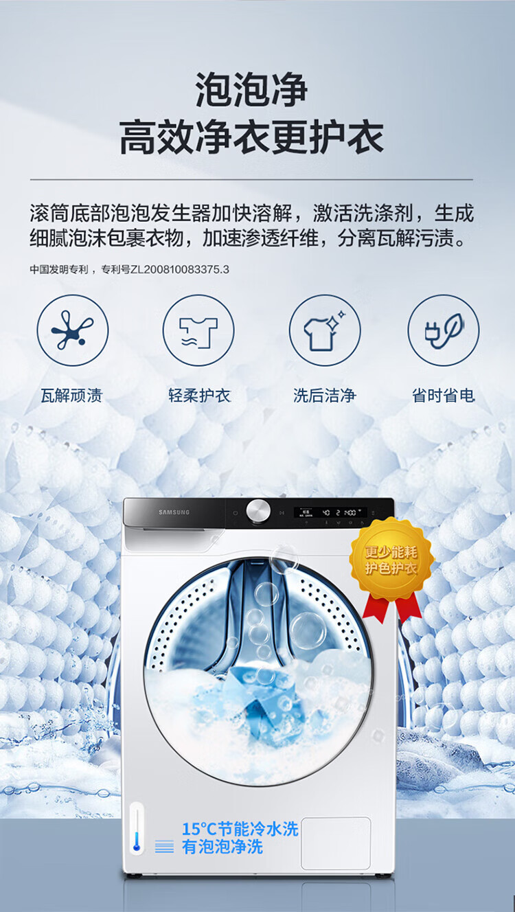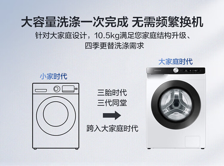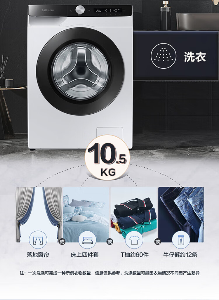 【年终燃购】三星(SAMSUNG)10.5公斤滚筒洗衣机 蒸汽除菌 高温桶自洁 15分钟快洗 泡泡净洗10公斤洗衣机