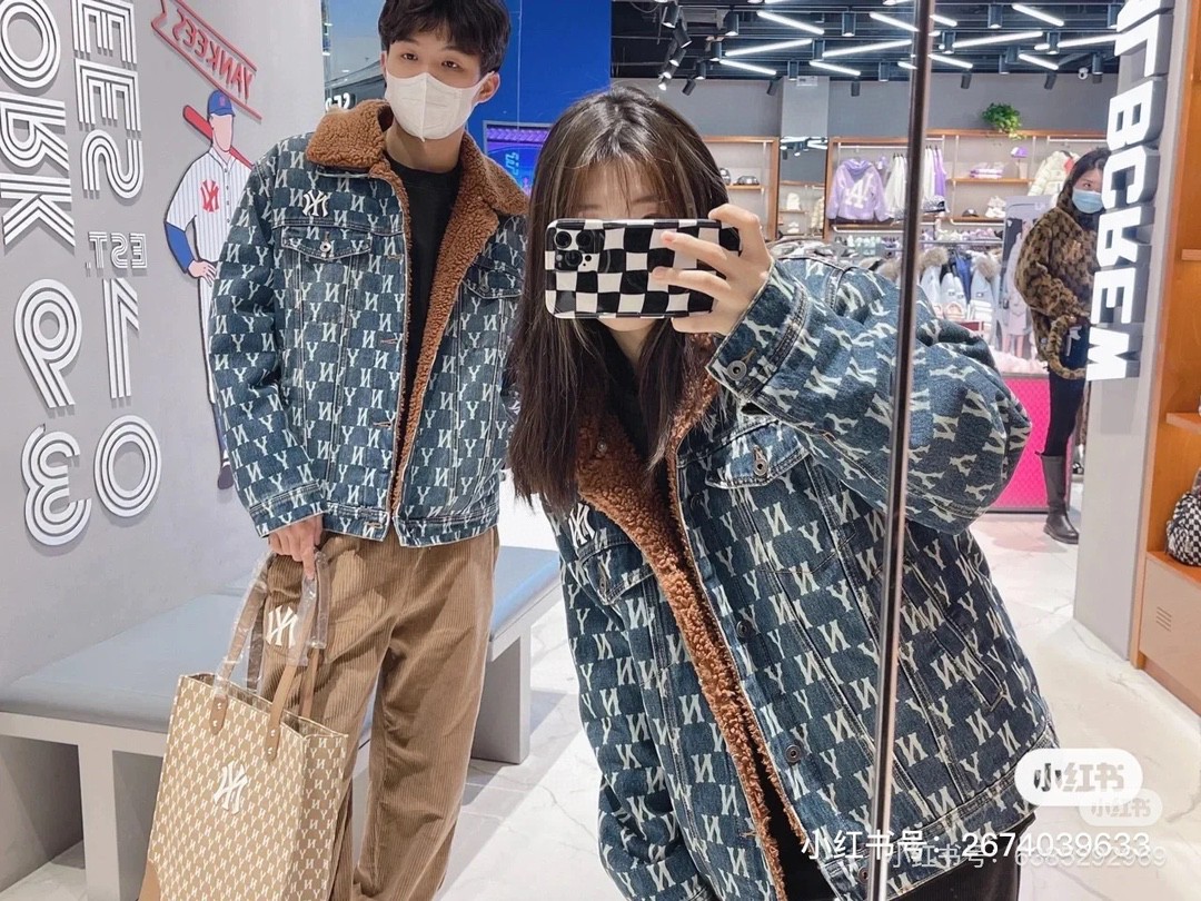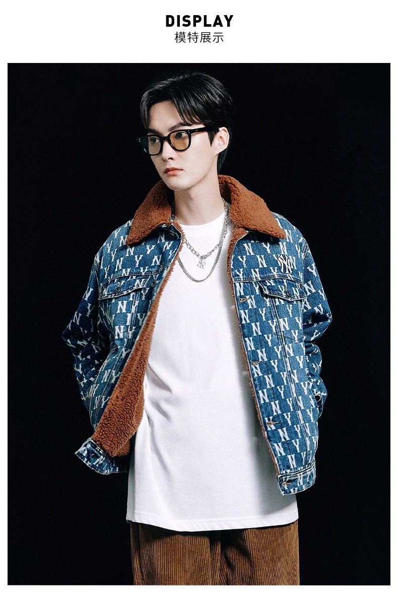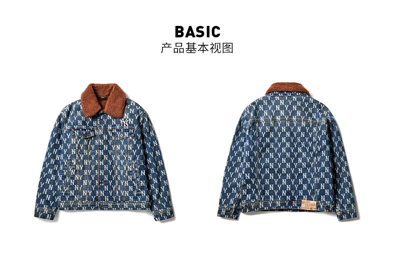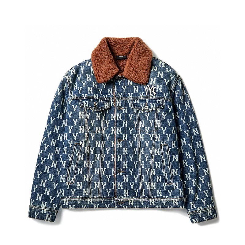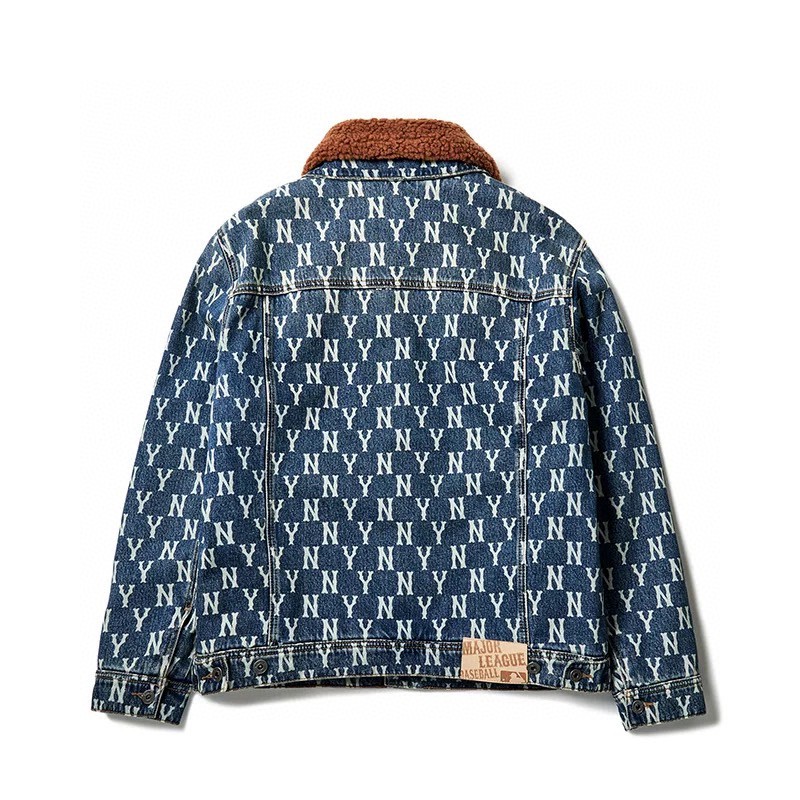MLB 男女情侣复古老花羊羔绒牛仔外套