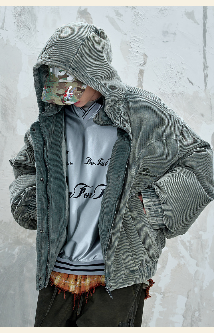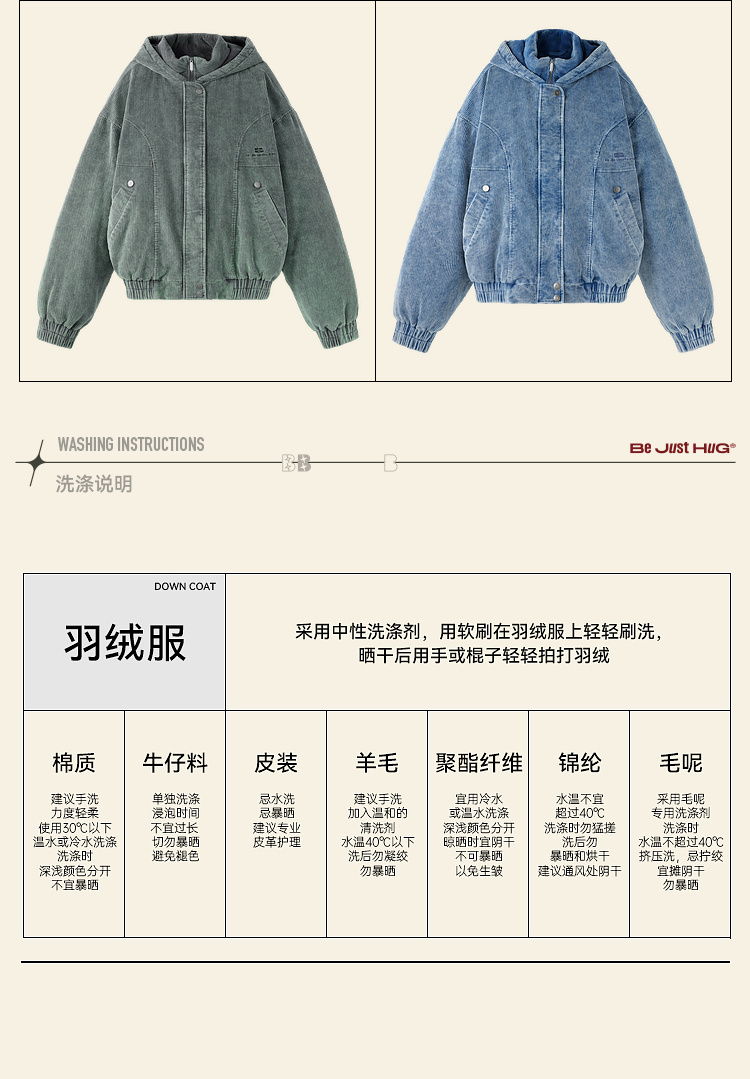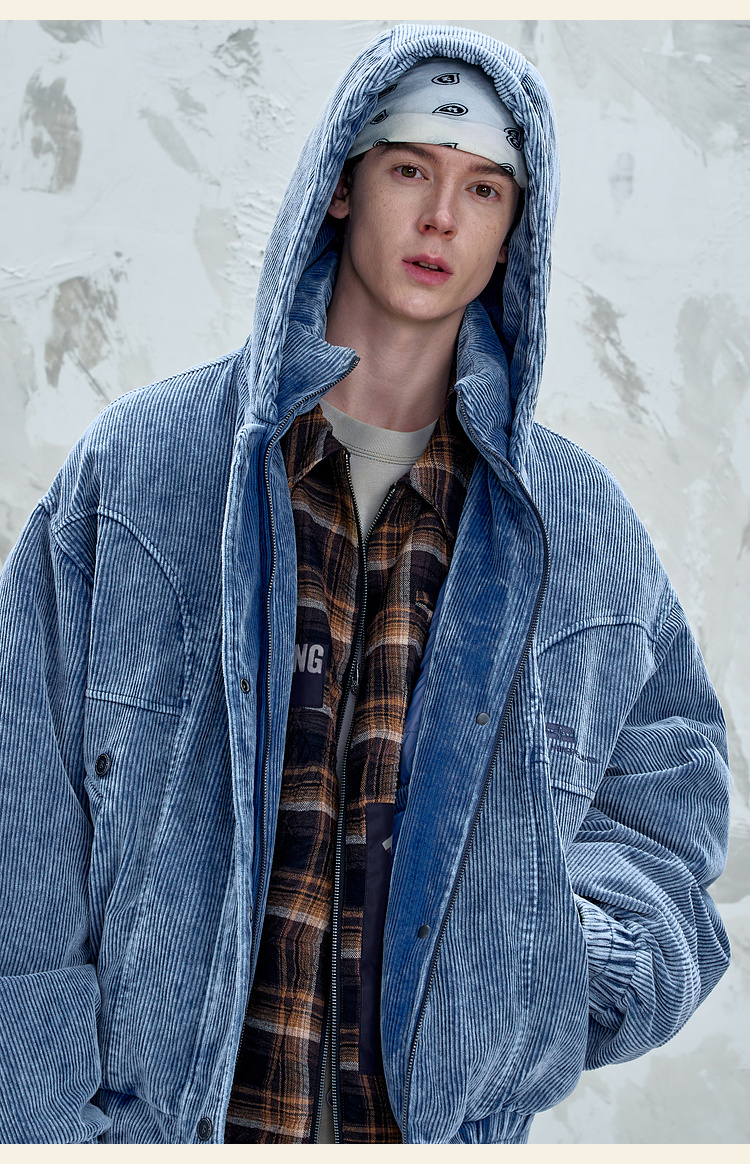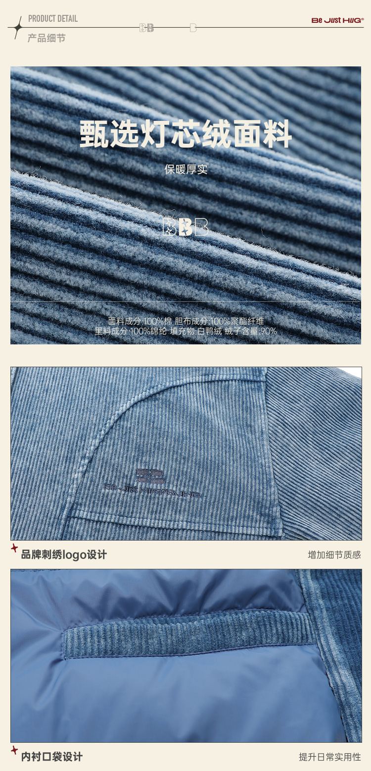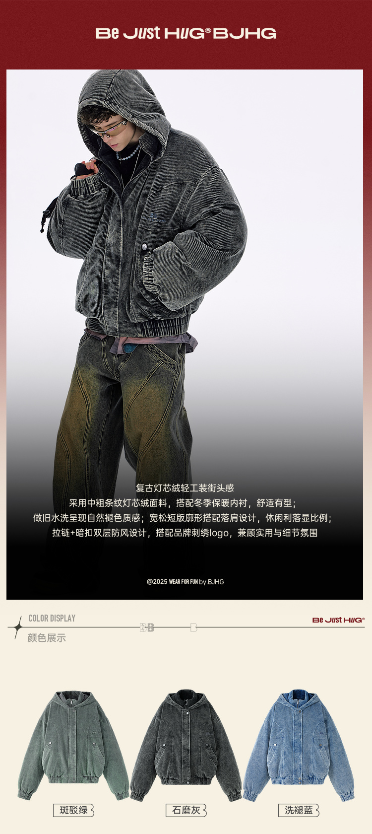BJHG不计后果灯芯绒羽绒服男款冬季宽松连帽复古巴恩风羽绒服外套